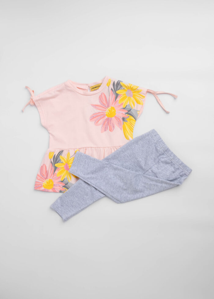 Kids girl suit, two-pieces, blouse, floral, round neck, shirt sleeves with tie, pleated waist, leggings, plain, elastic waist, unique and modern