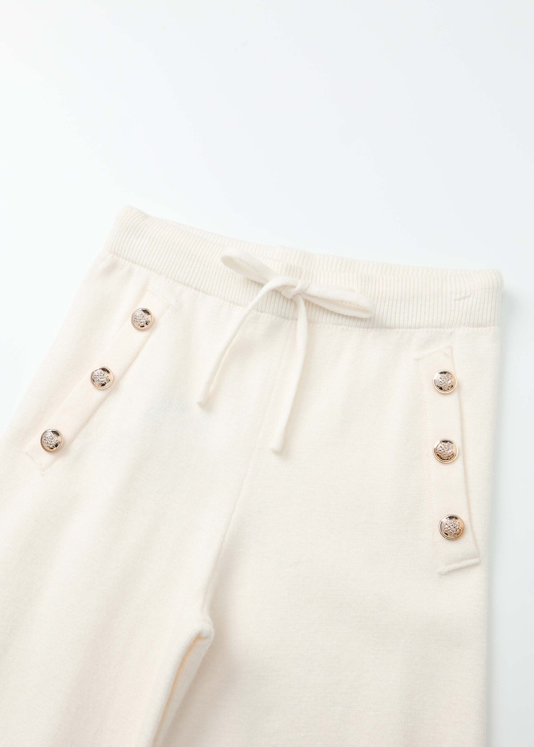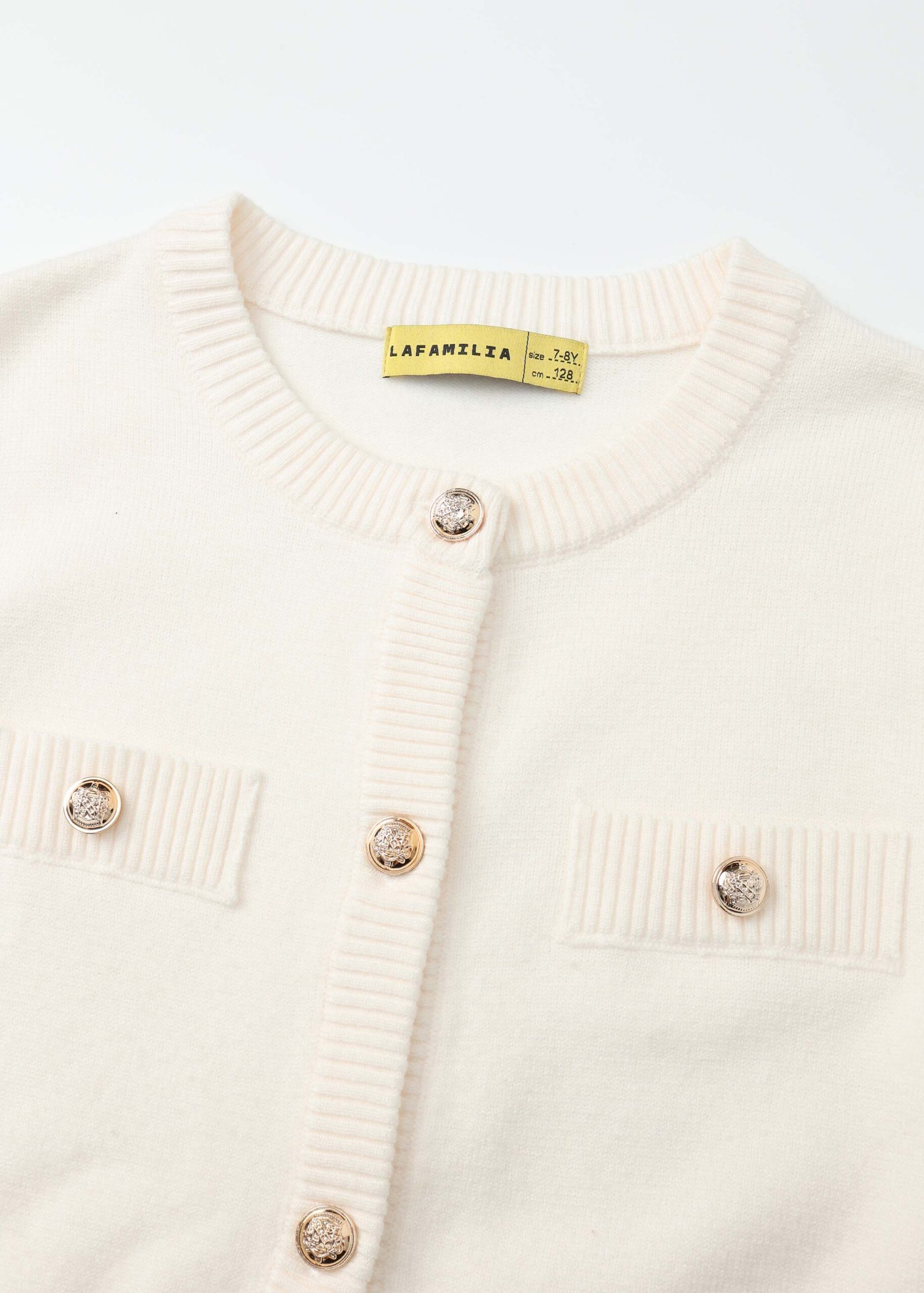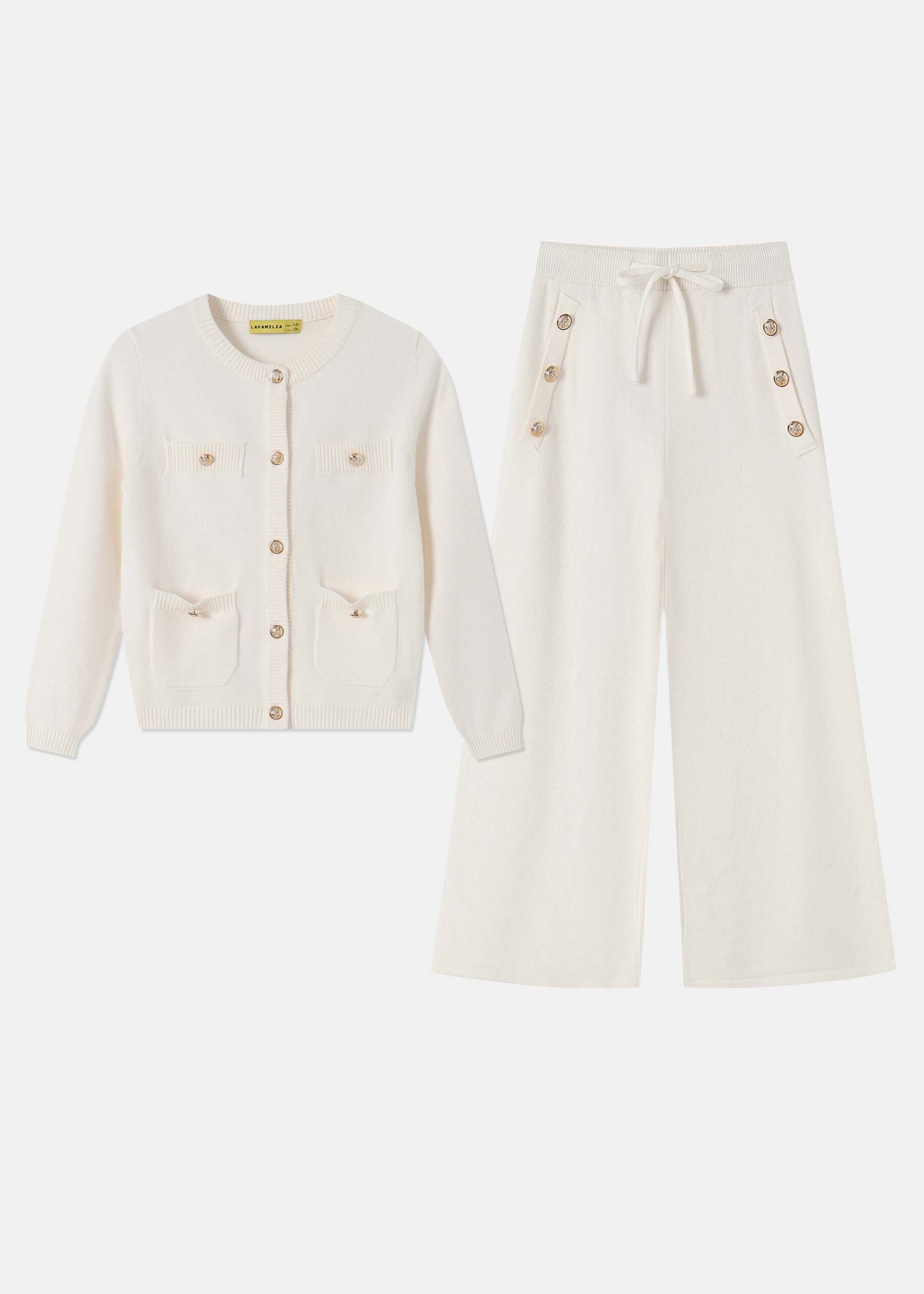 Kids girl suit, two-pieces, knitted fabric, jacket, plain, round neck, front buttons to close, long sleeves, front pockets, trouser, flow, elastic waist with front tie, front pockets with buttons decor, unique and modern