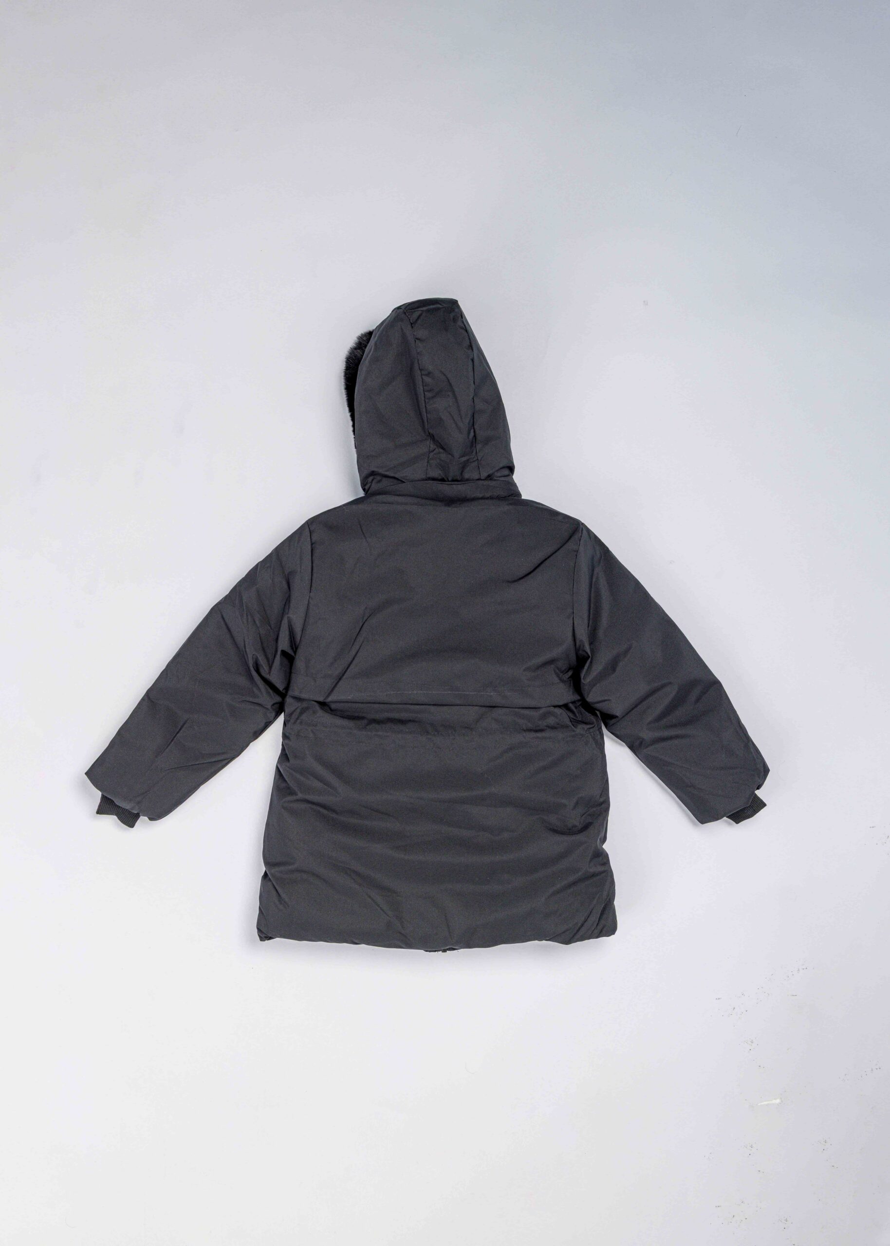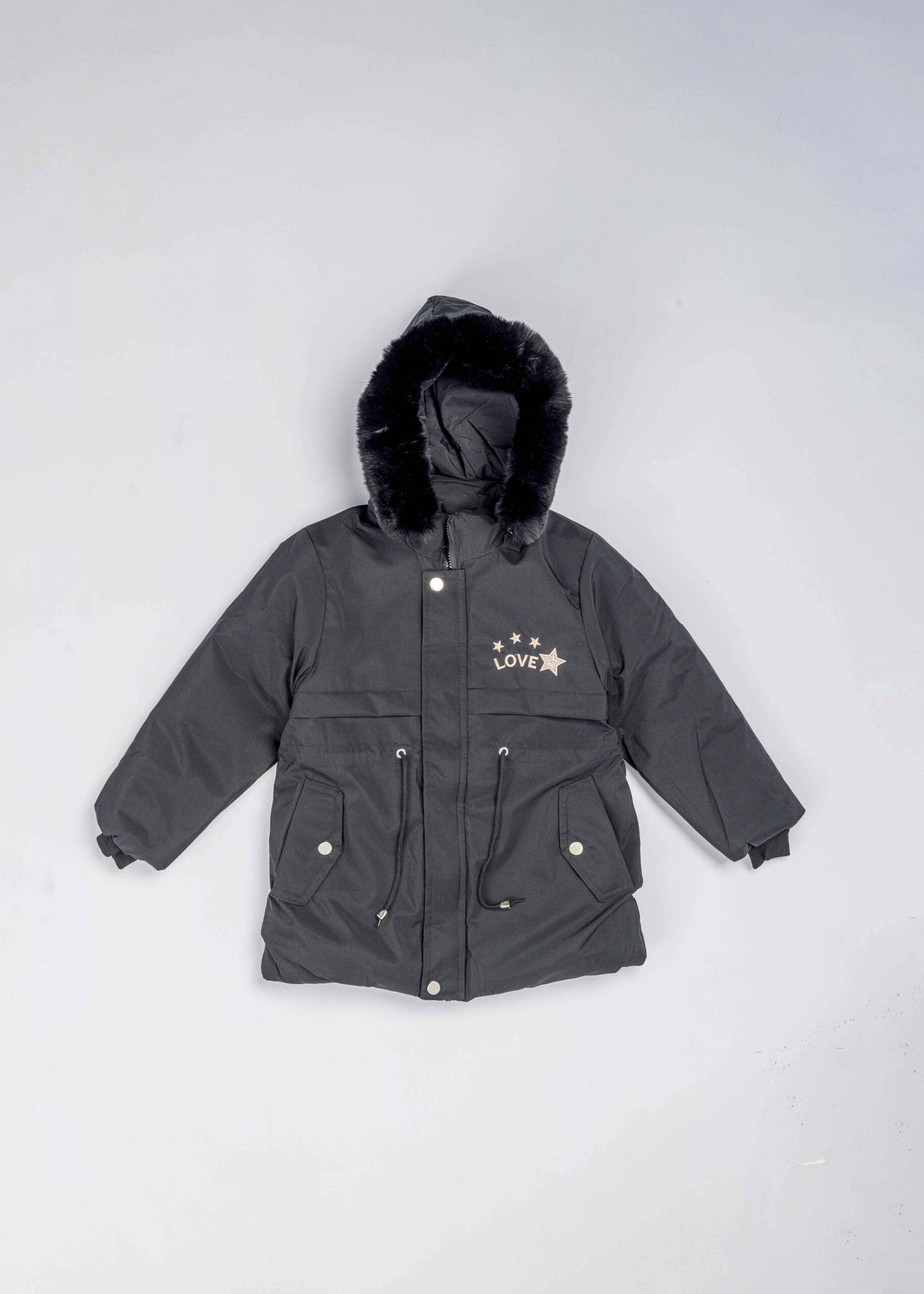 Kids girl jacket, waterproof, elastic waist, hood with fur, front buttons and zipper closure, long sleeves with elastic cuff, front pockets, unique and warm