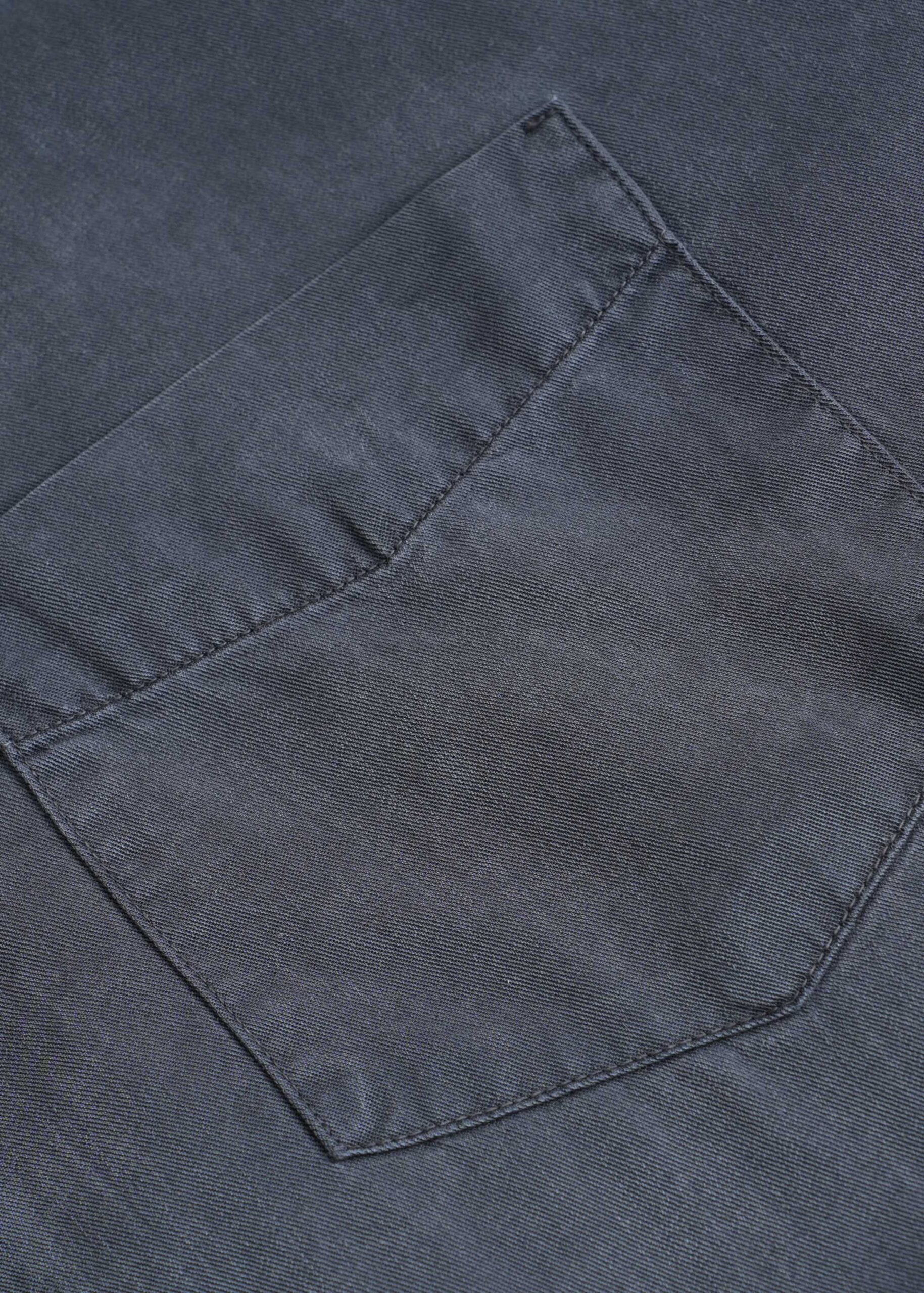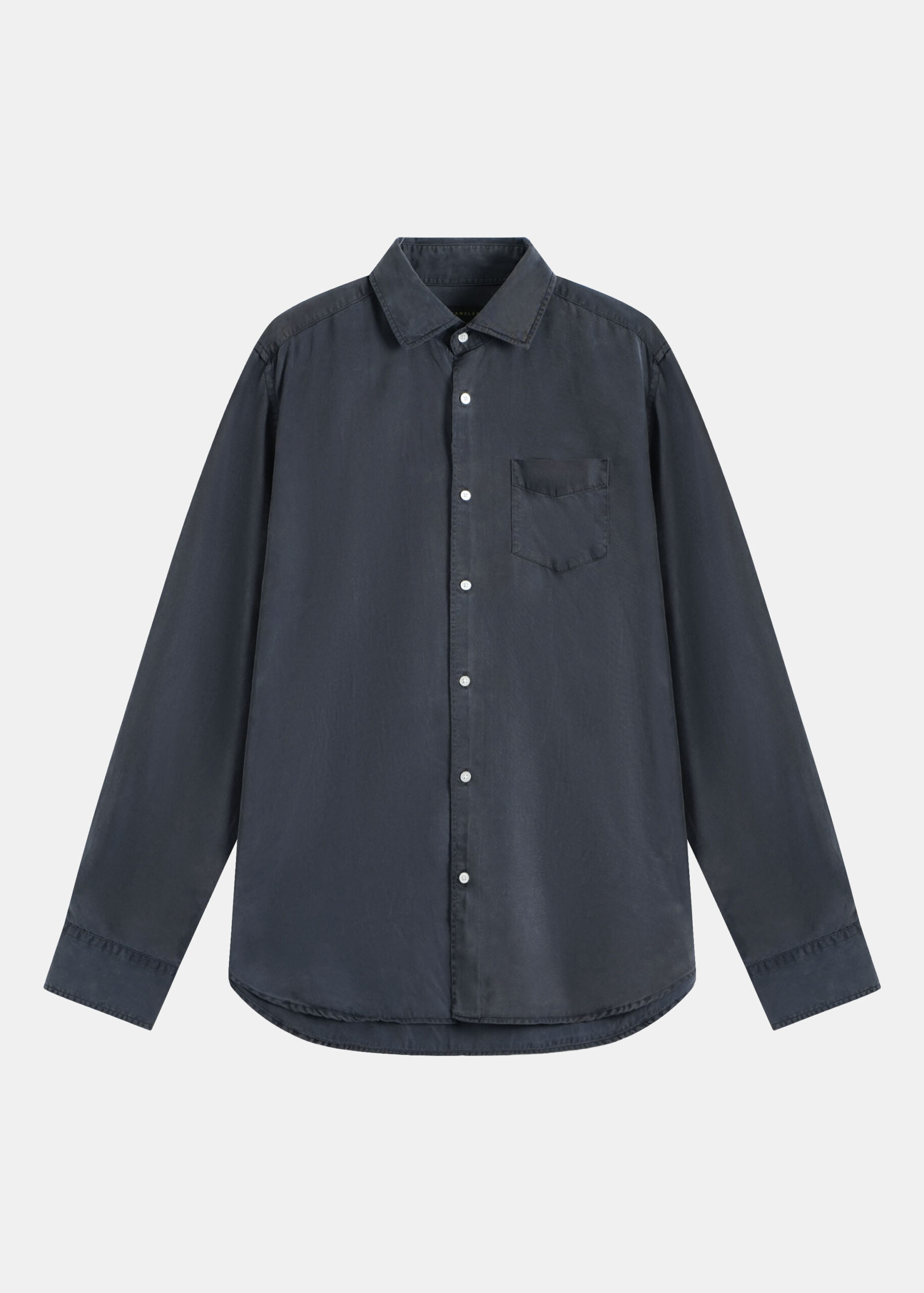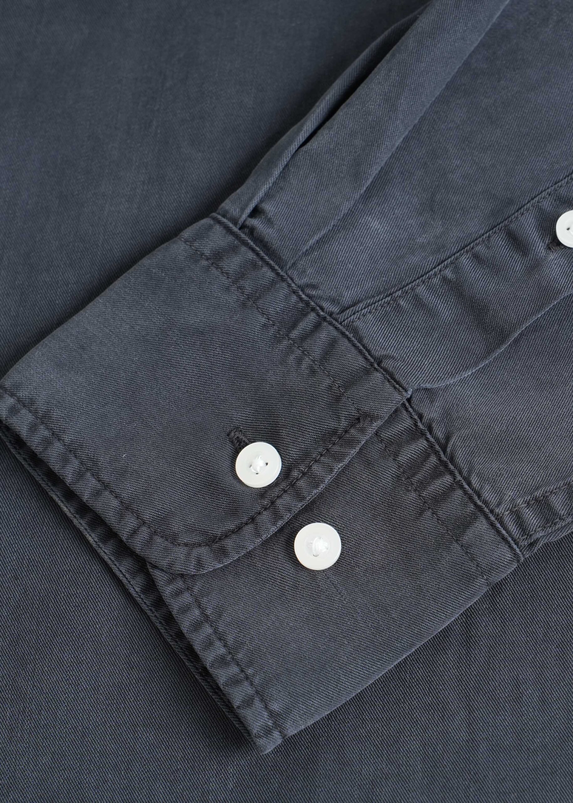 Men shirt, denim, plain, rolled collar, front buttons to close, long sleeves with buttoned cuffs, chest pocket, unique and modern