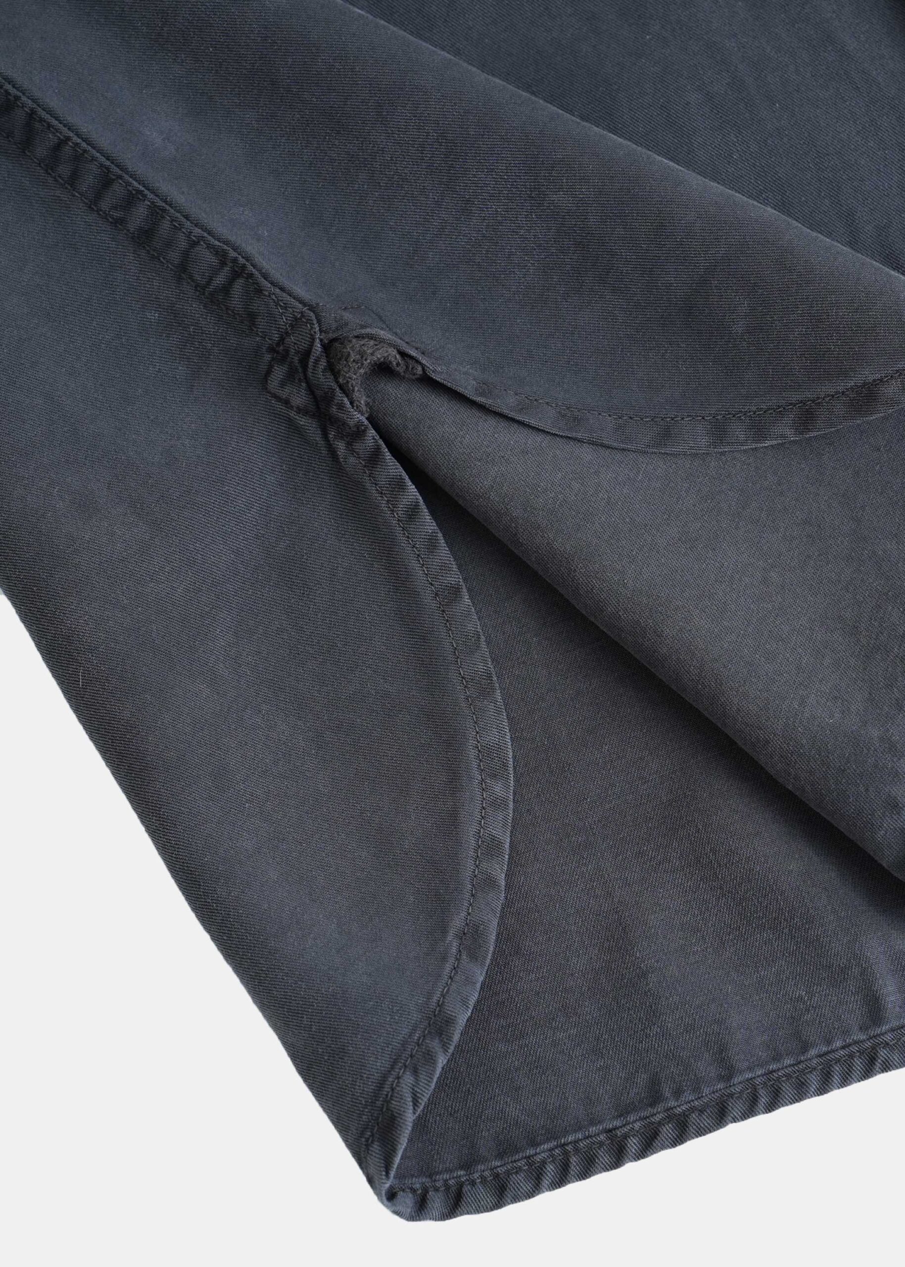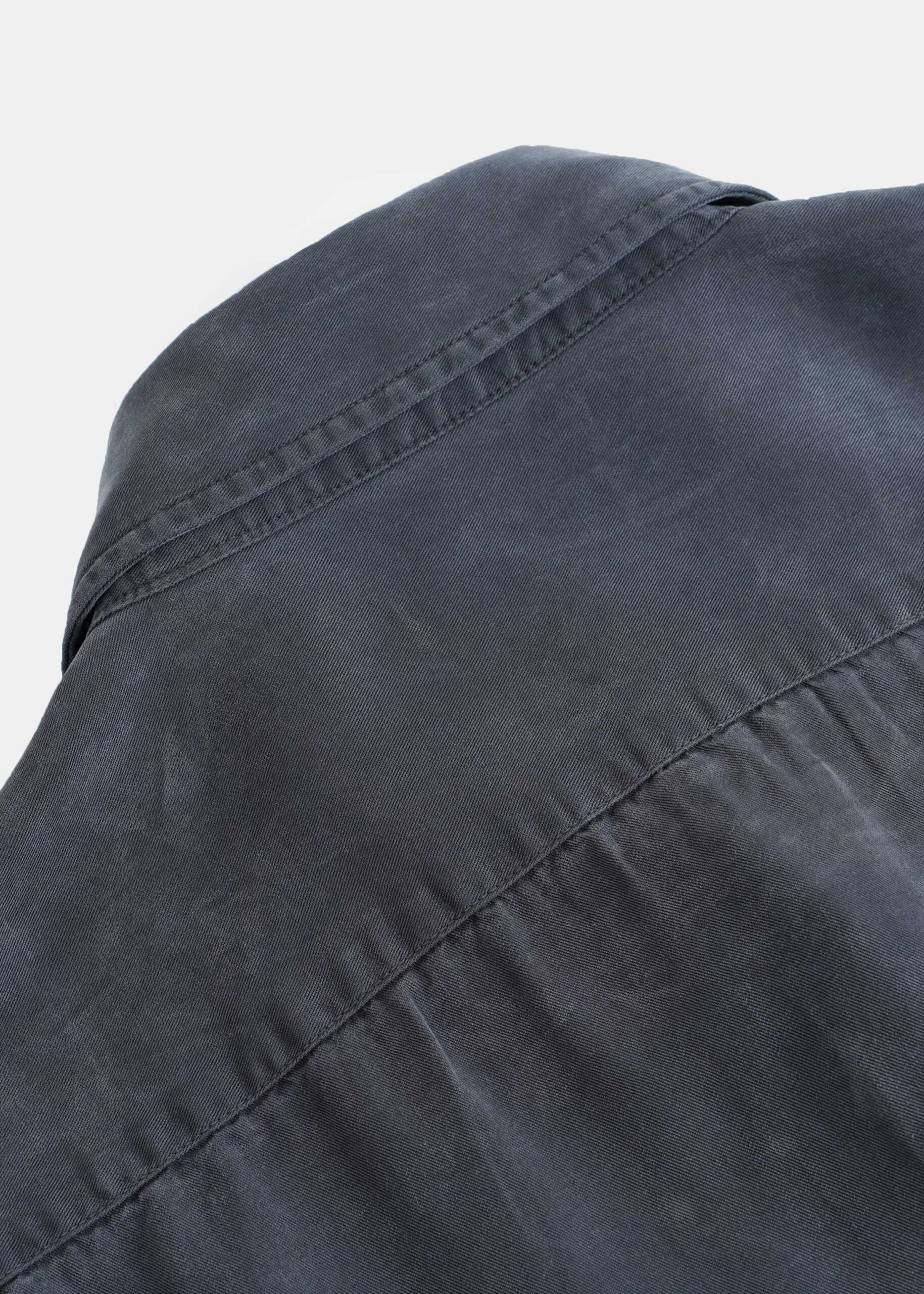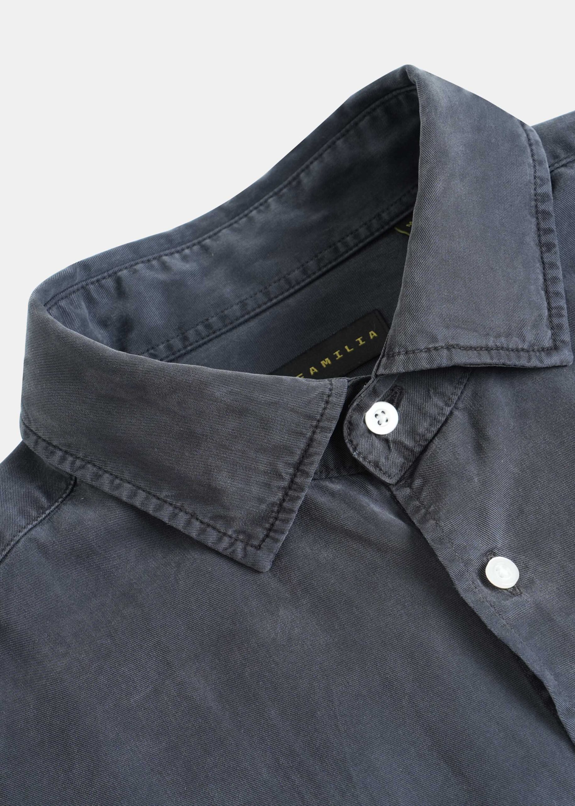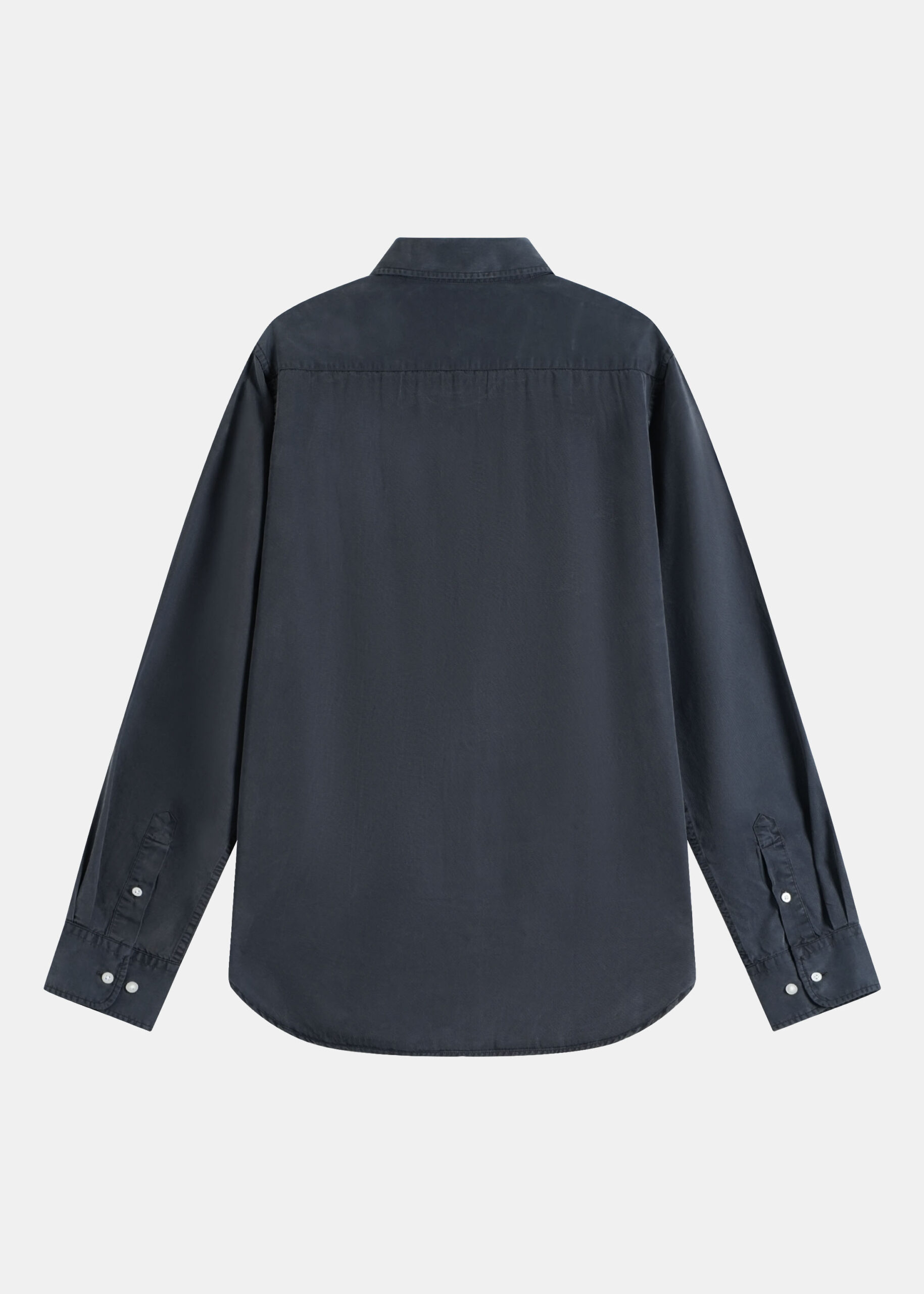 Men shirt, denim, plain, rolled collar, front buttons to close, long sleeves with buttoned cuffs, chest pocket, unique and modern