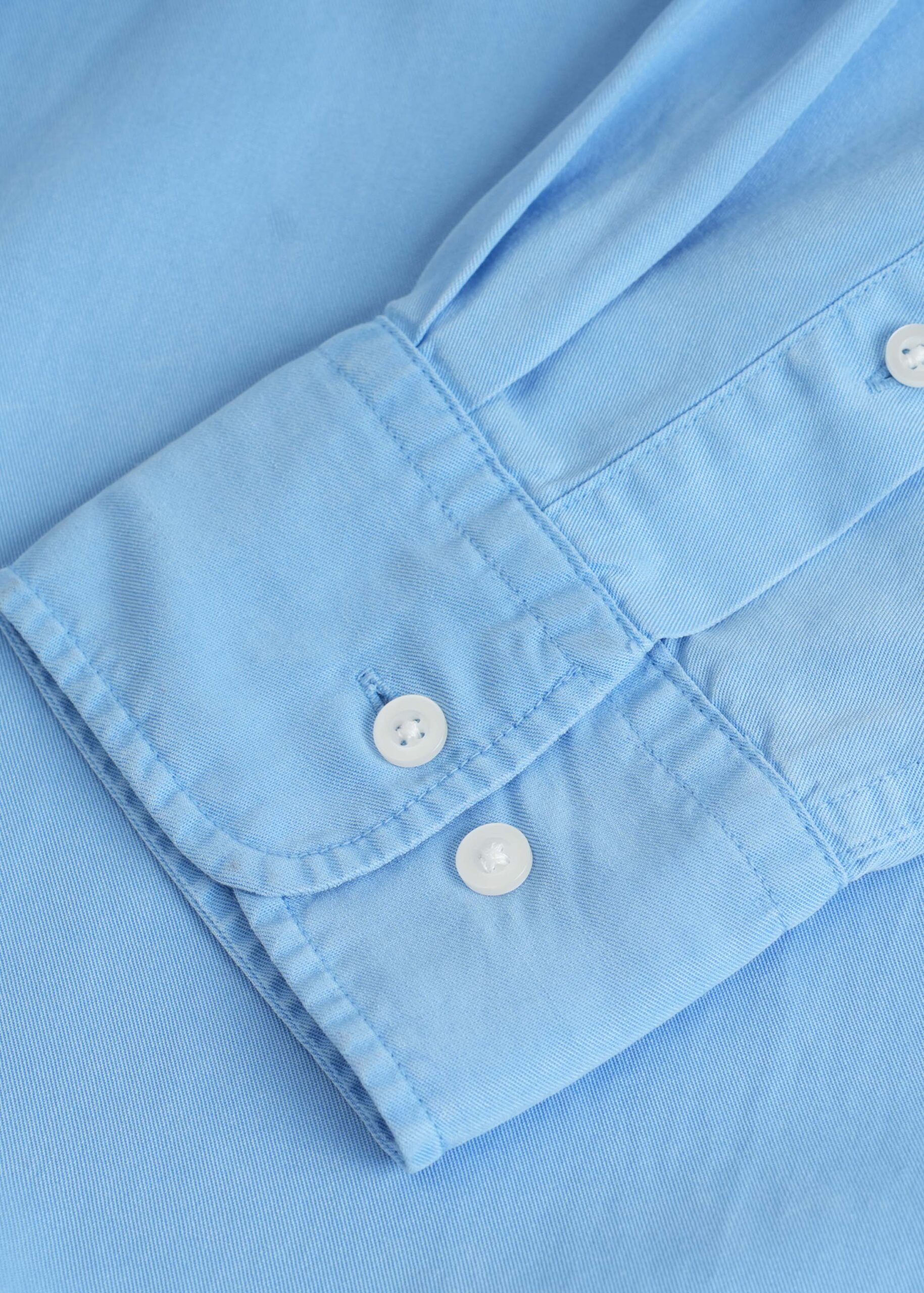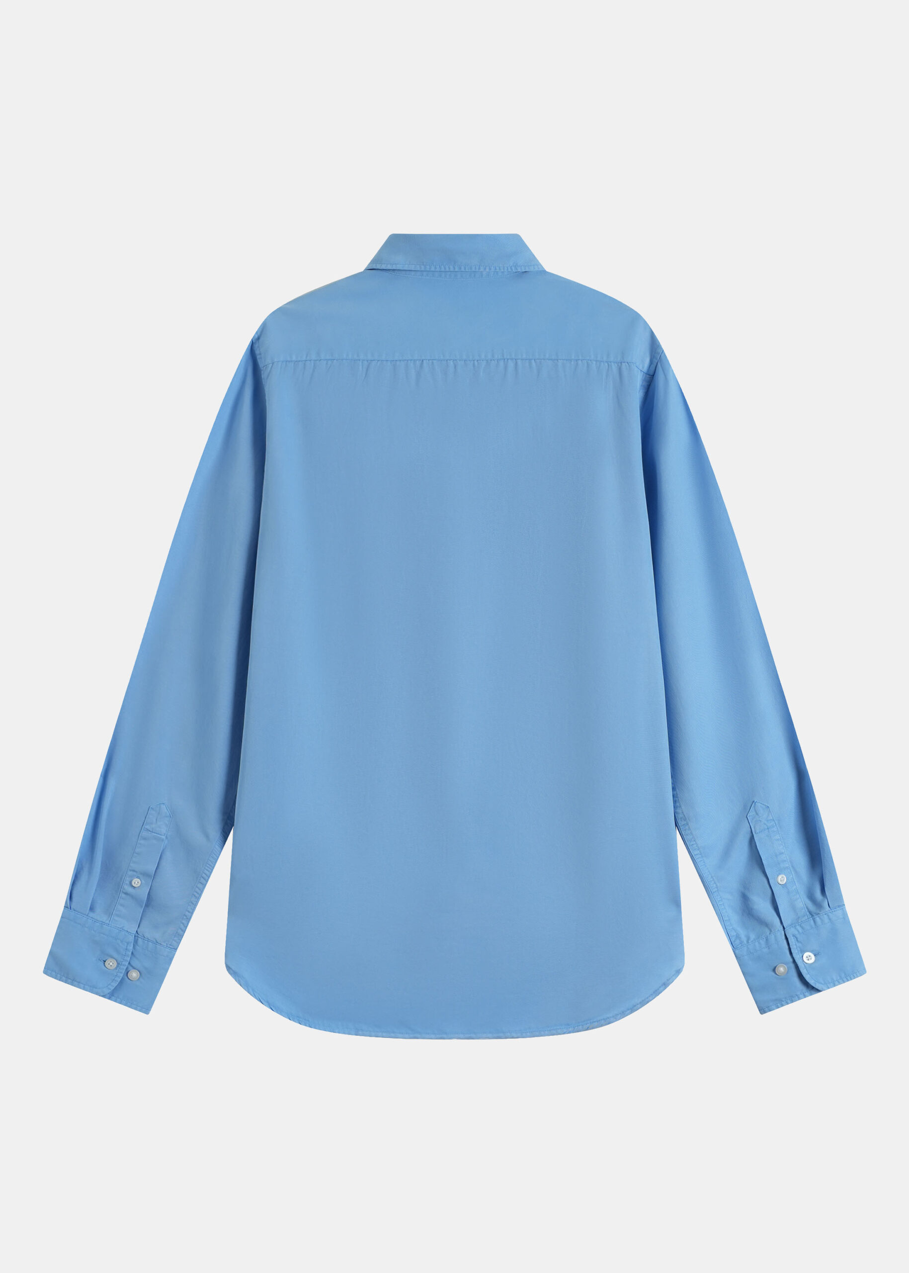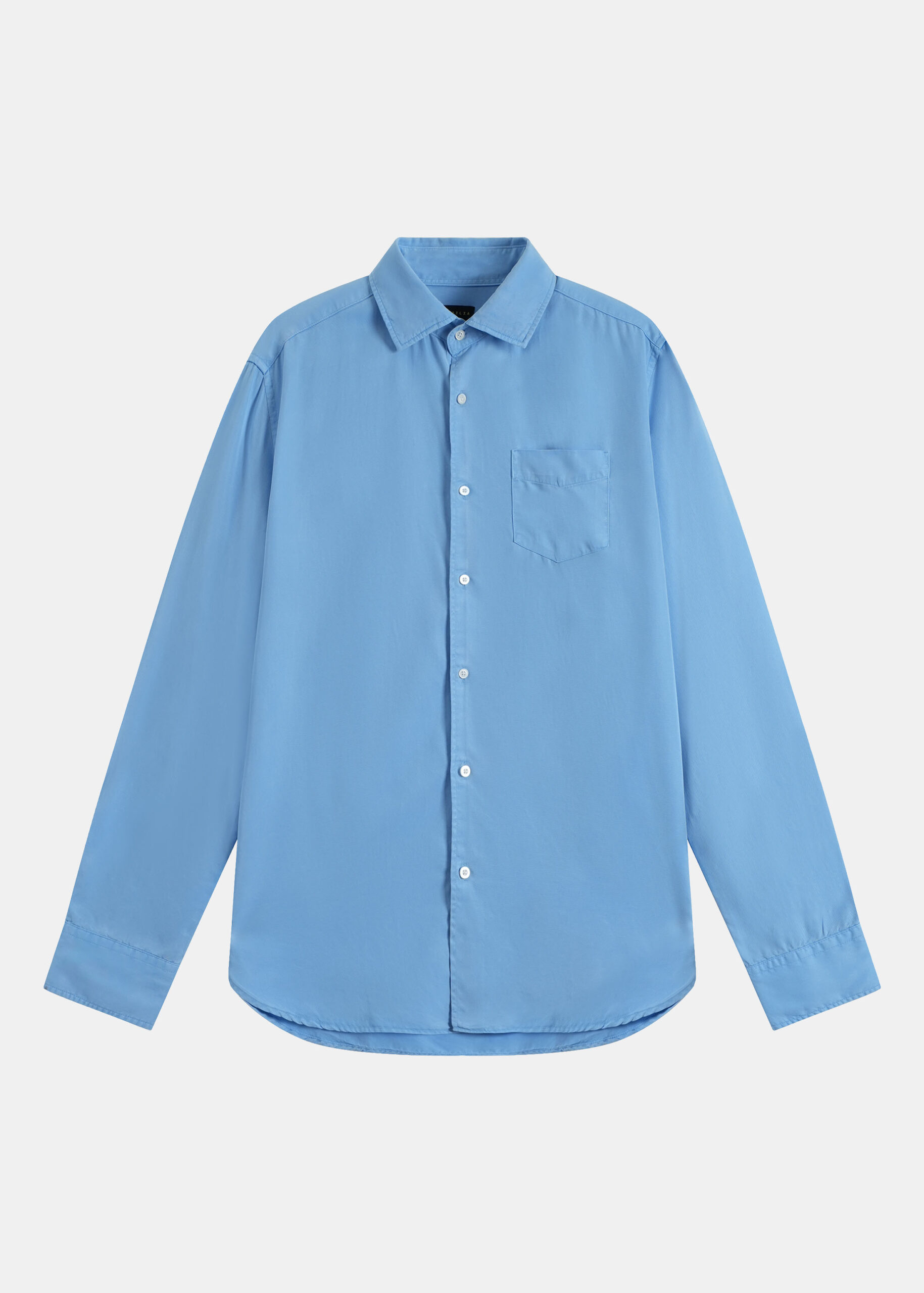 Men shirt, denim, plain, rolled collar, front buttons to close, long sleeves with buttoned cuffs, chest pocket, unique and modern