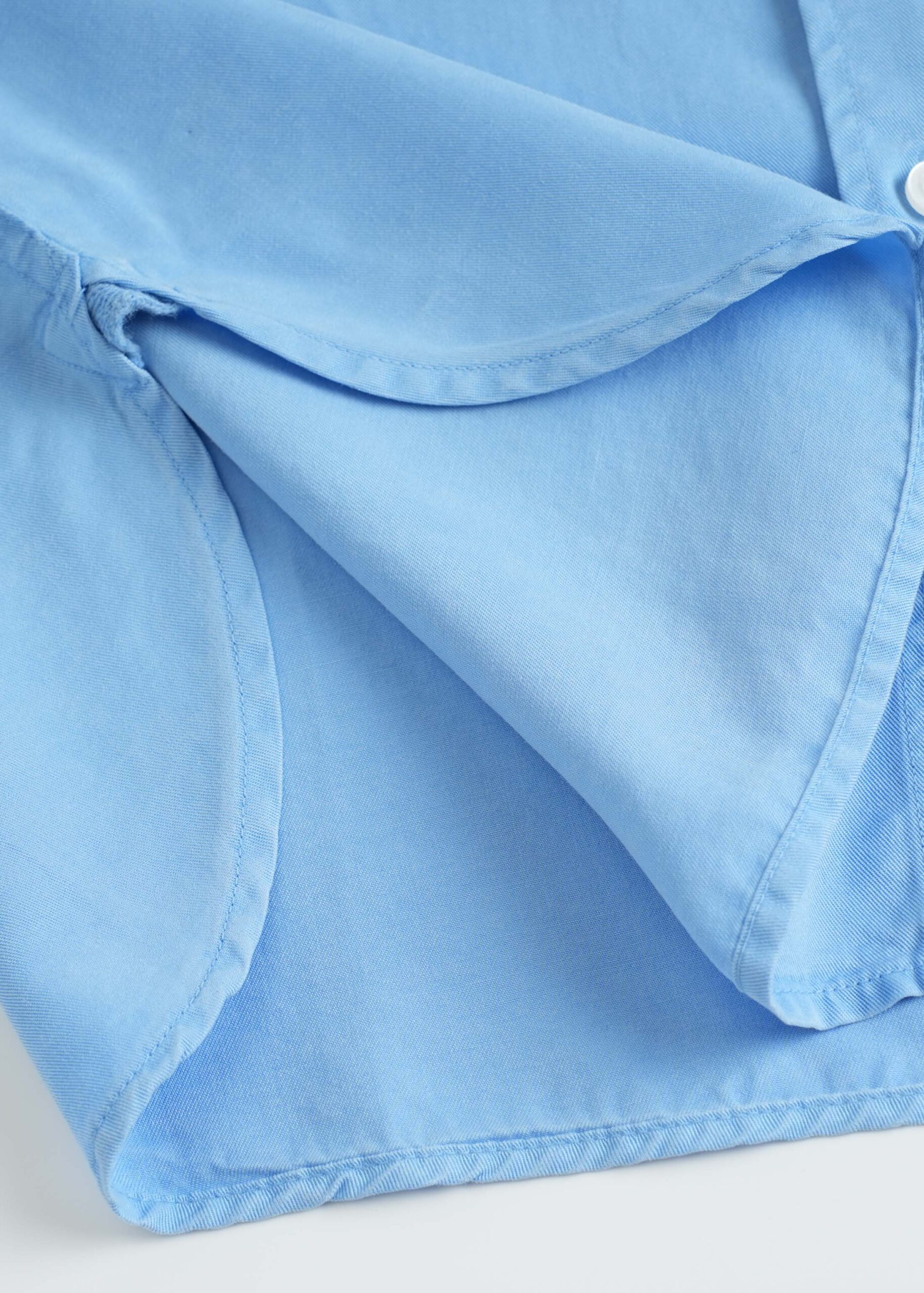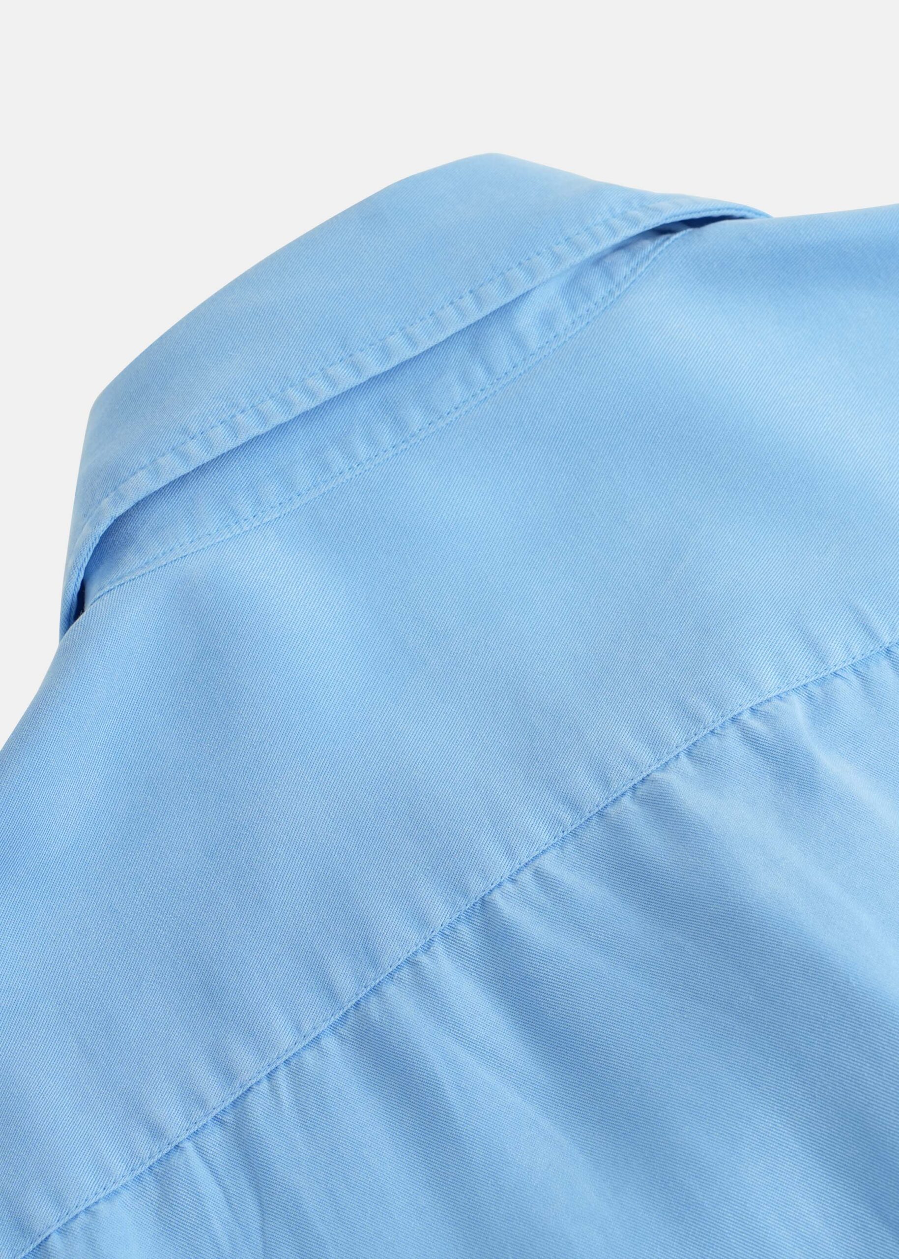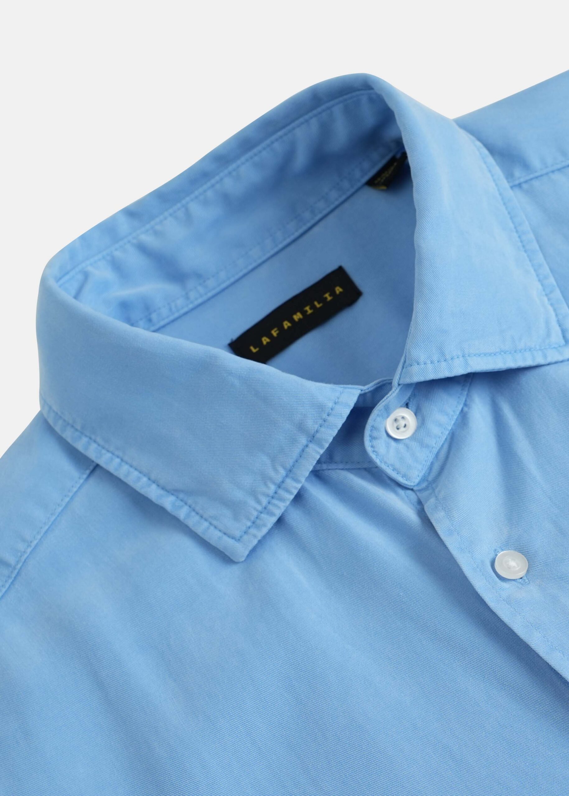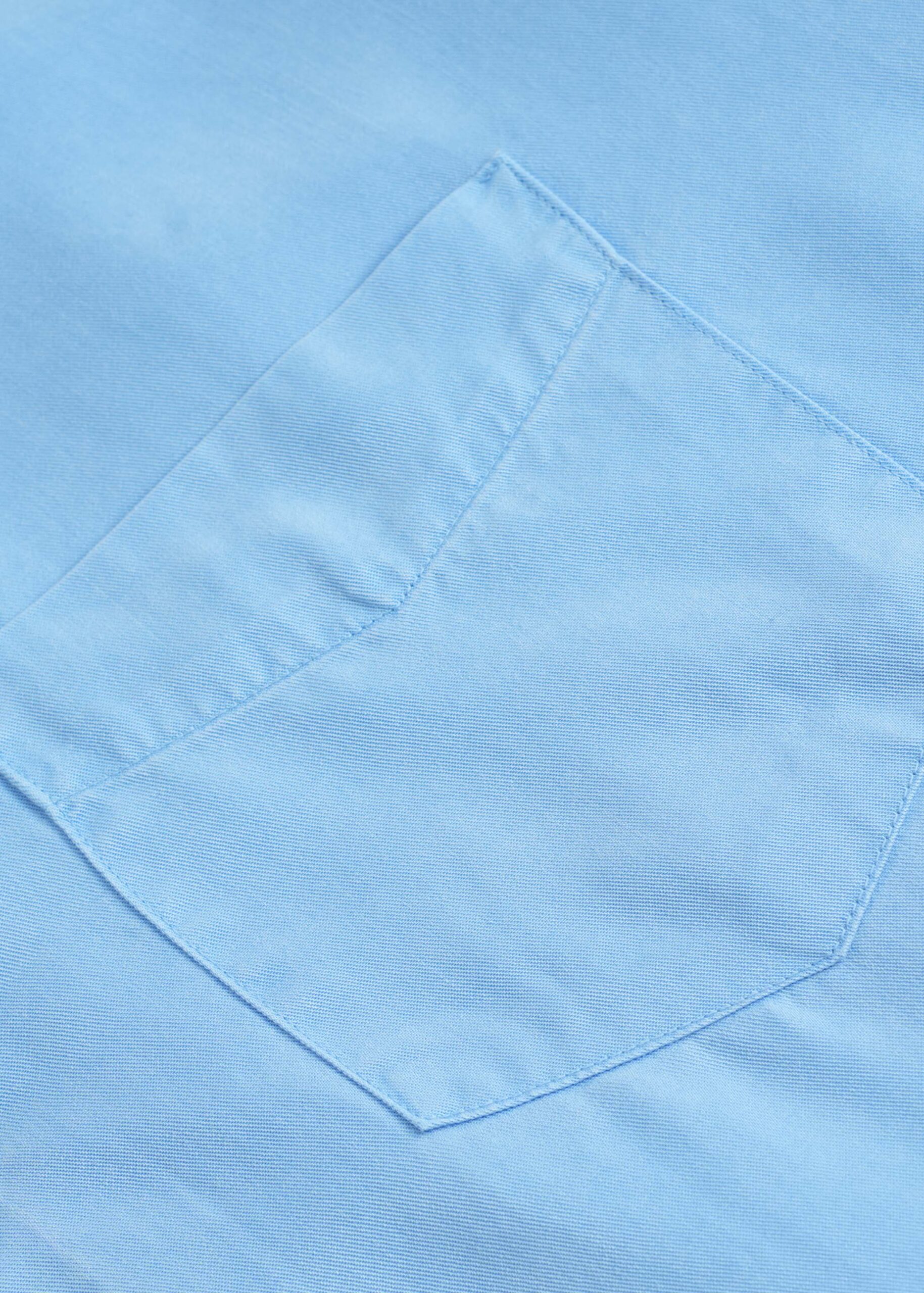 Men shirt, denim, plain, rolled collar, front buttons to close, long sleeves with buttoned cuffs, chest pocket, unique and modern