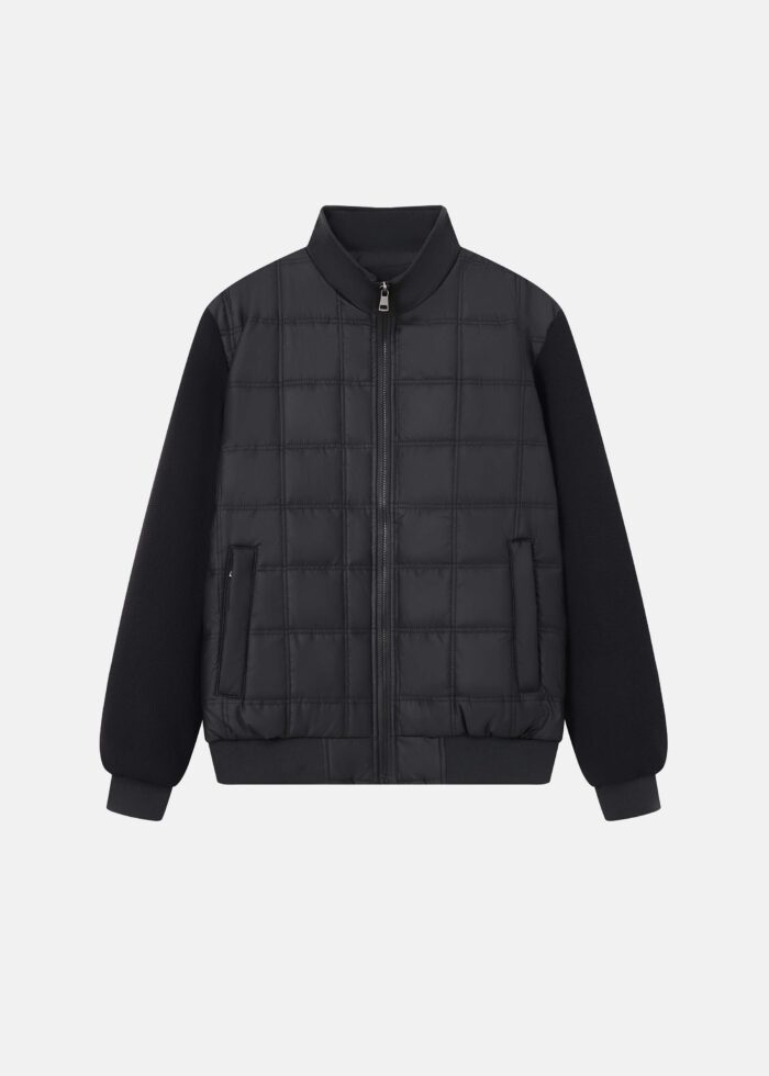 Men jacket, mixed fabric, padded design, stand collar, front zipper closure, long sleeves with tight cuff, front pockets, unique and modern