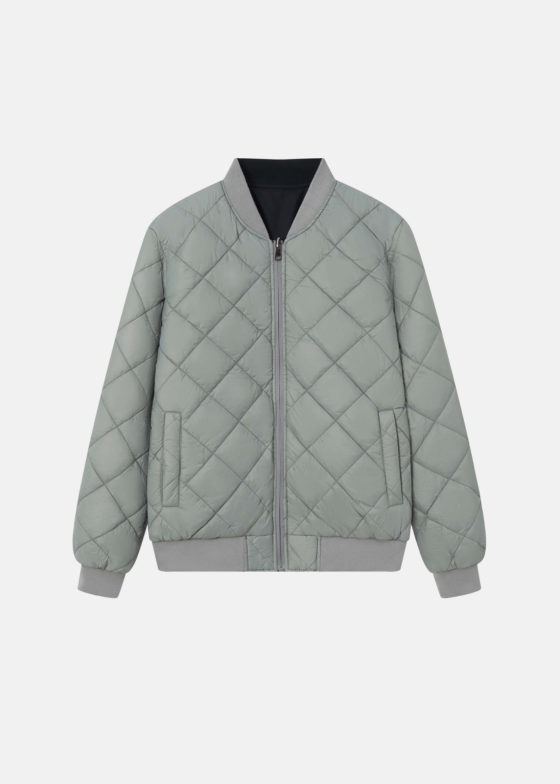 Men jacket, reversible, two-tone, padded side, plain side, front pockets, front zipper closure, long sleeves with tight cuff, warm and practical