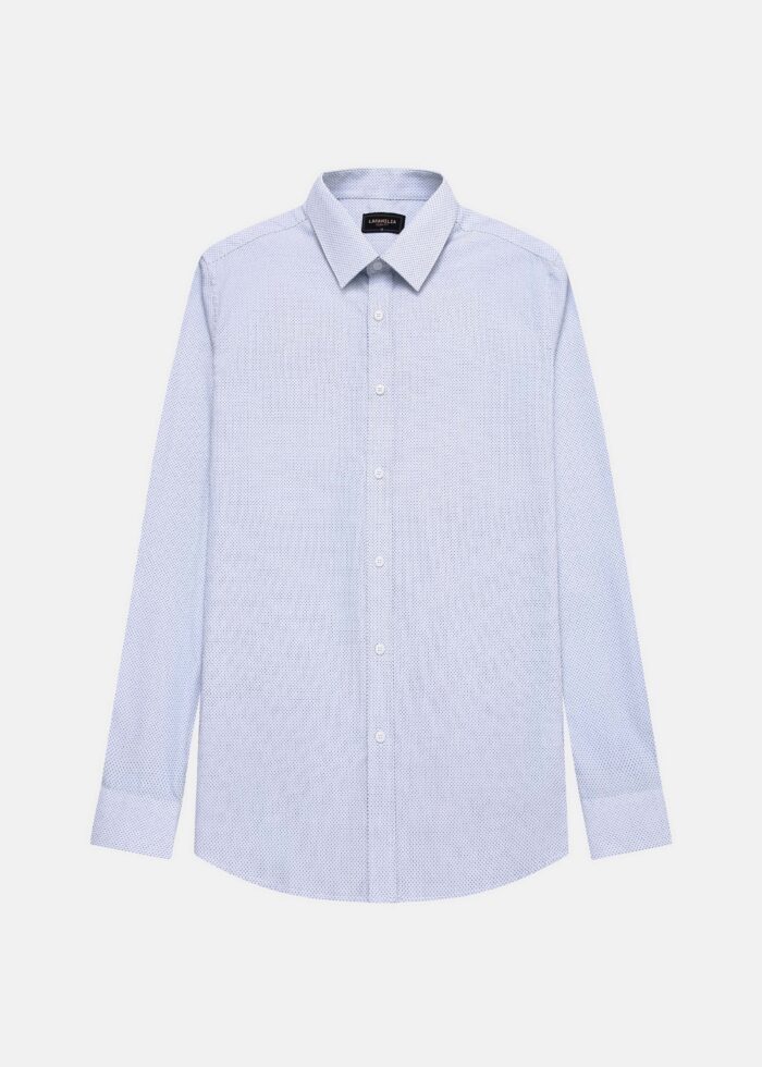 Men shirt, slim-fit, patterned, rolled collar, front buttons to close, long sleeves with tight cuff, unique and modern