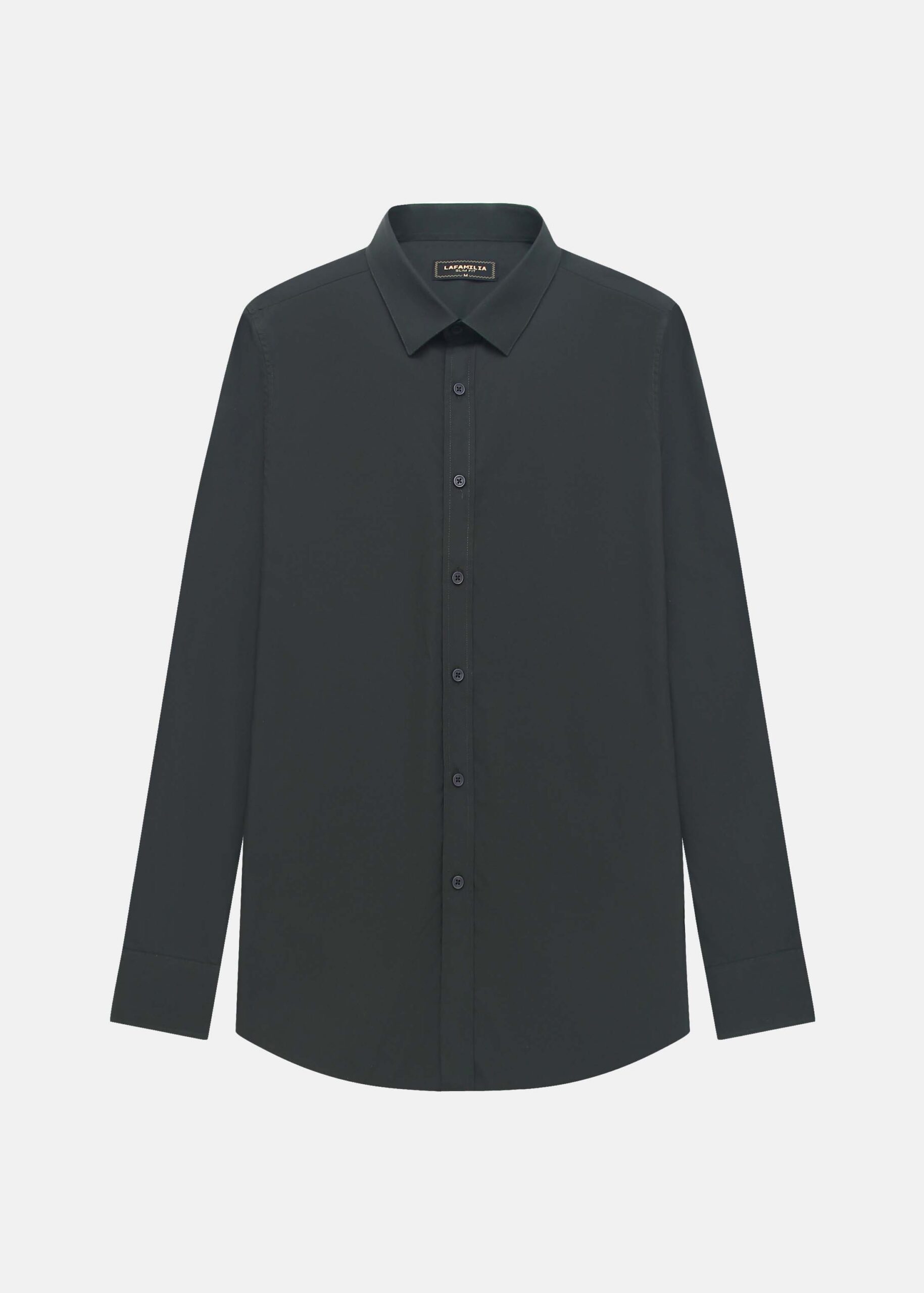 Men shirt, slim-fit, plain, rolled collar, front buttons to close, long sleeves with tight cuff, unique and modern