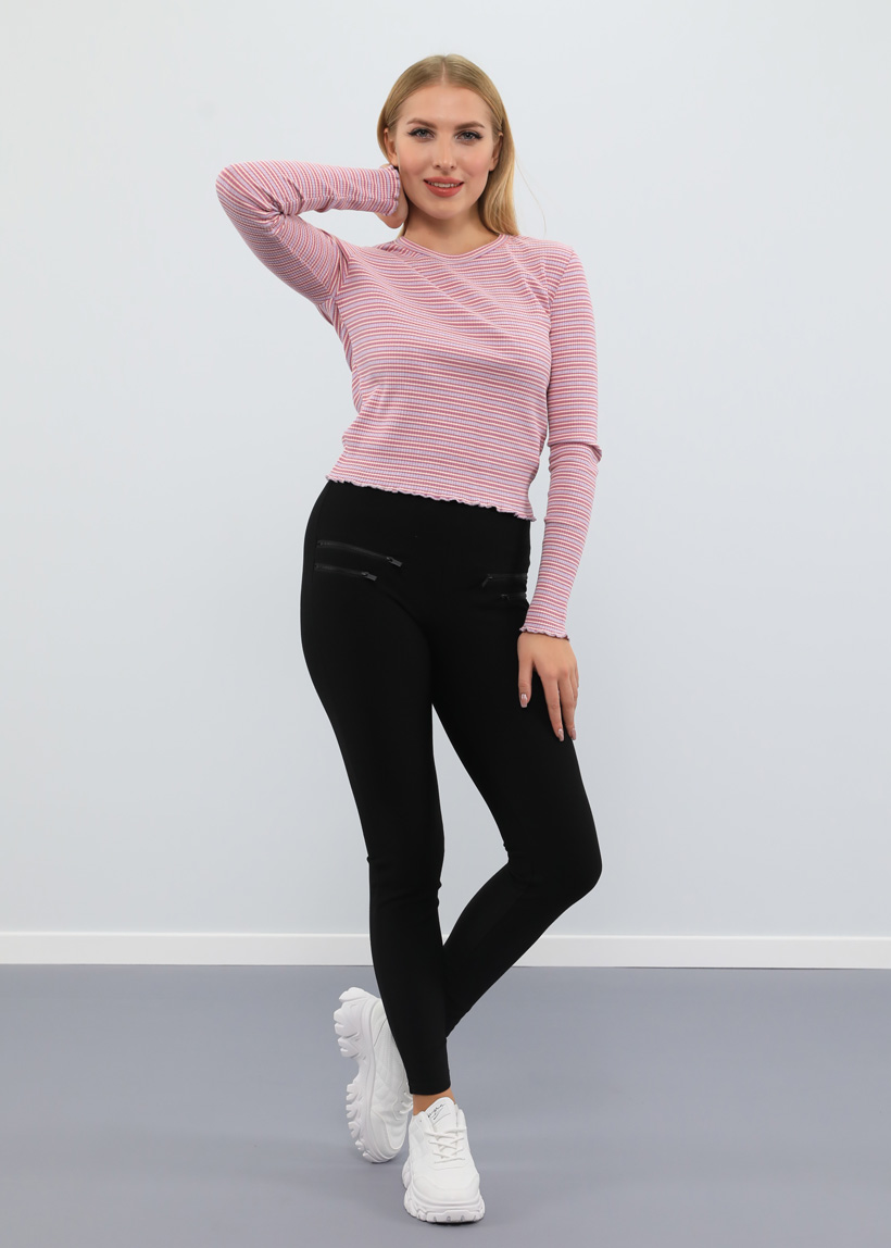 Tight-fitting striped women’s blouse with long, sleeves & rounded neckline made of quality 95% Cotton & 5% Spandex
