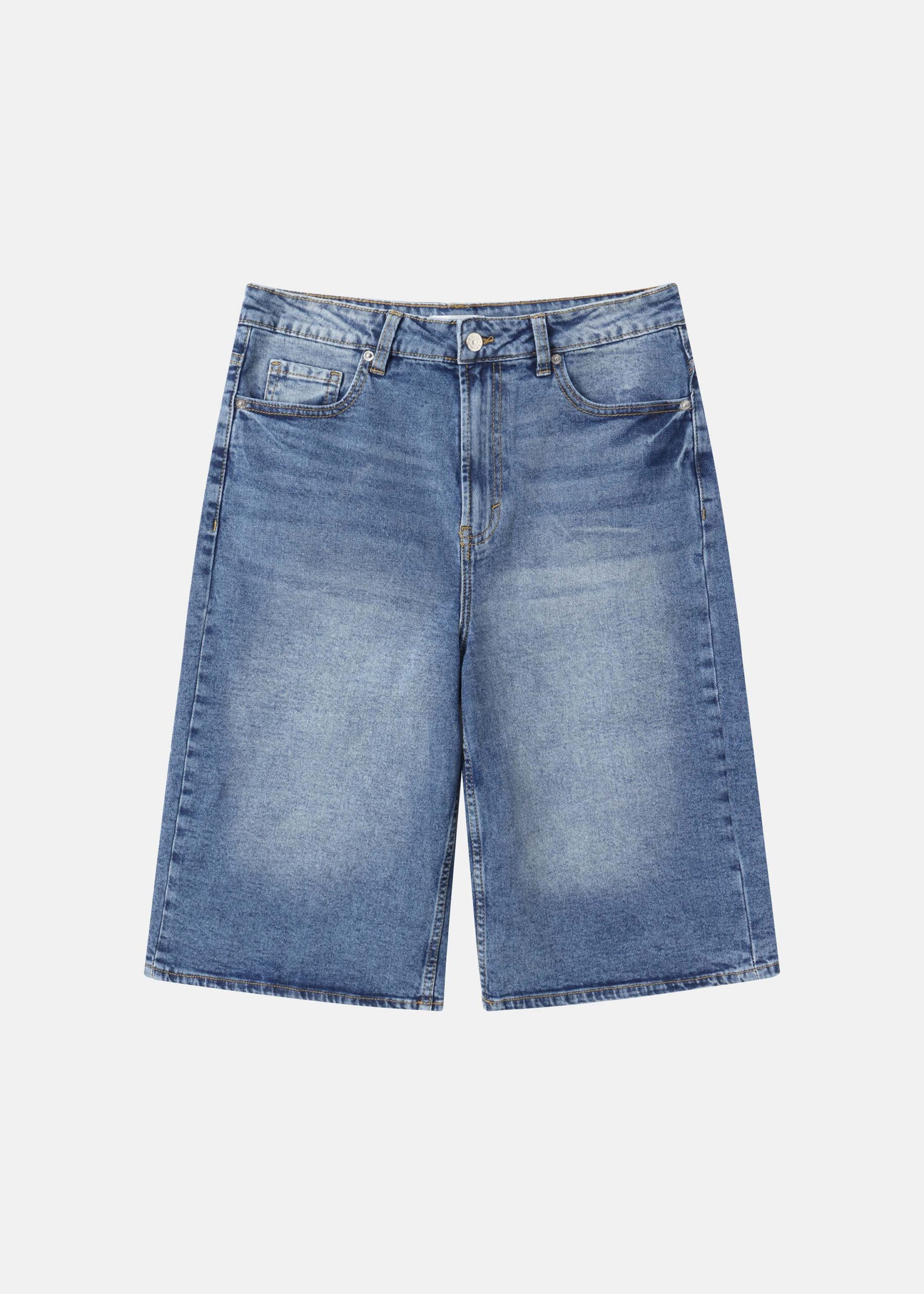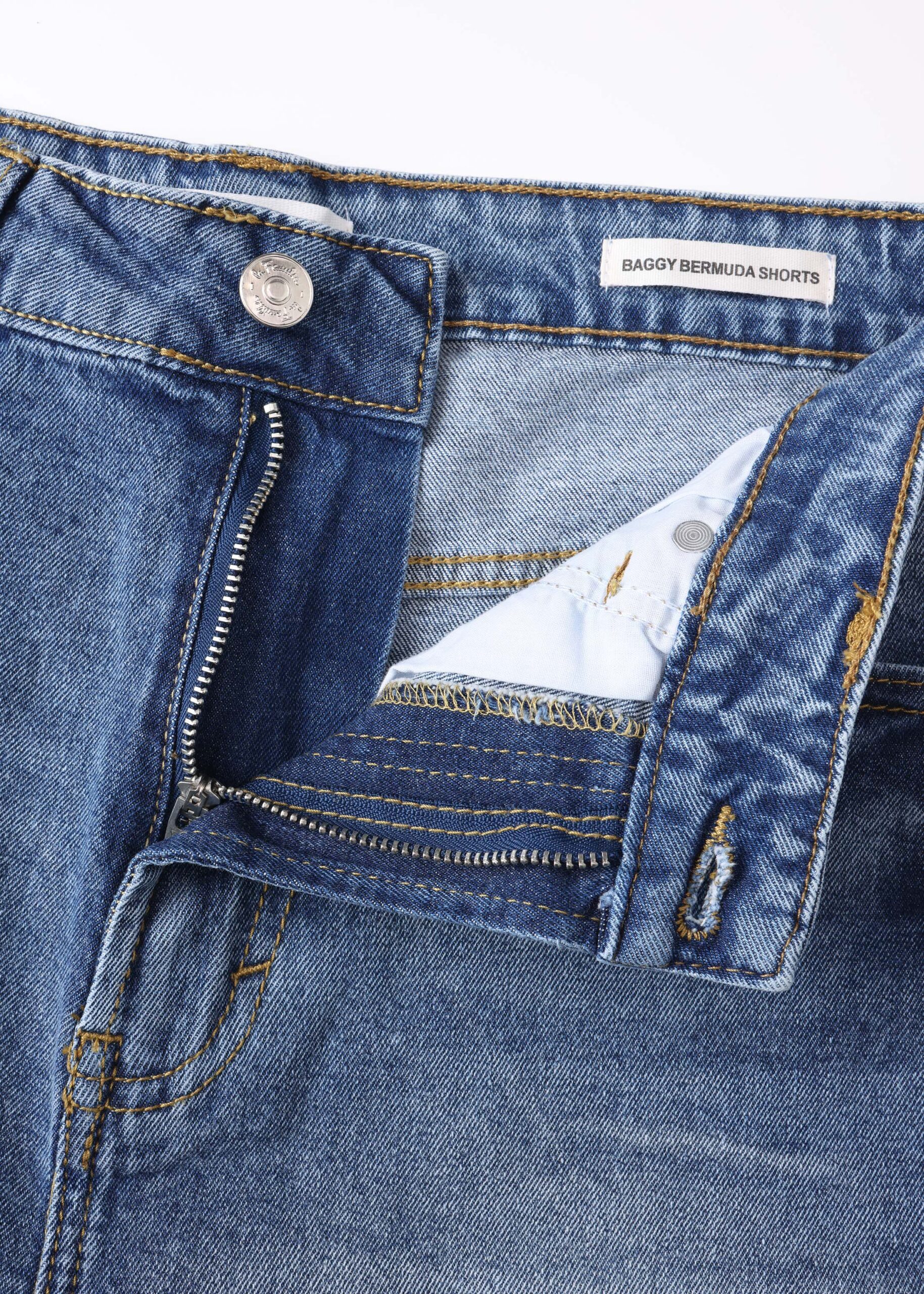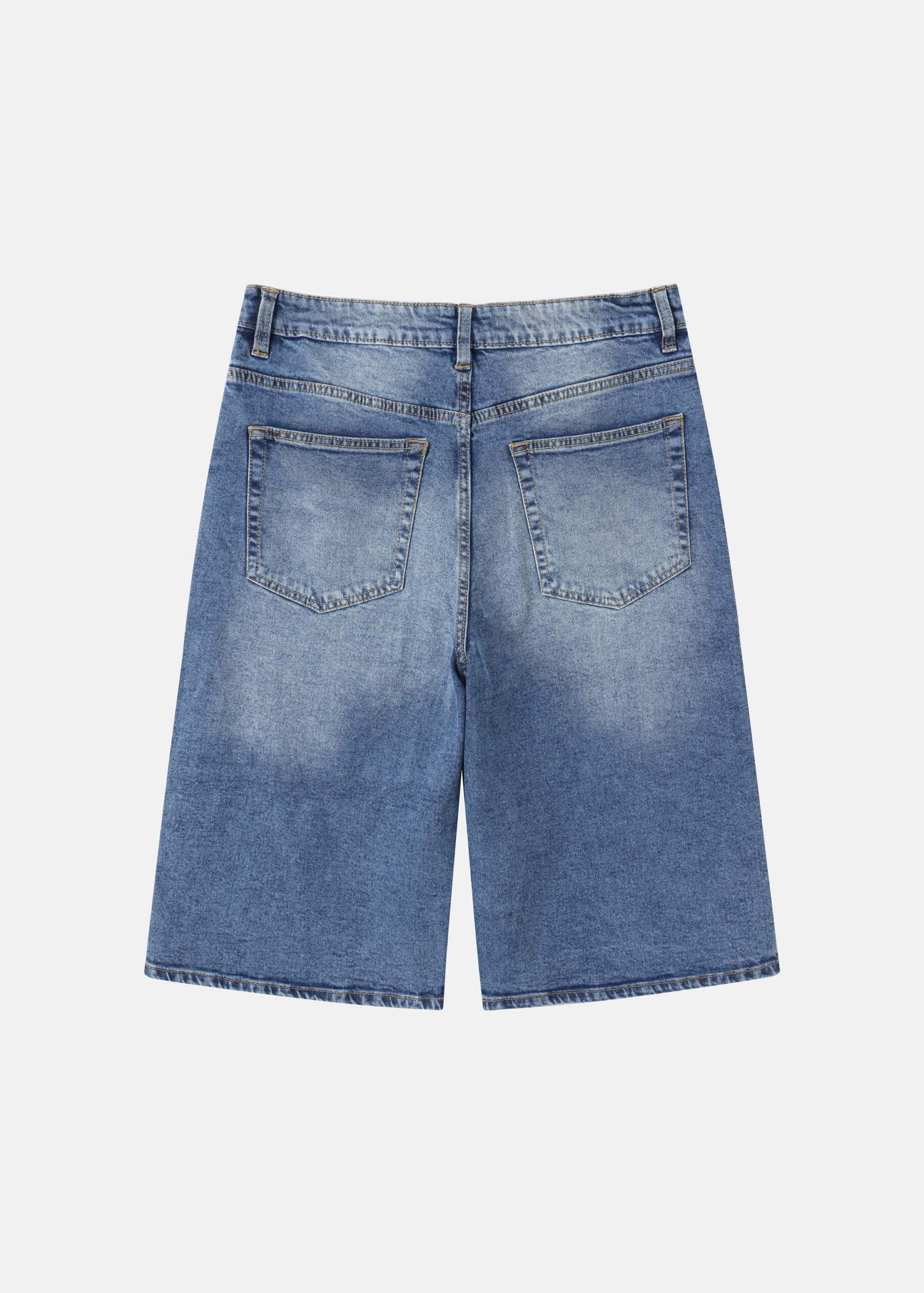 Women short, baggy bermuda, jeans, front button and zipper closure, front and back pockets, unique and modern