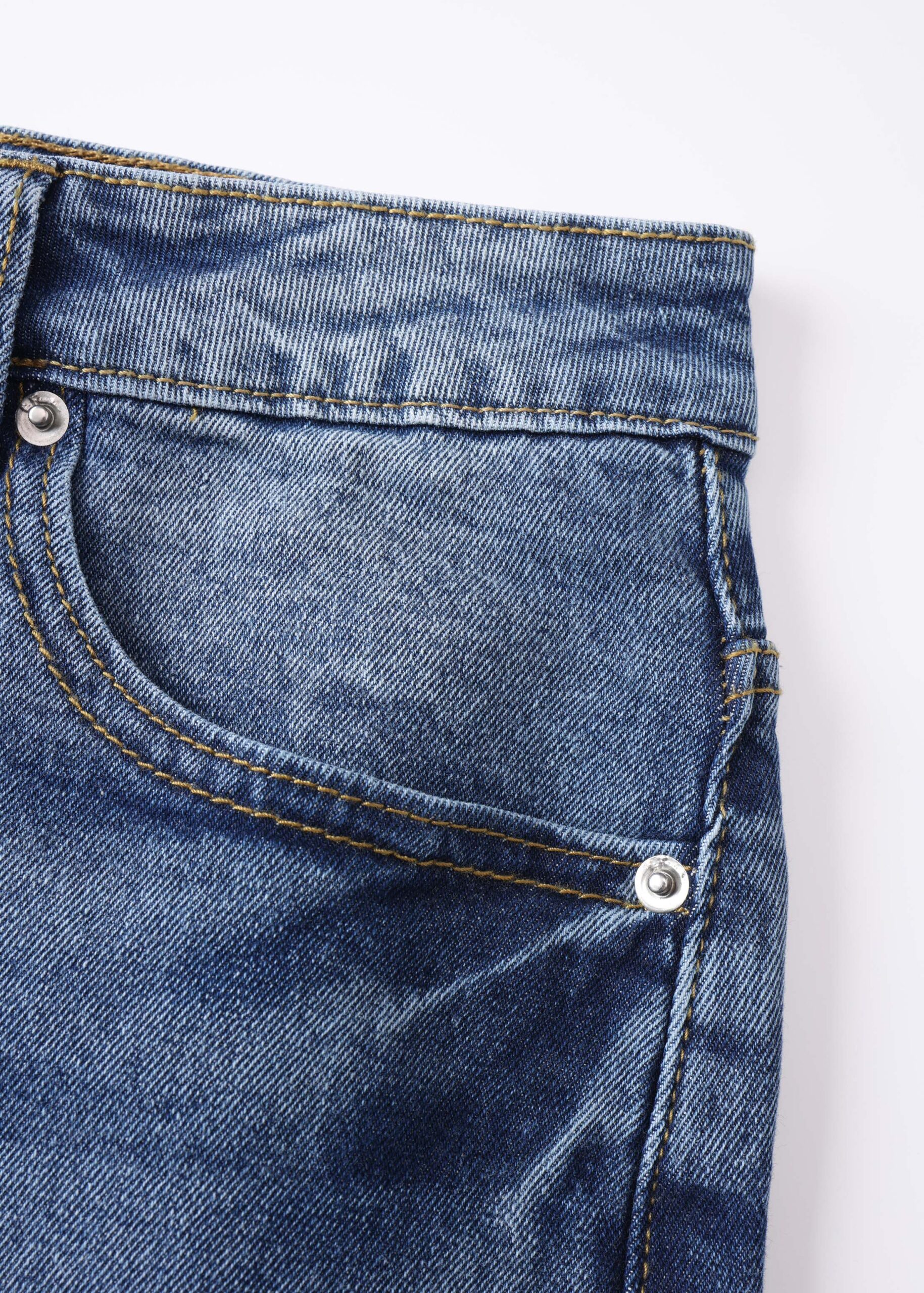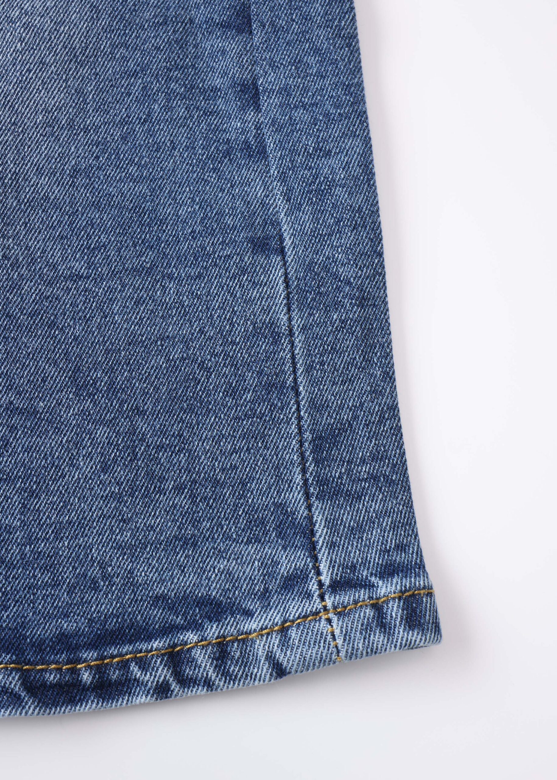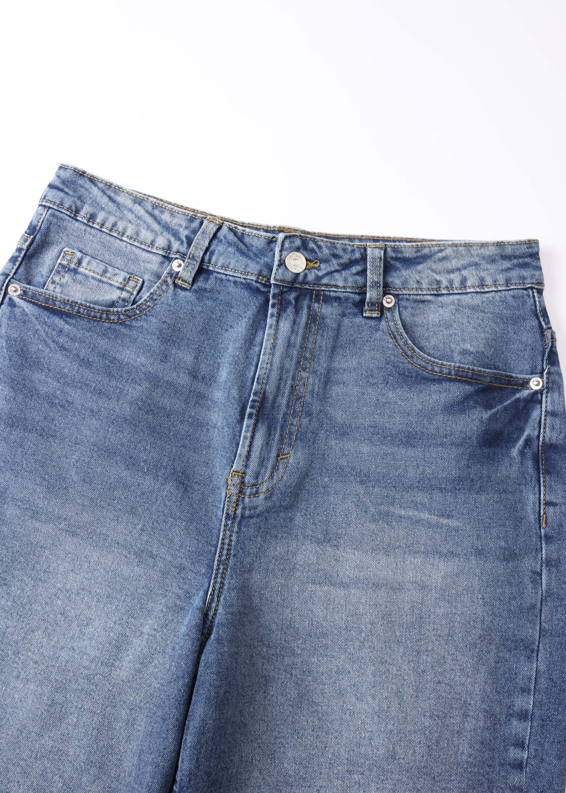 Women short, baggy bermuda, jeans, front button and zipper closure, front and back pockets, unique and modern