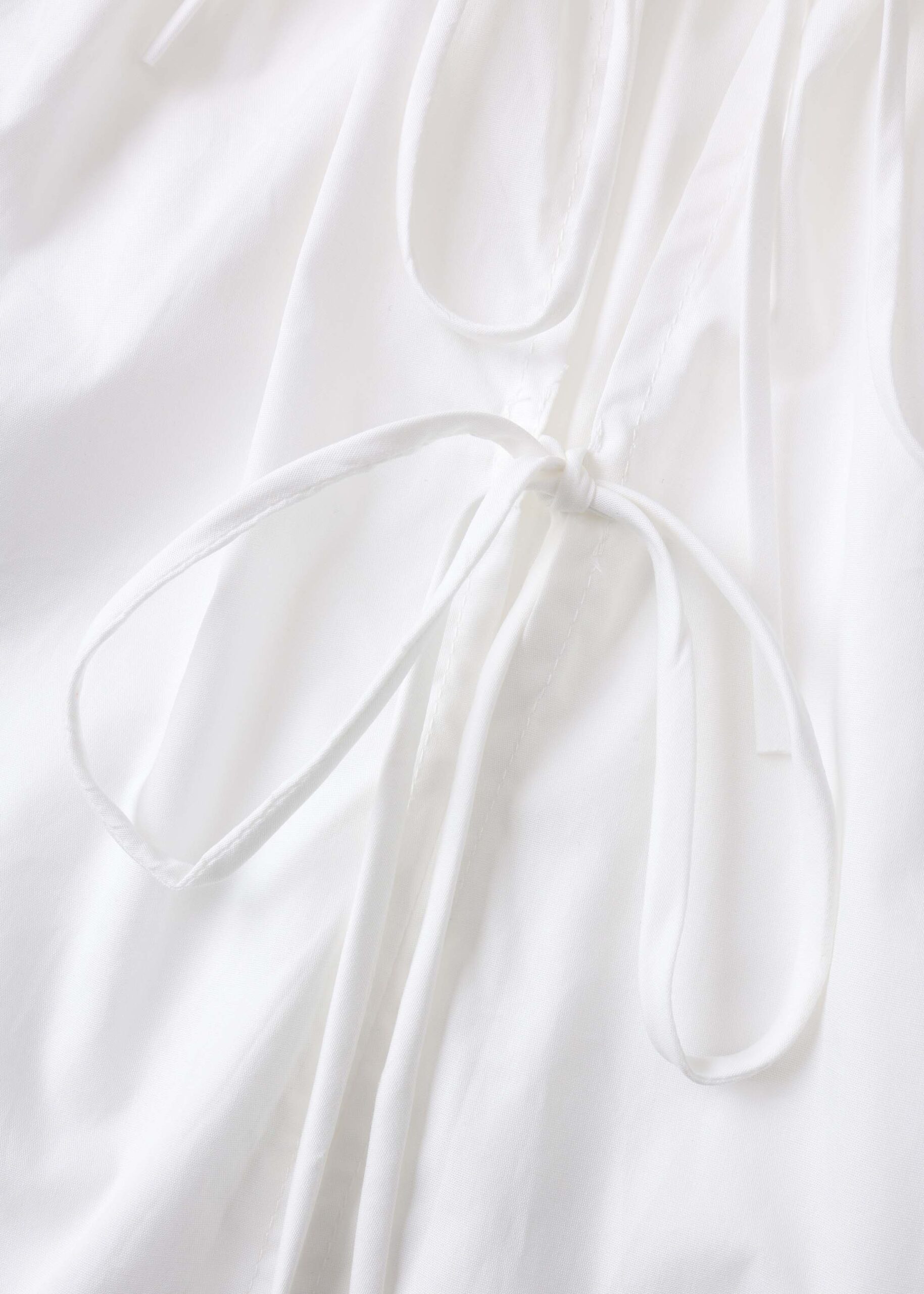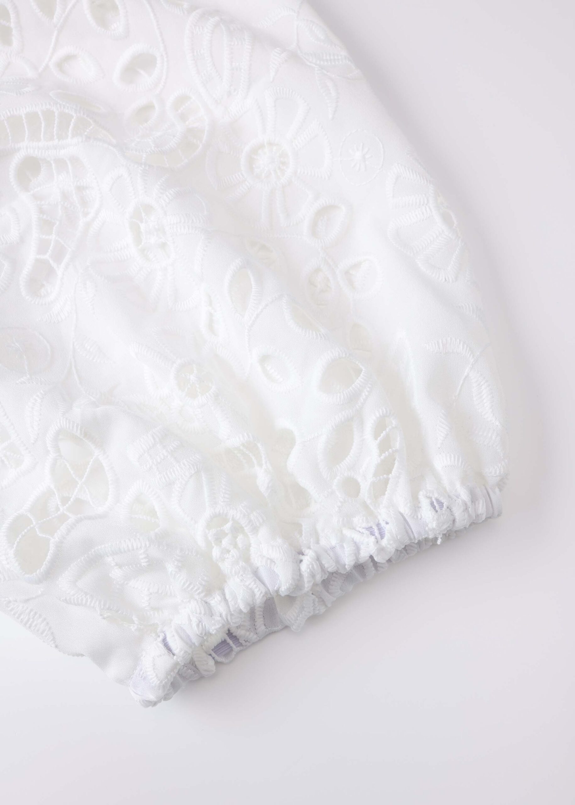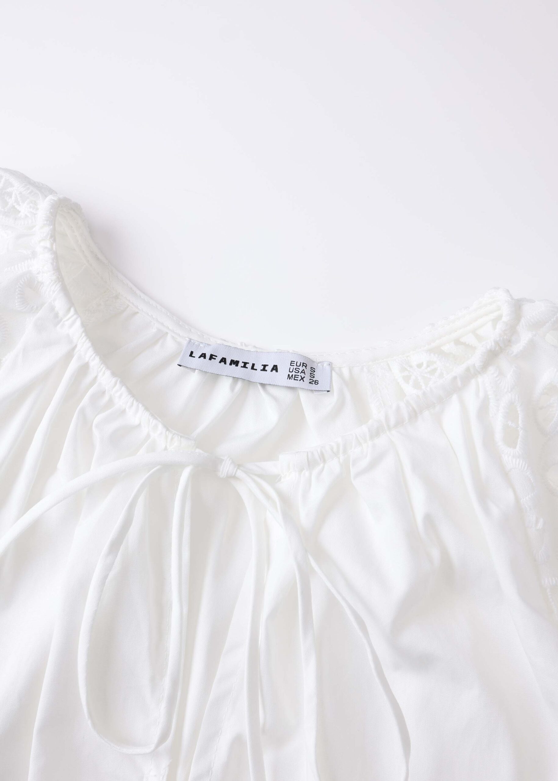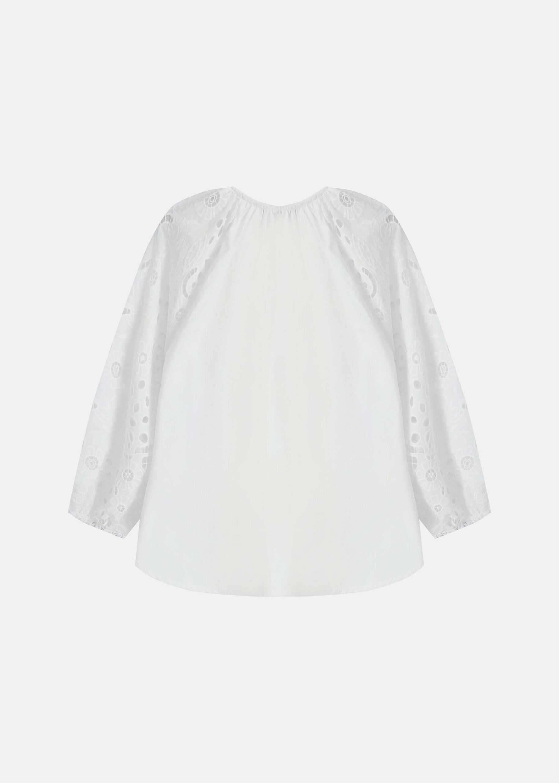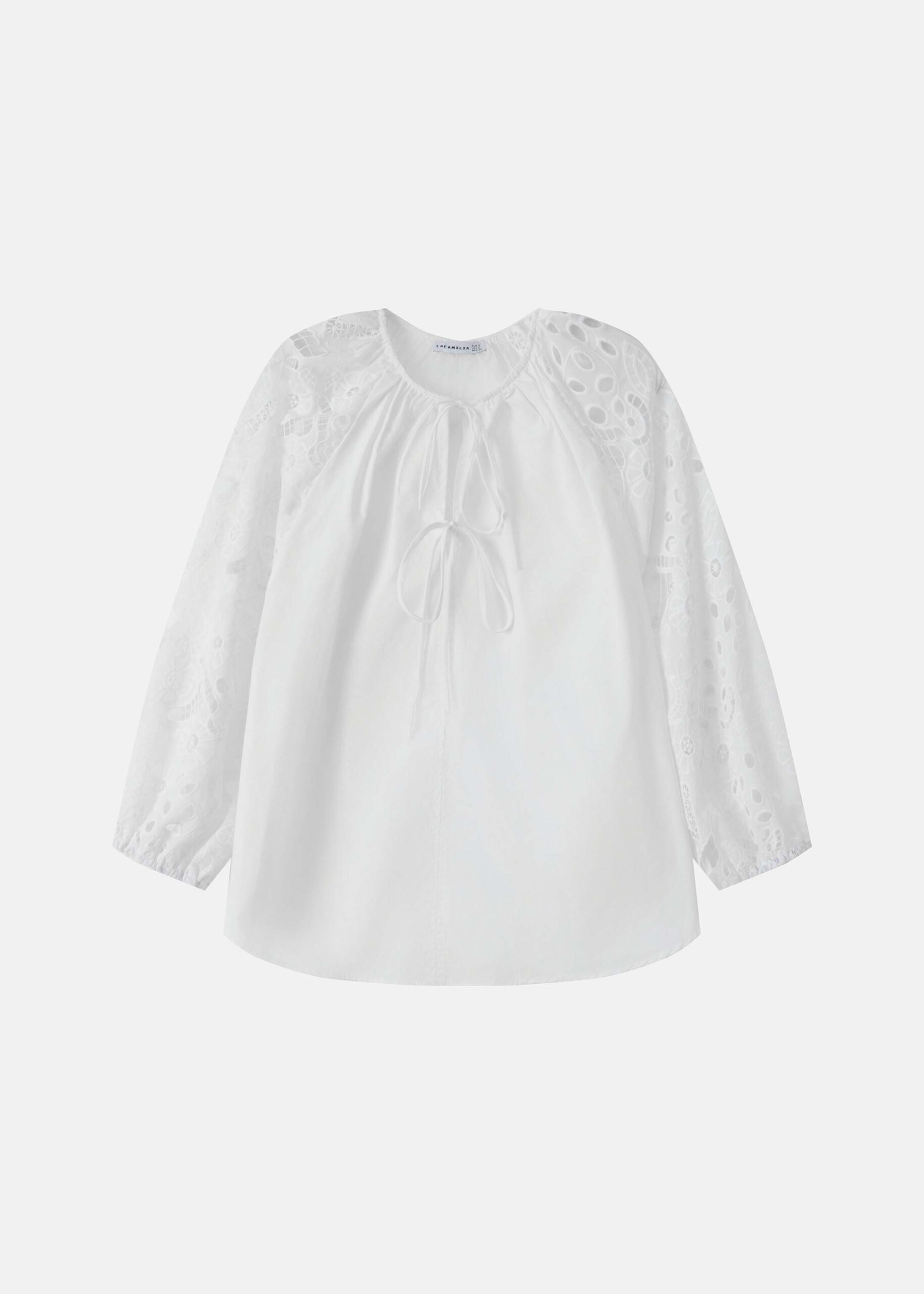Women blouse, round neck with front tie, long eyelet embroidery sleeves, unique and modern