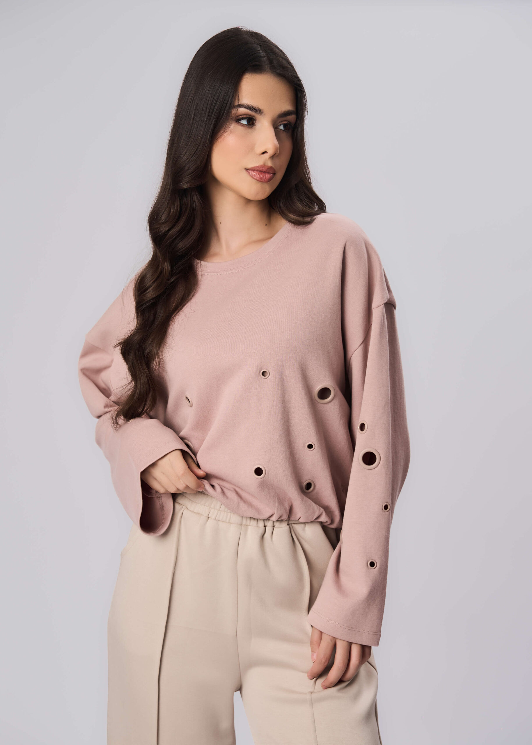 Women blouse, circle cut-out details, round neck, long sleeves, elasticized hem, unique and modern
