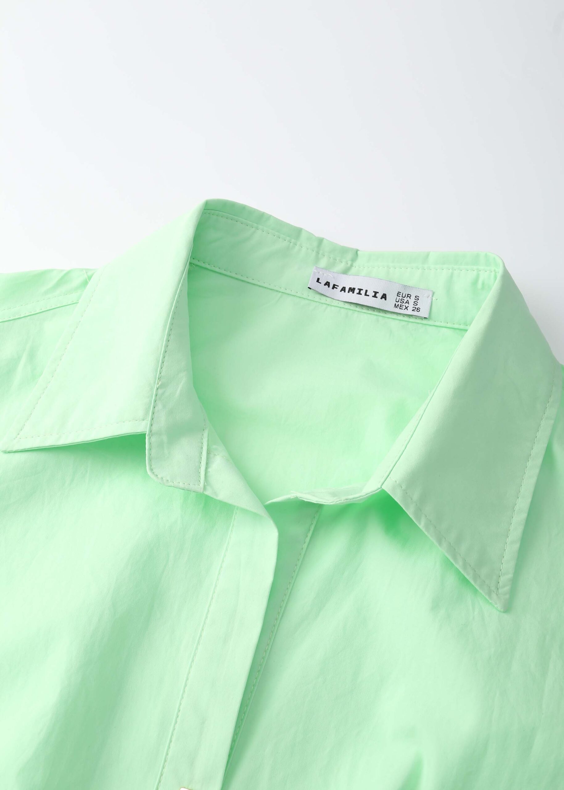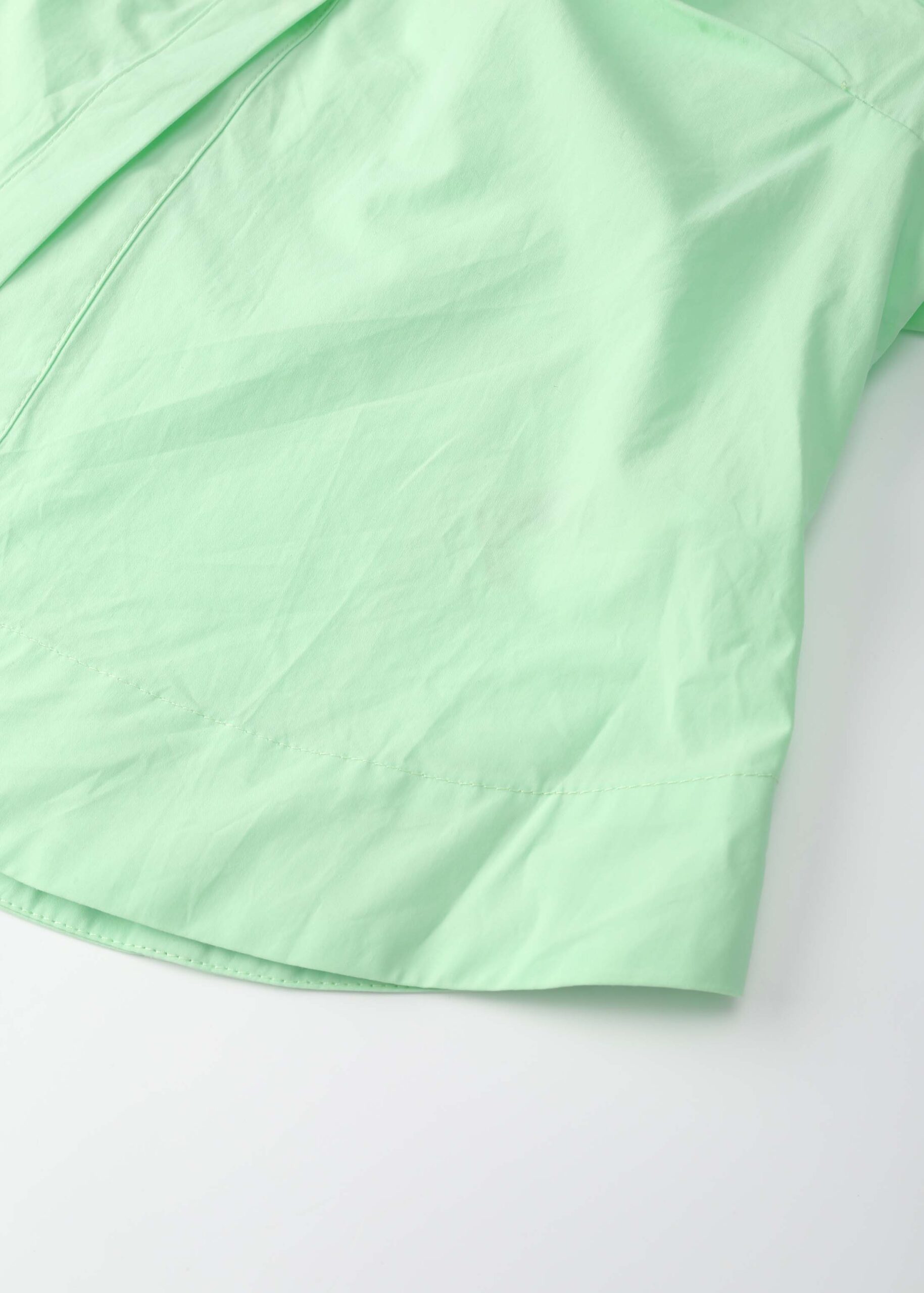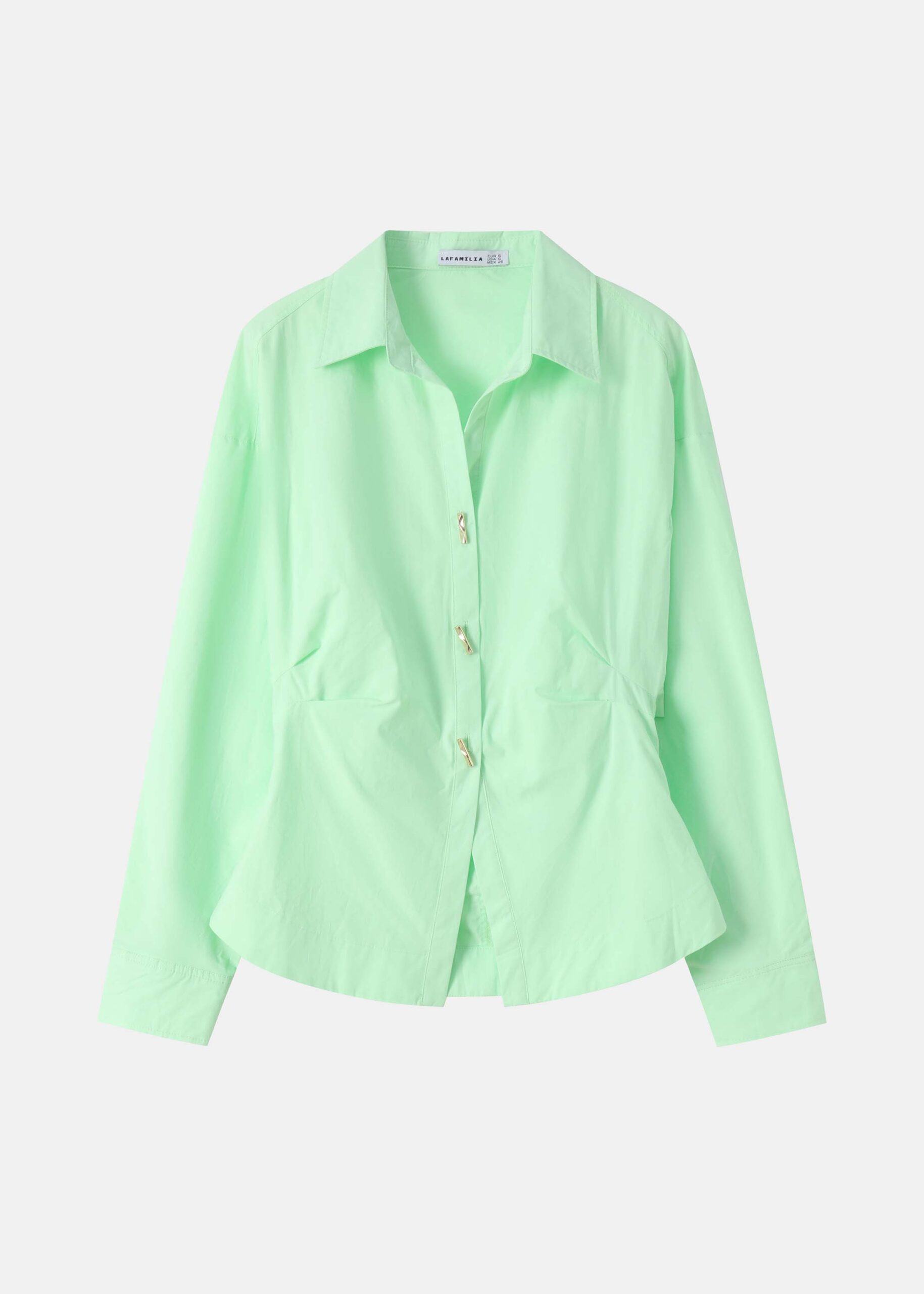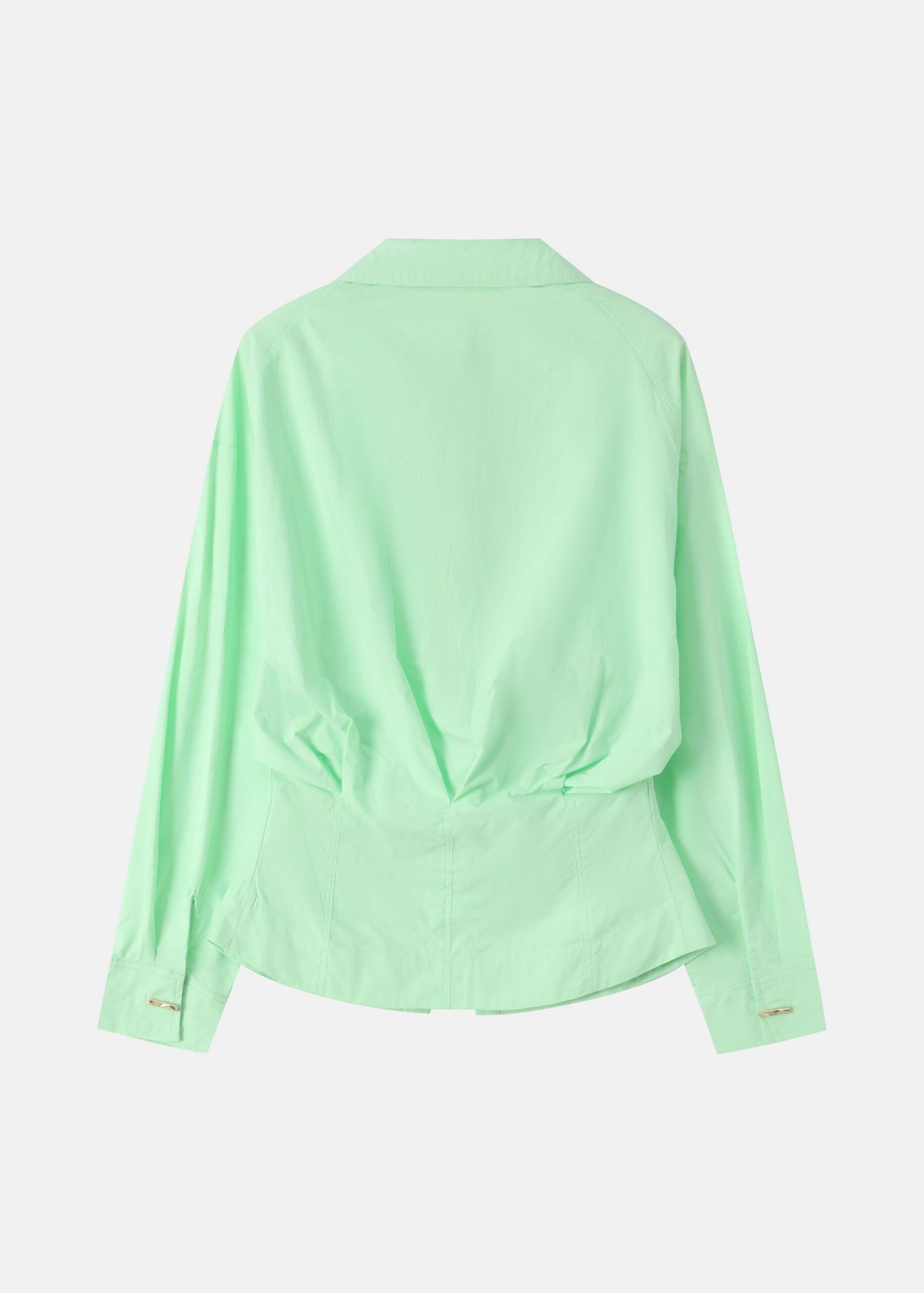 Women shirt, side pleats, rolled collar V neck, long sleeves with tight cuff, front buttons to close, unique and modern