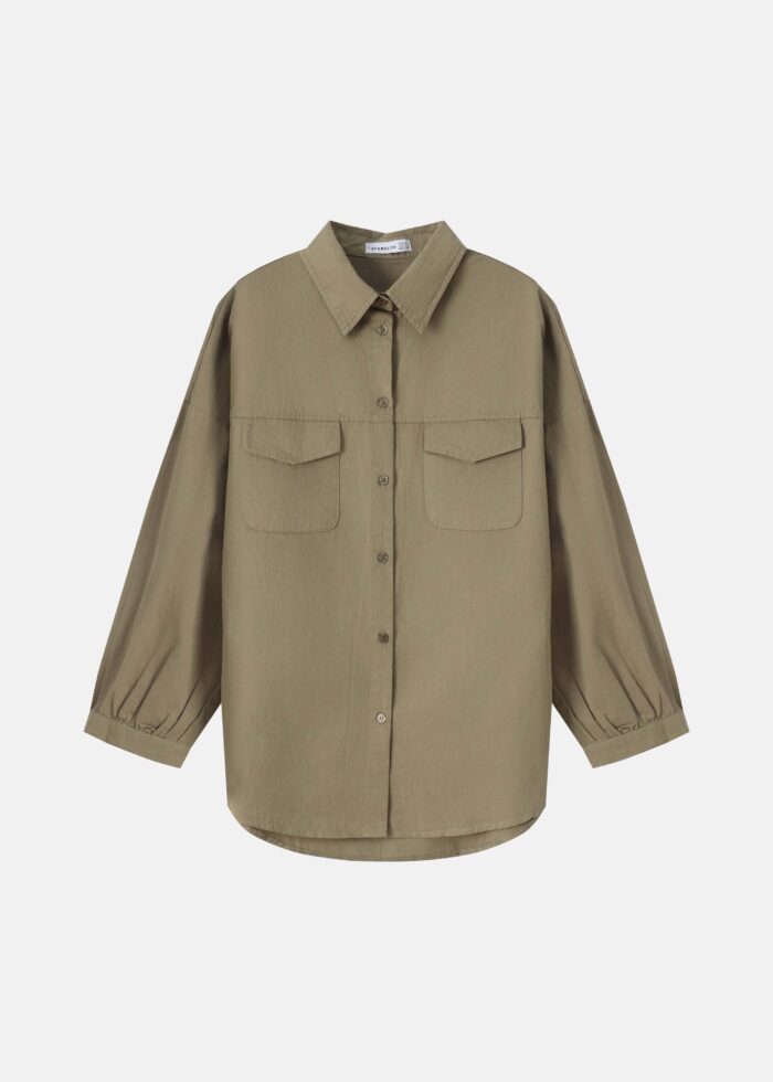 Women shirt, plain, rolled collar, front buttons to close, front flap pockets, long sleeves with pleated cuff, unique and modern