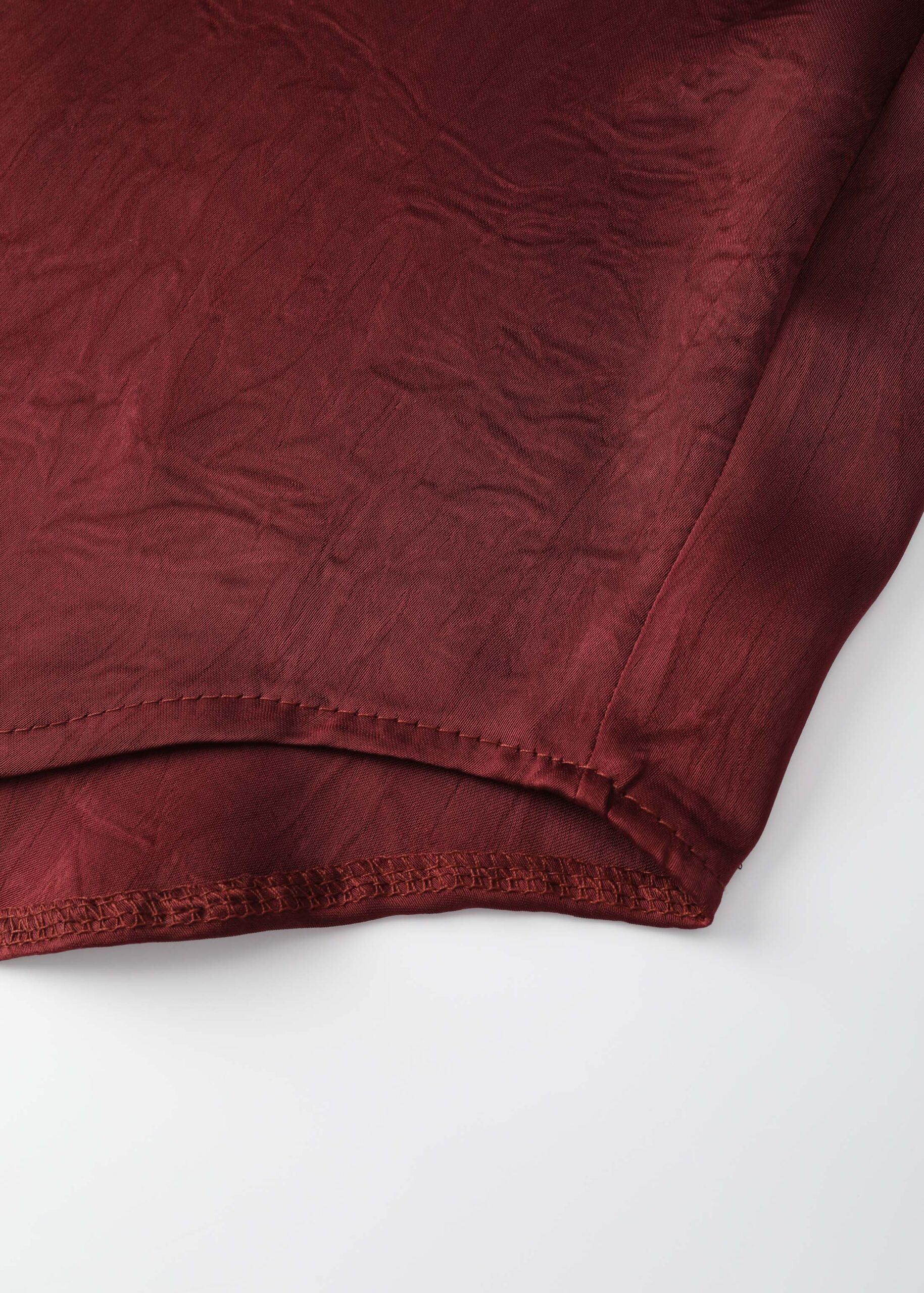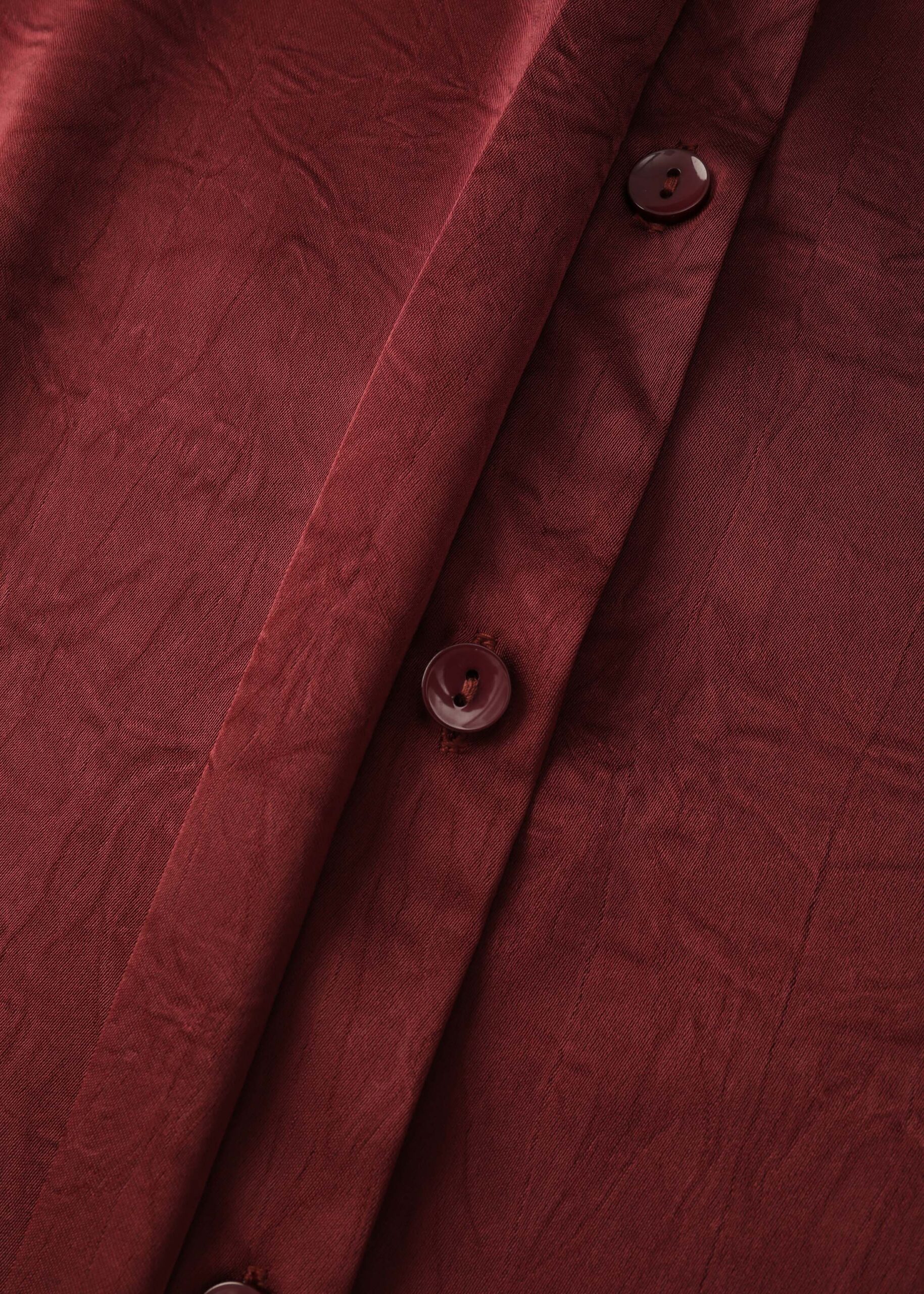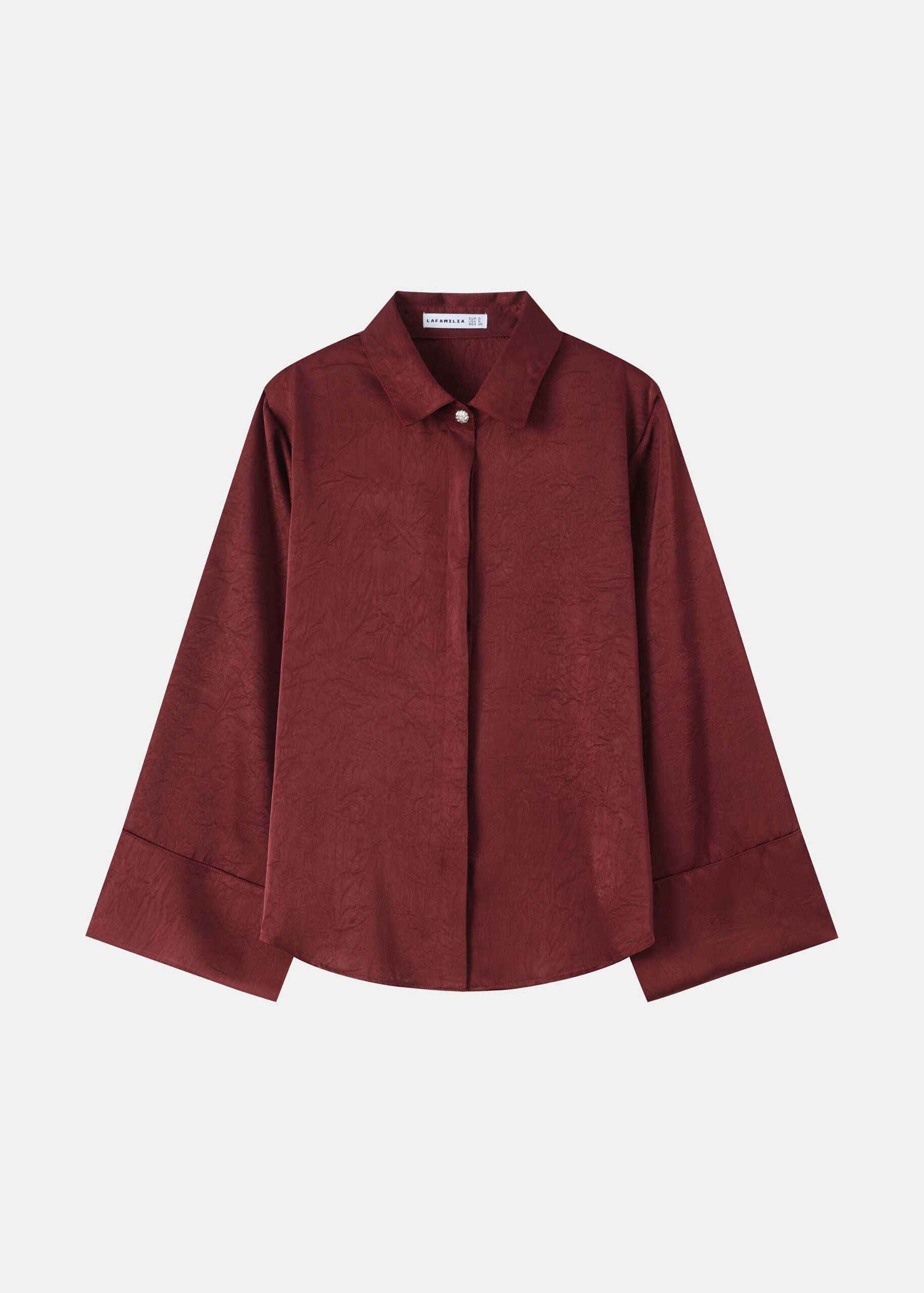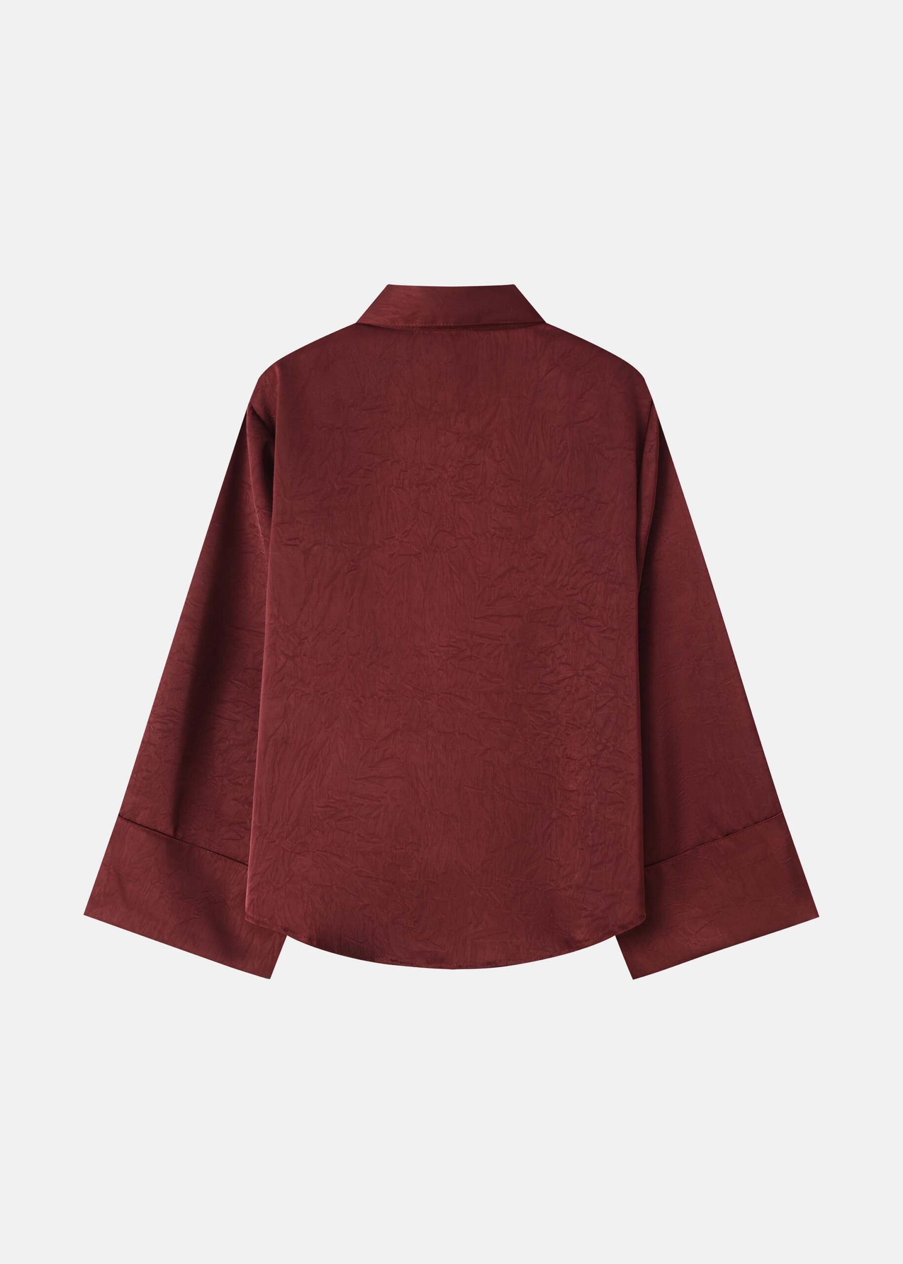 Women shirt, satin, crinkled fabric, rolled collar, front buttons to close, long sleeves, unique and modern