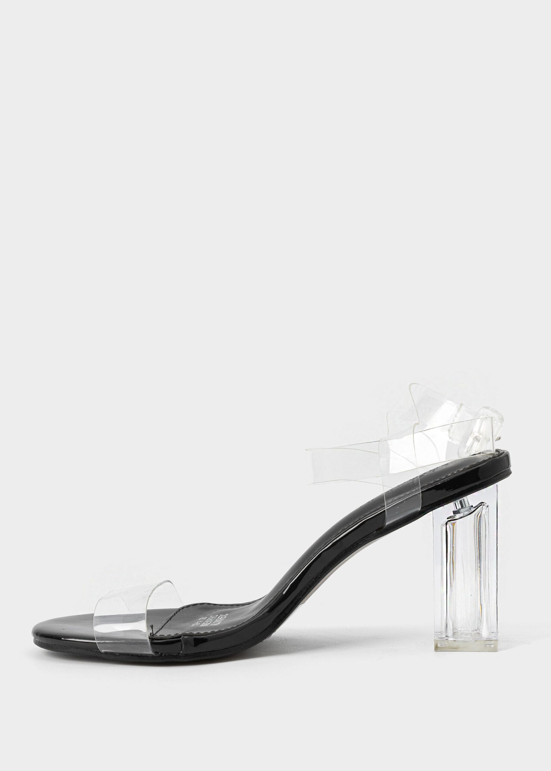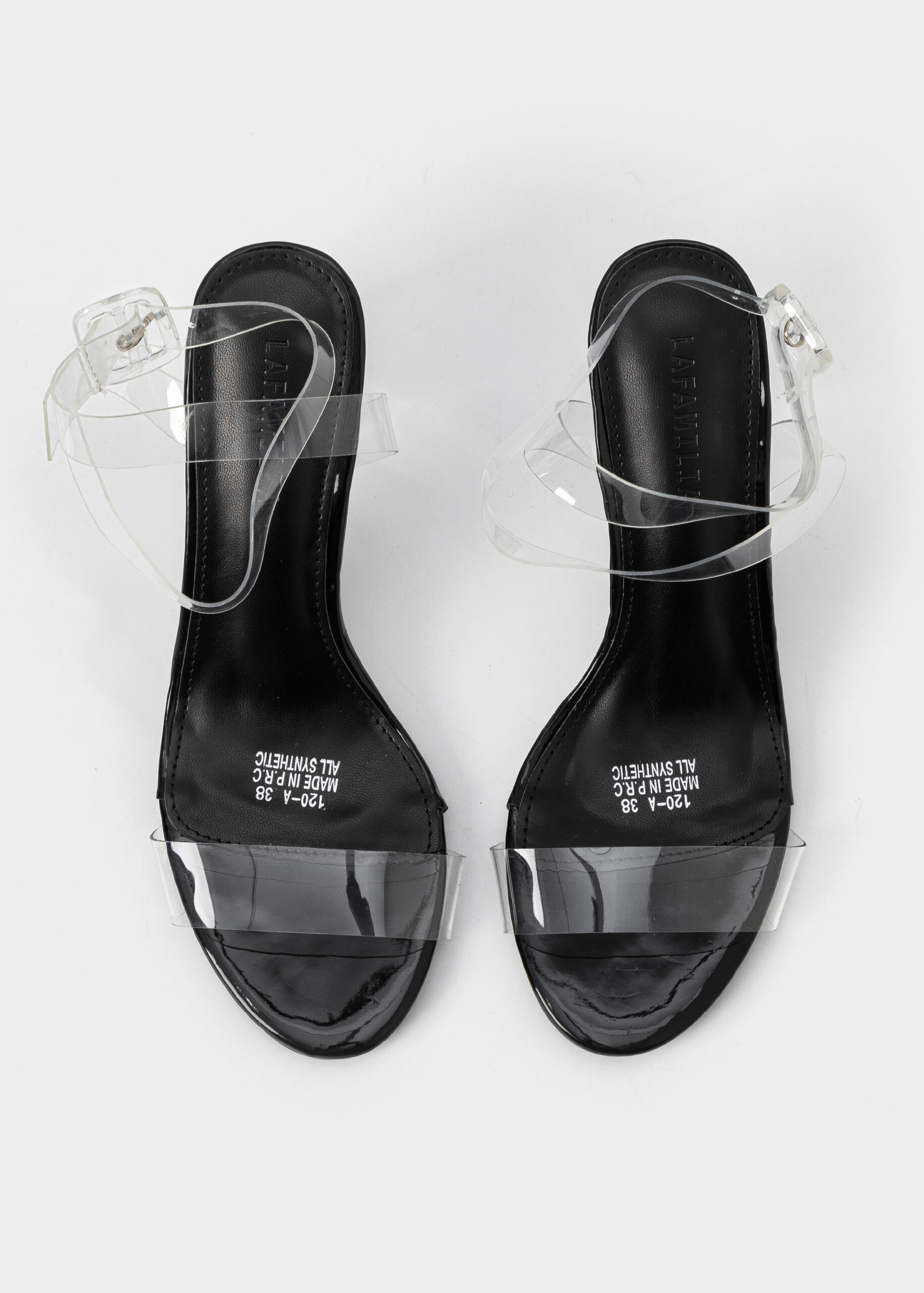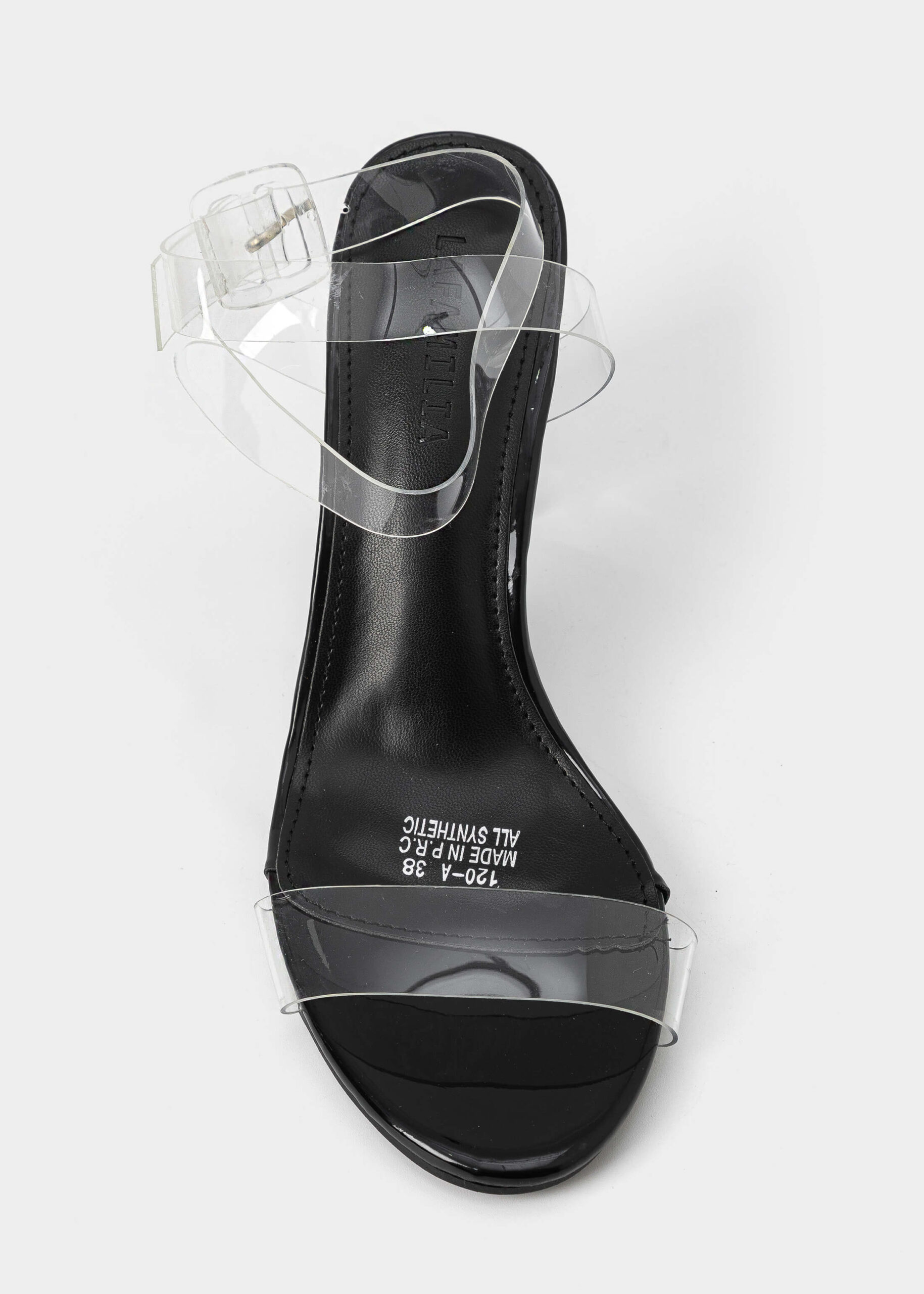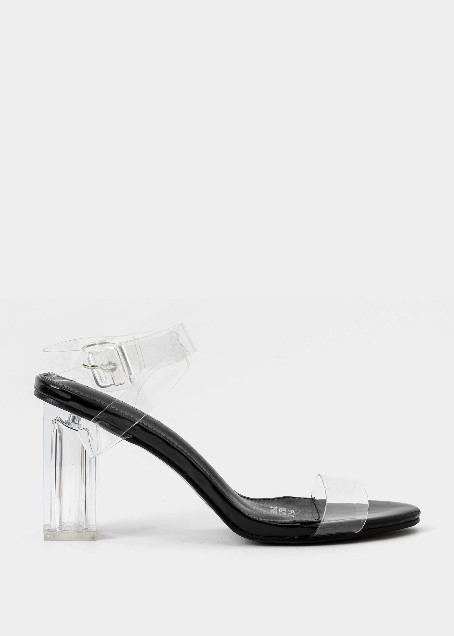 Women sandal, clear straps, round open roe, clear ankle strap with side buckle to close, clear heels, unique and modern