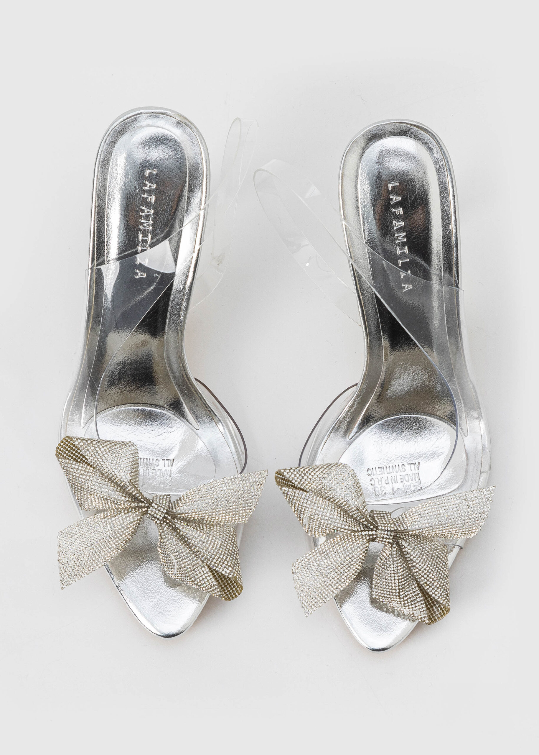 Women sandal, clear straps, point open toe, heels, upper strass bow decor, clear ankle strap, unique and modern