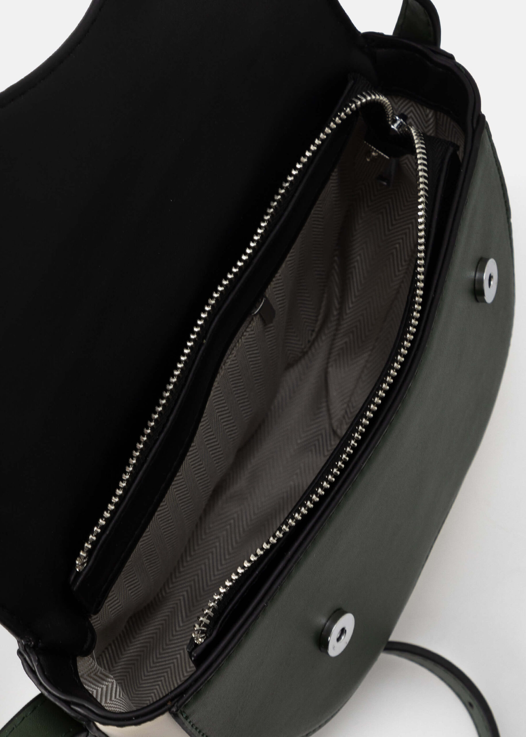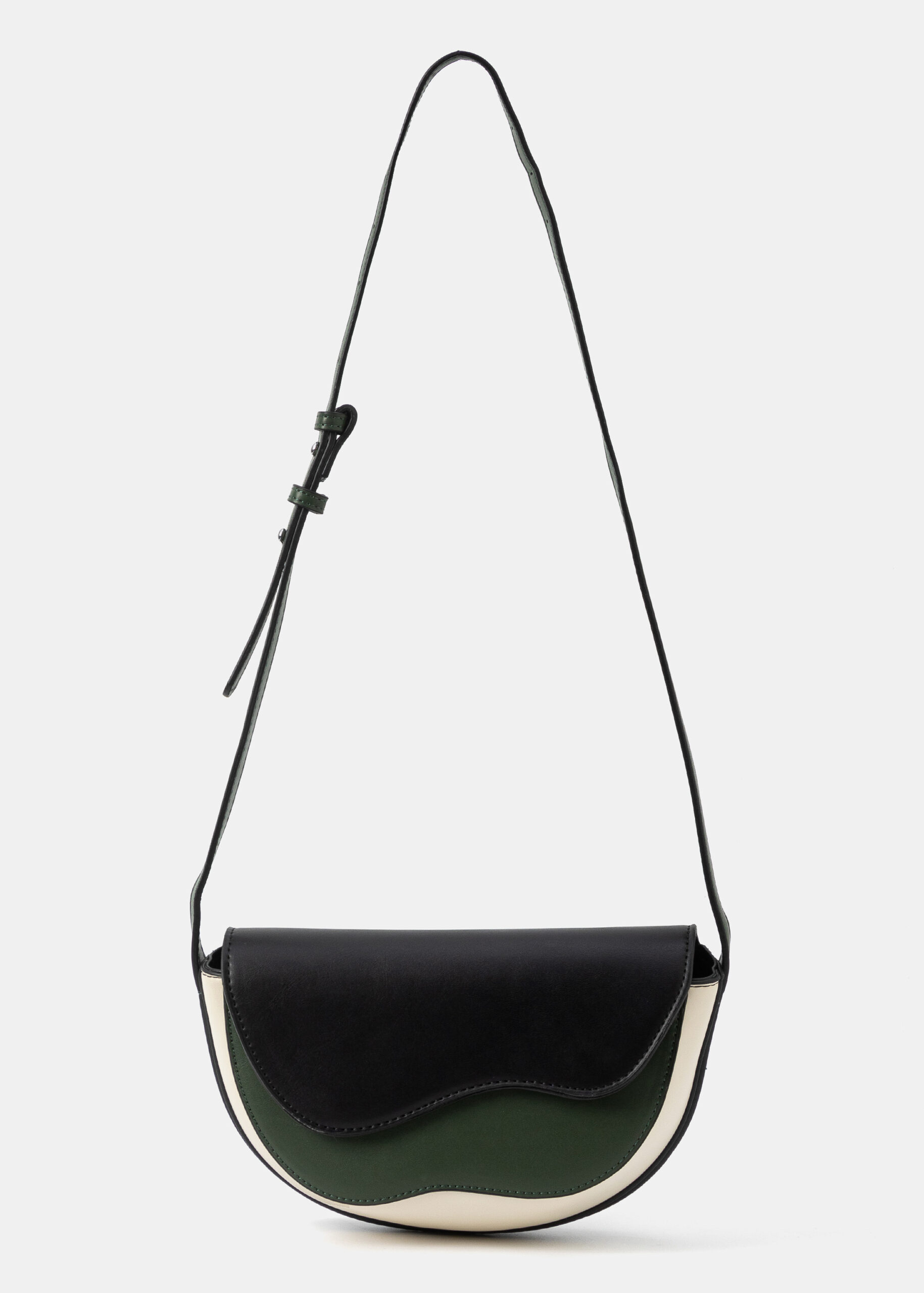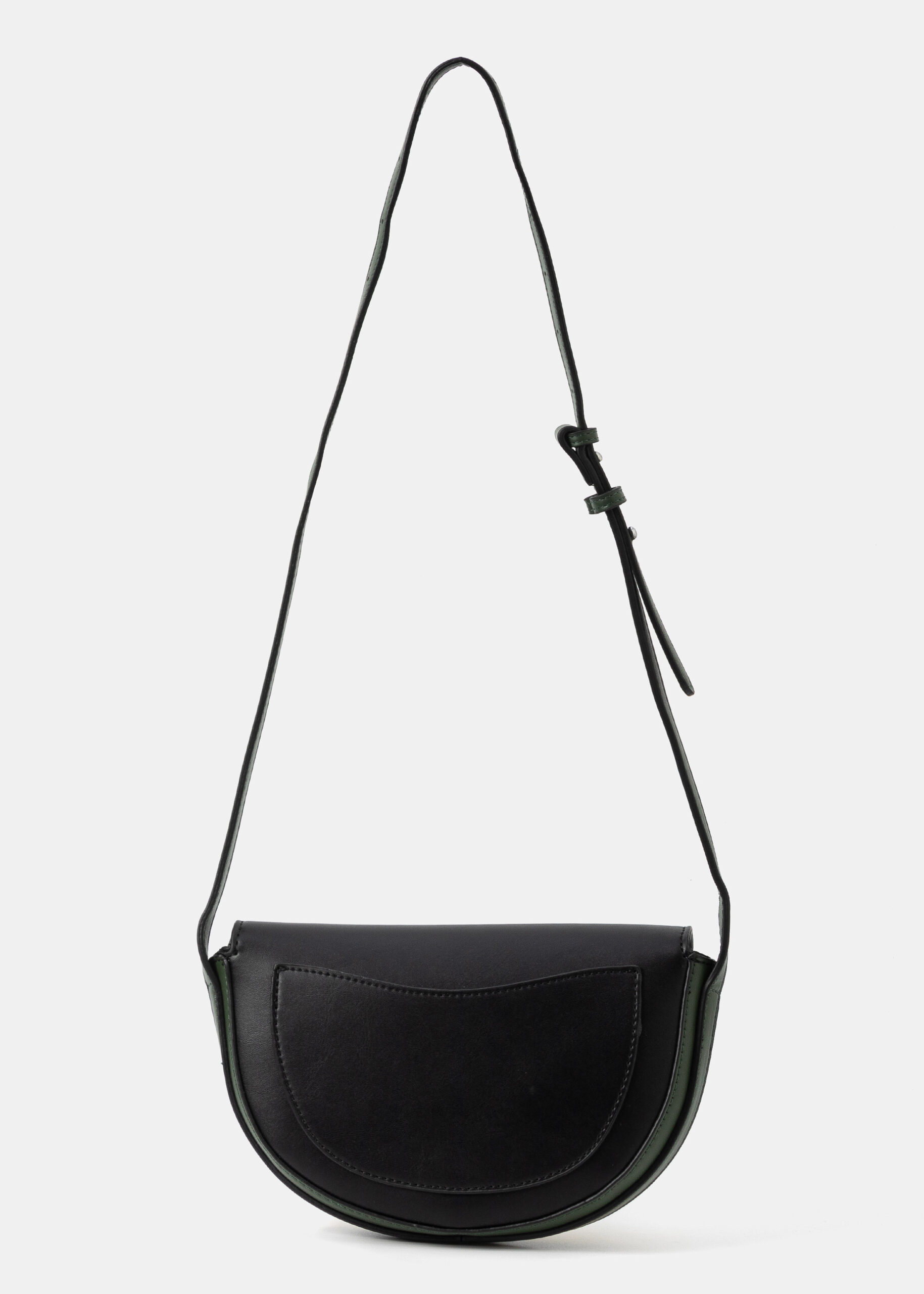 Women bag, leather, color-block, front buttons to close, upper zipper closure, back pockets, adjustable shoulder strap, unique and modern