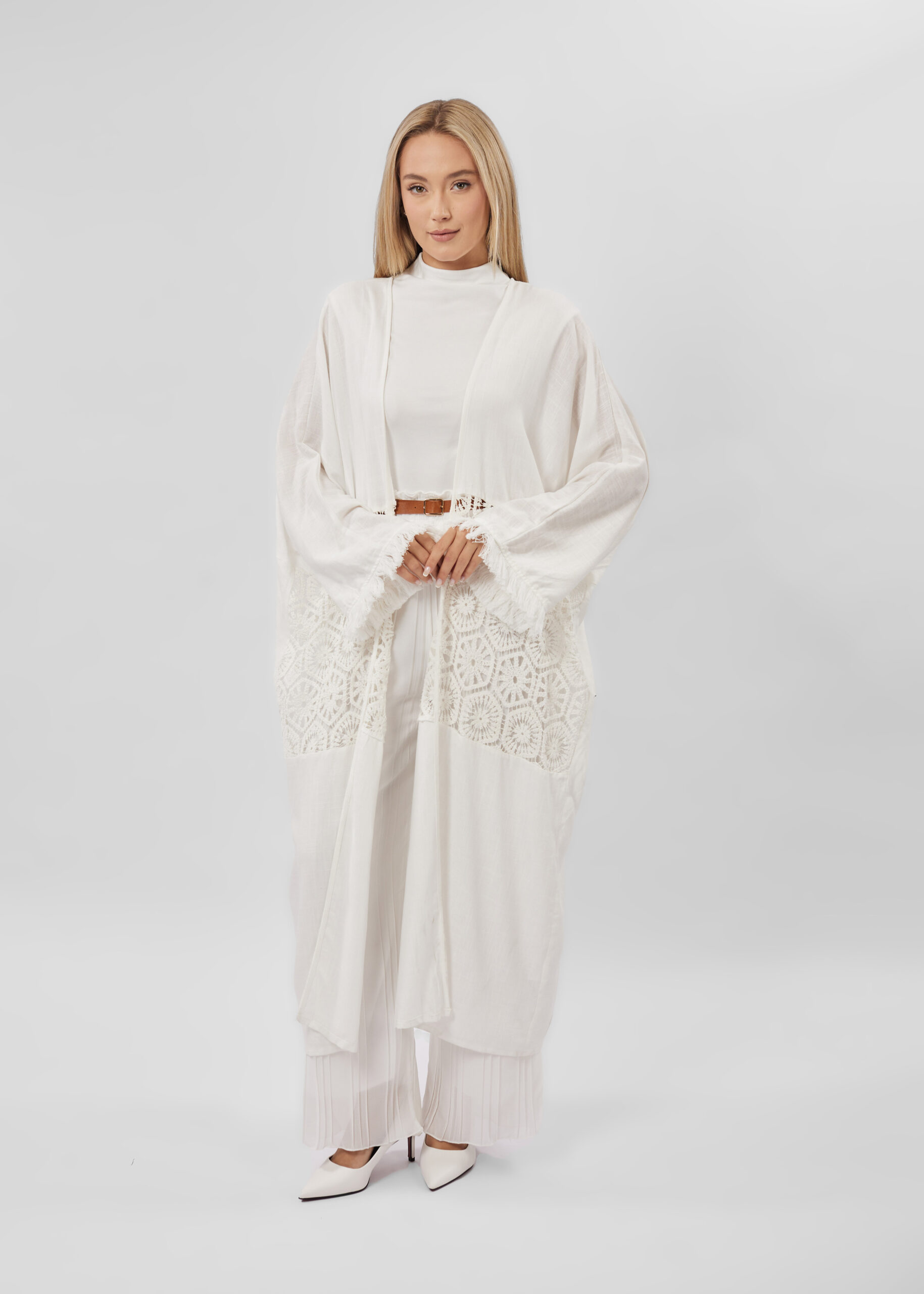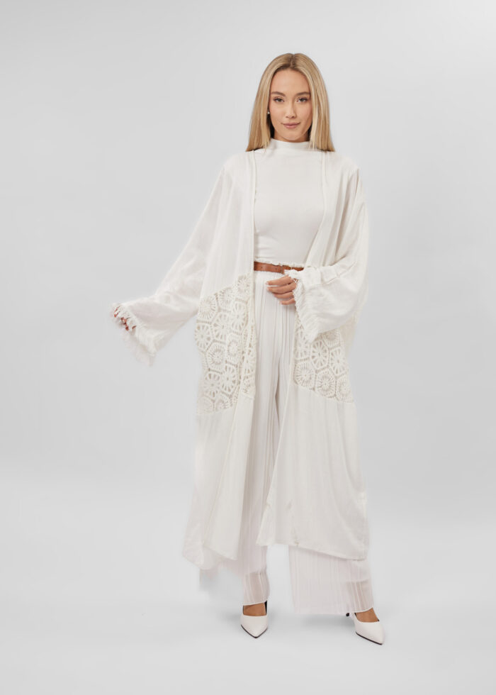 Women abaya, crochet design, open, long sleeves with tassel cuff, unique and modern
