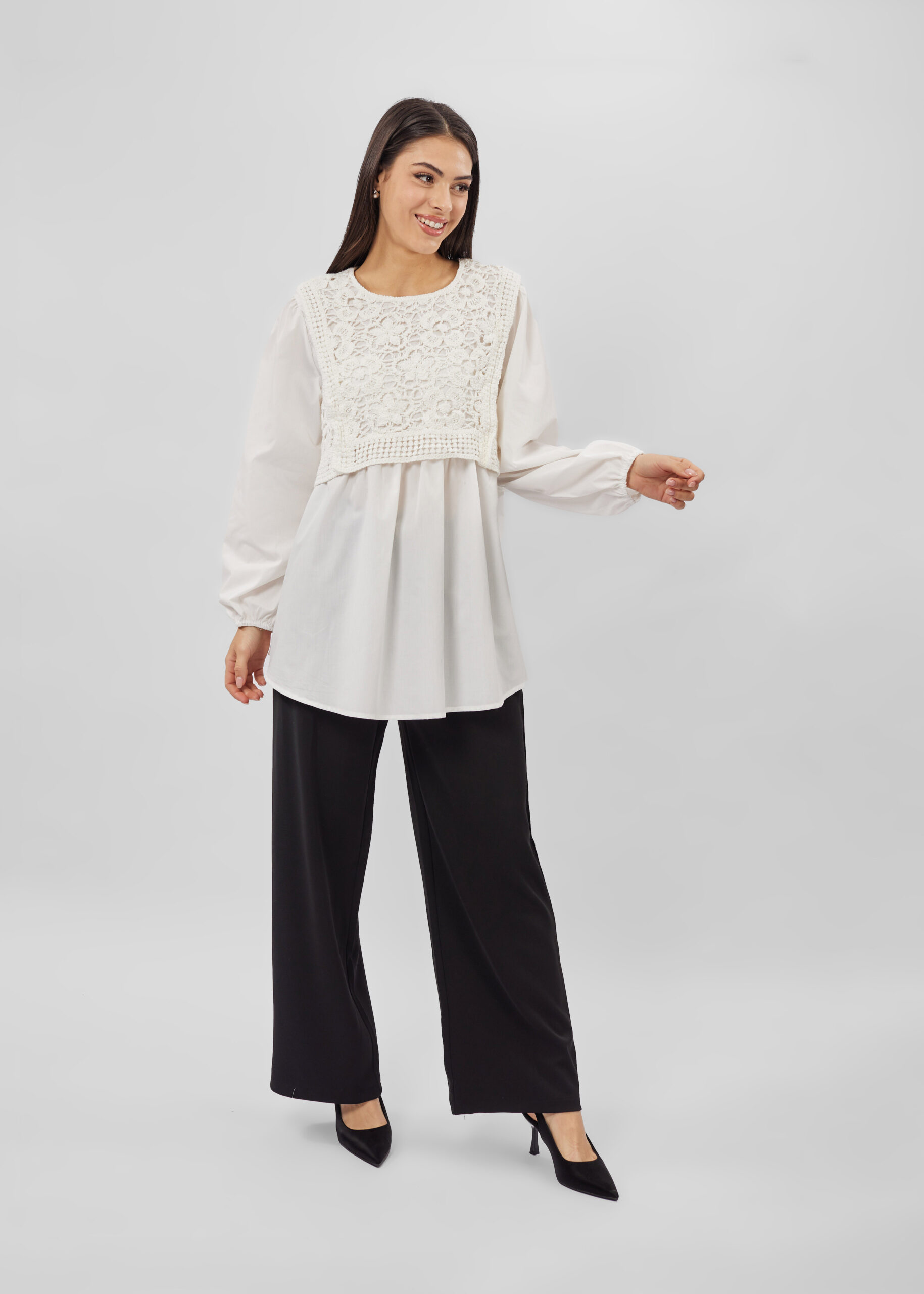Women blouse, crochet desig, long sleeves with tight cuff, round neck with back button to close, unique and modern