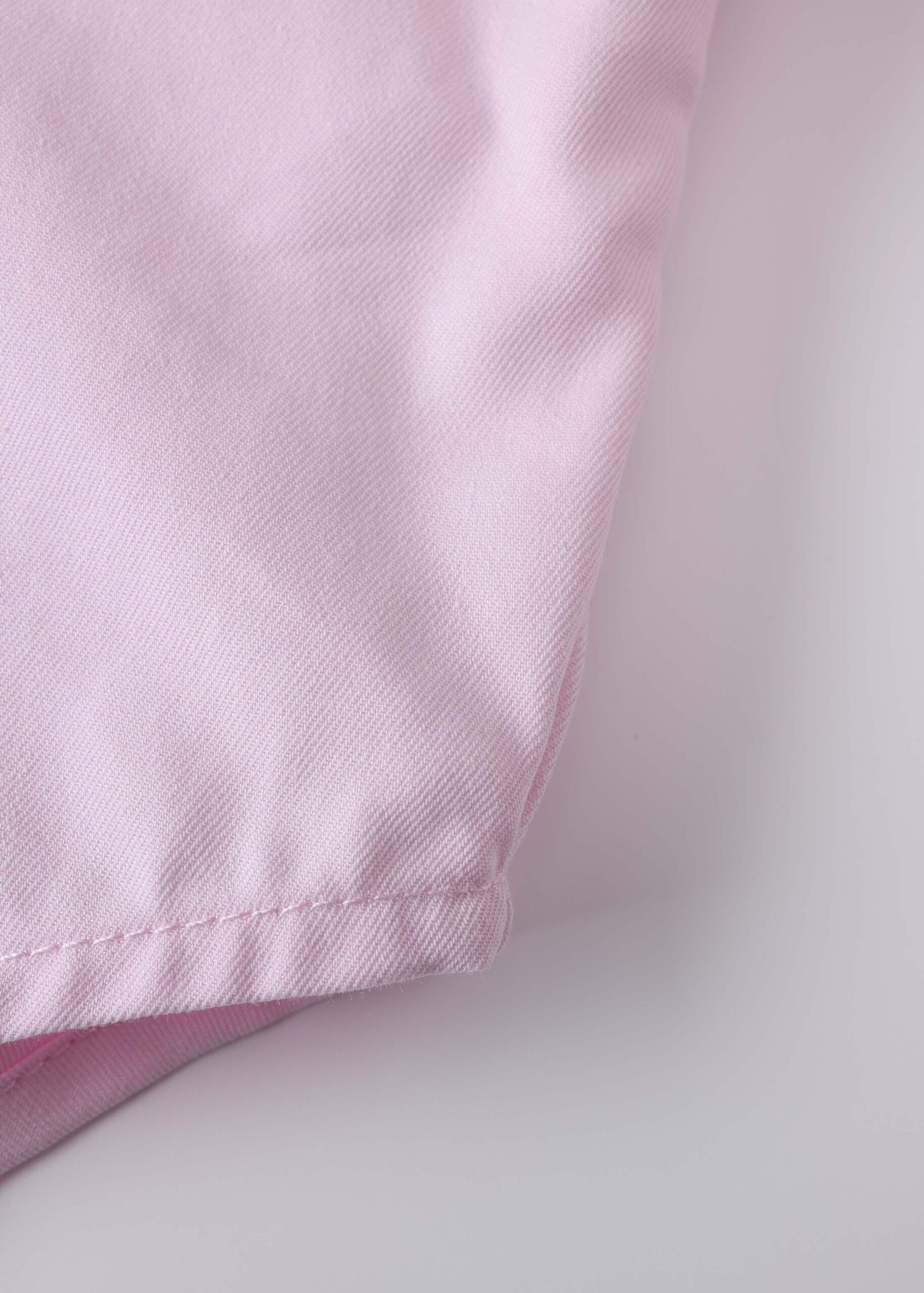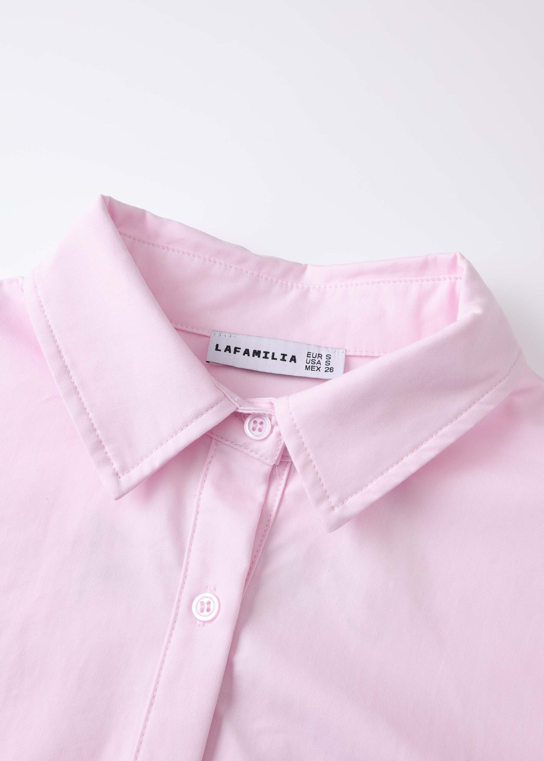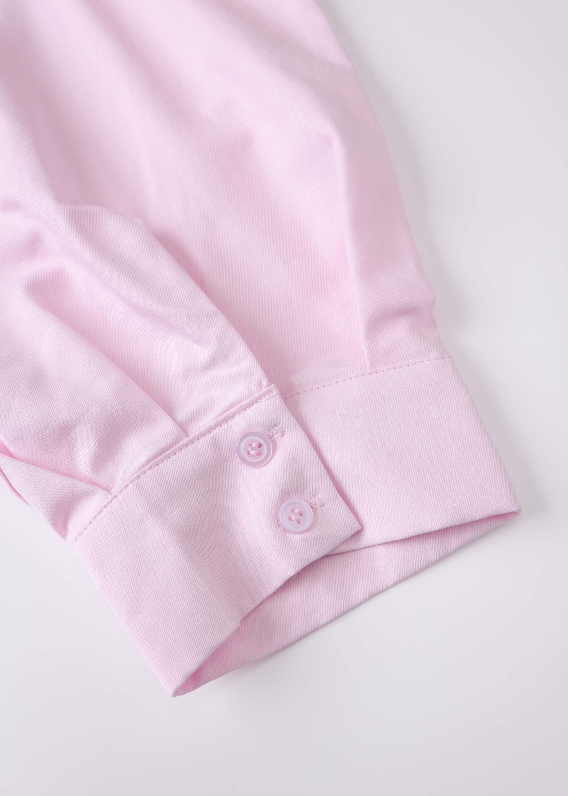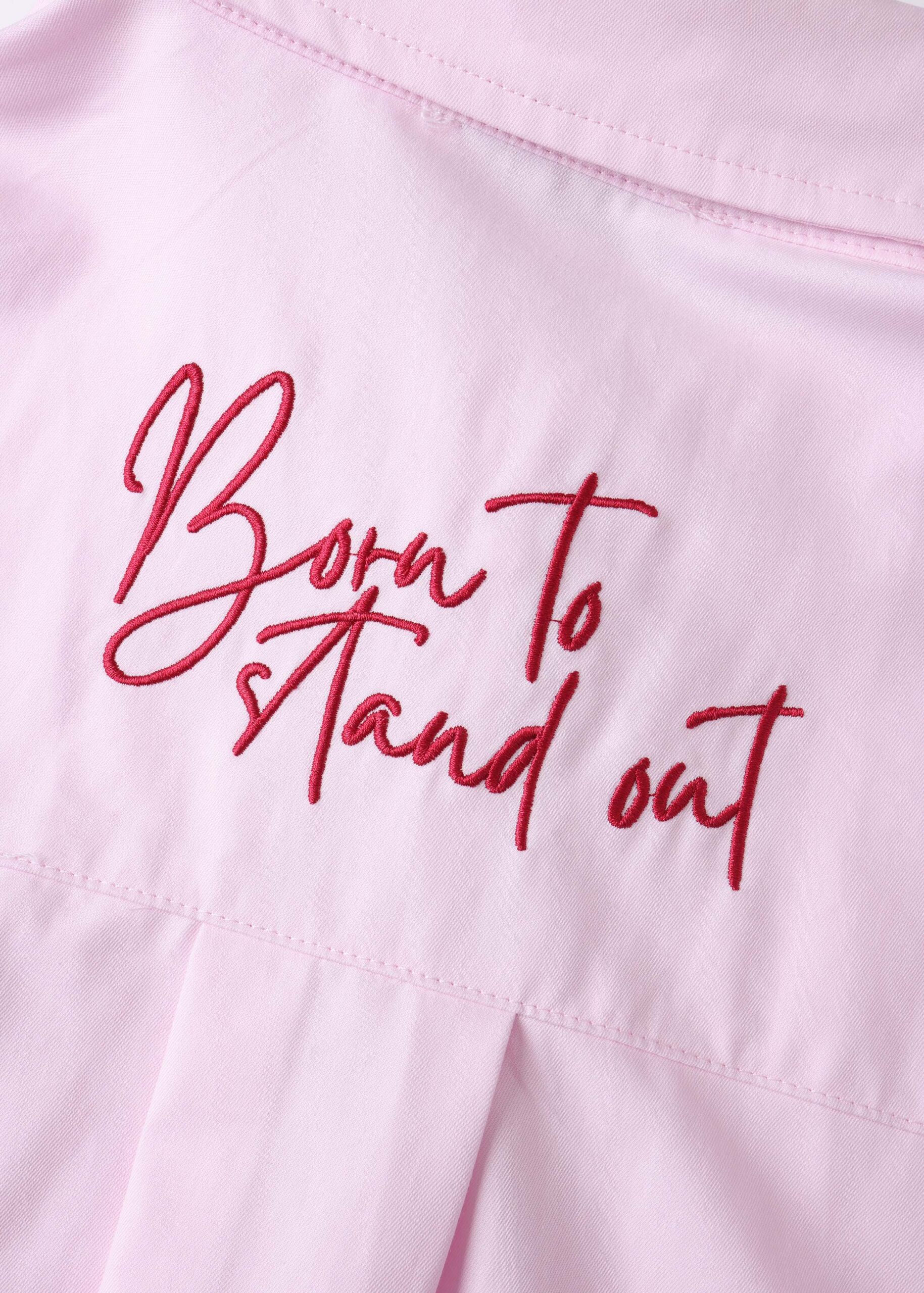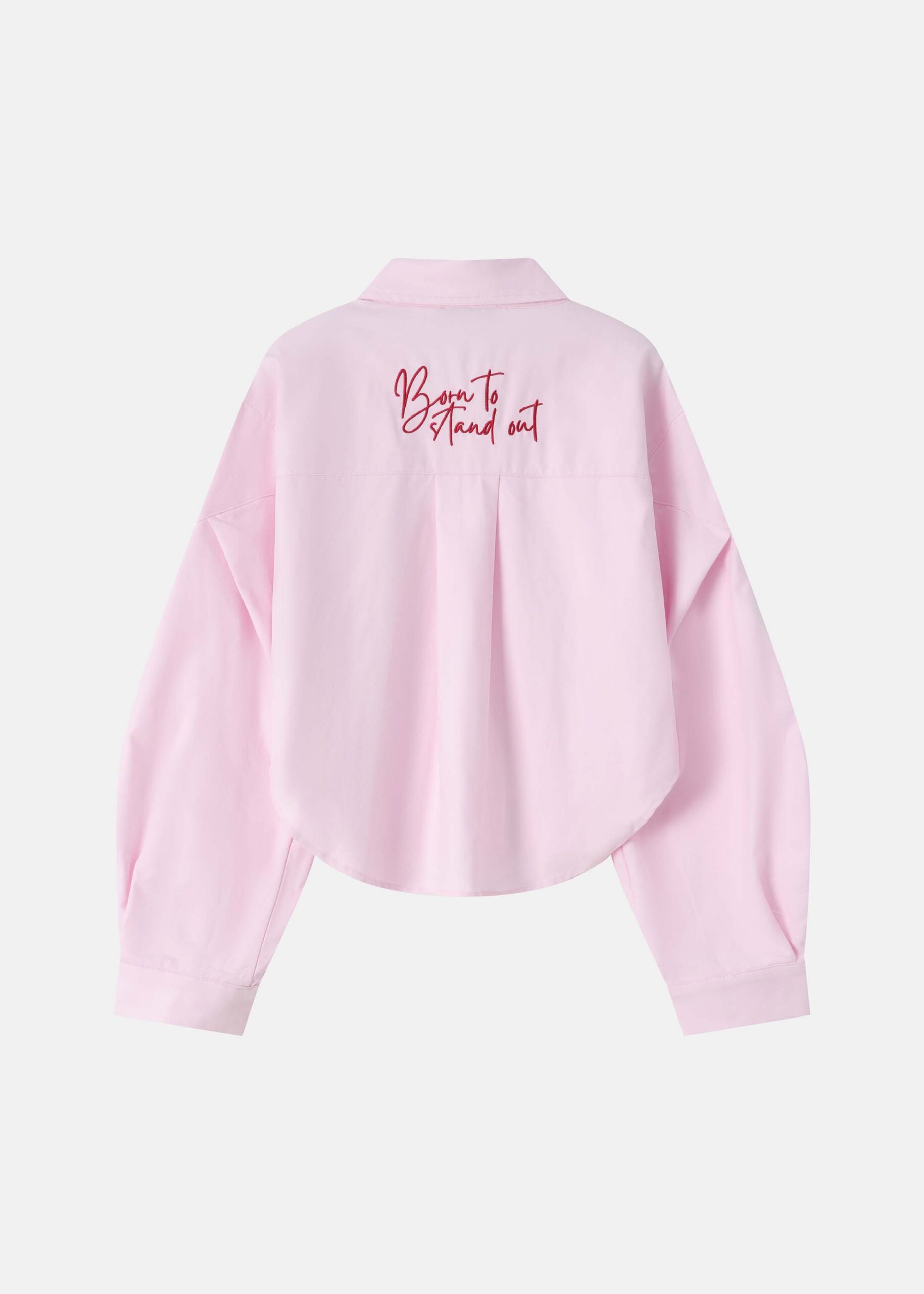 Women shirt, cropped, high-low hem, rolled collar, front buttons to close, long puff sleeves with pleats decor, “born to stand out” embroidered from the back, unique and modern