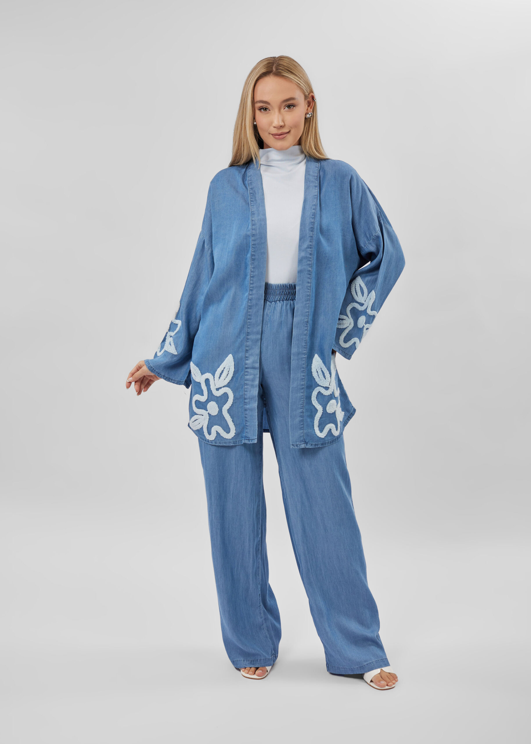 Women trouser, flow, denim, elastic waist, front pockets, practical and comfortable