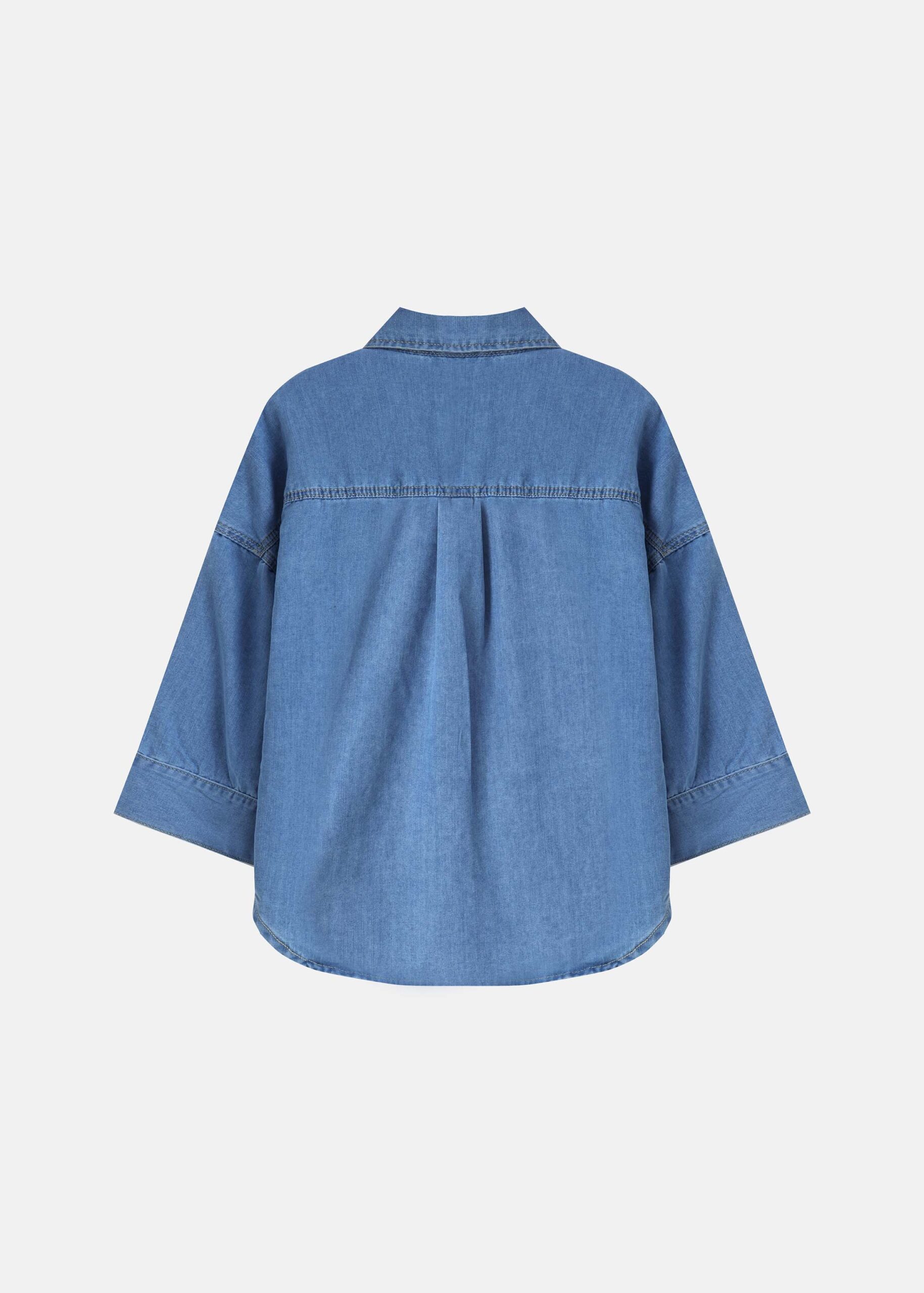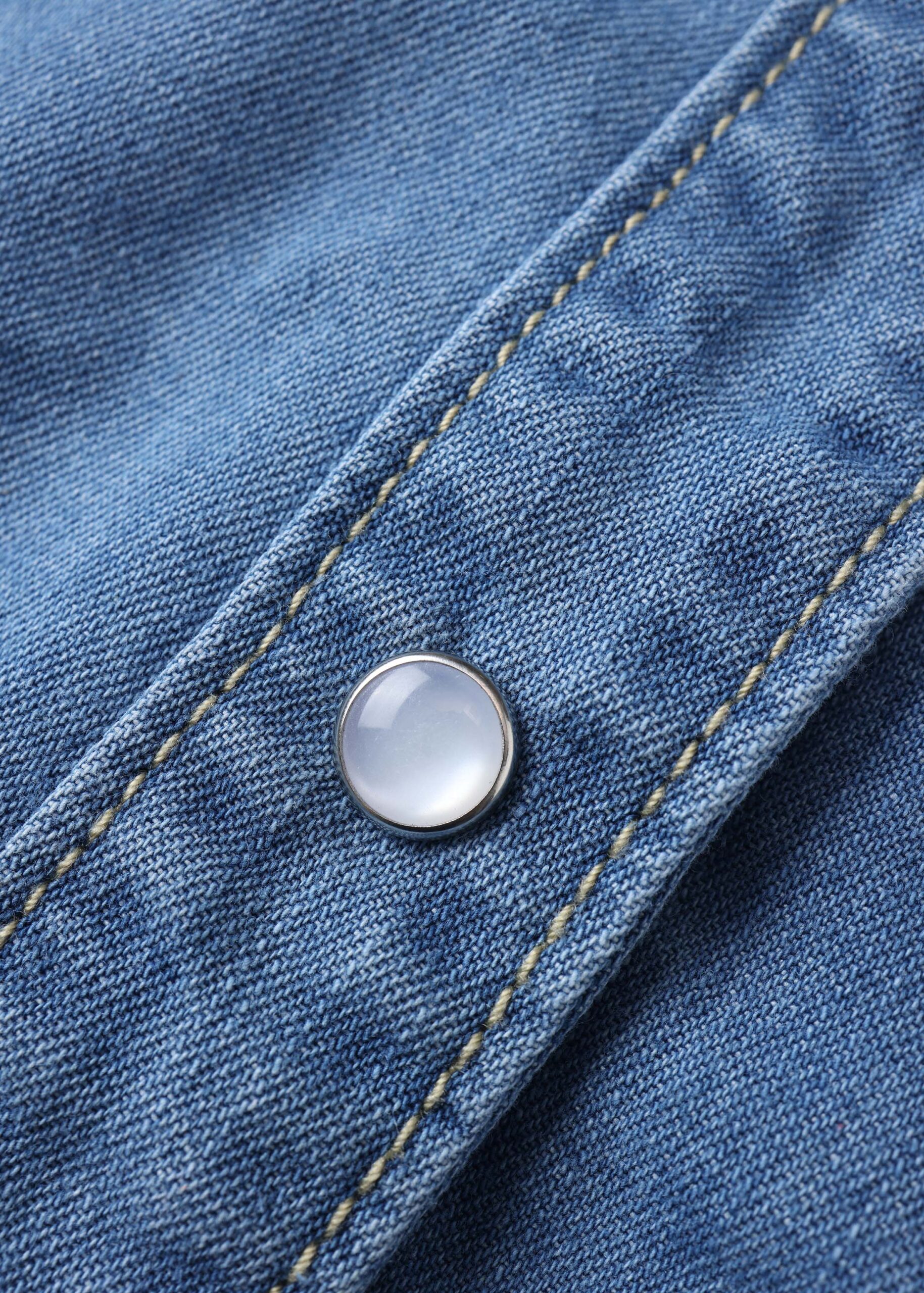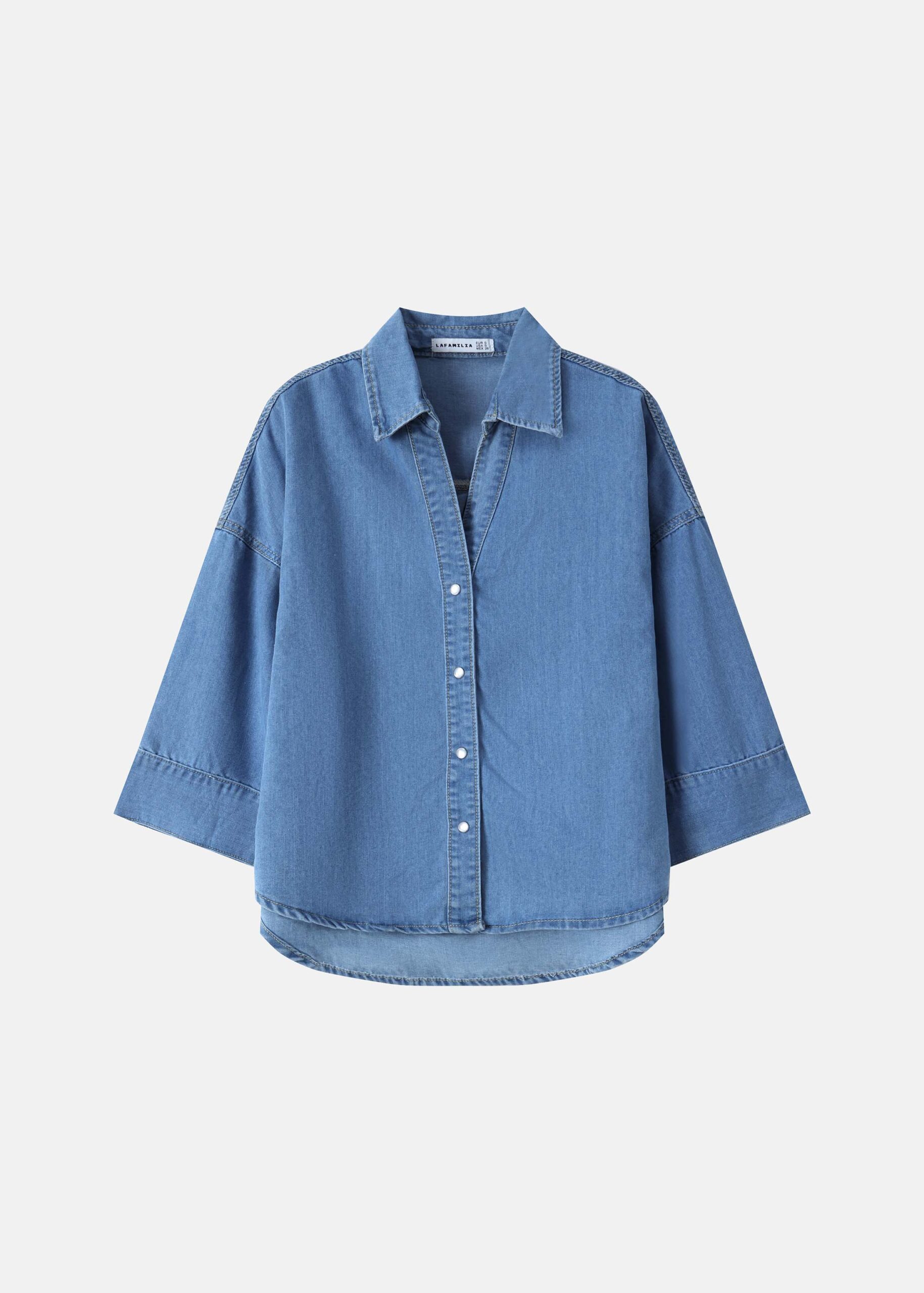 Women shirt, denim, rolled collar with V neckline, front buttons to close, mid-length sleeves, unique and practical