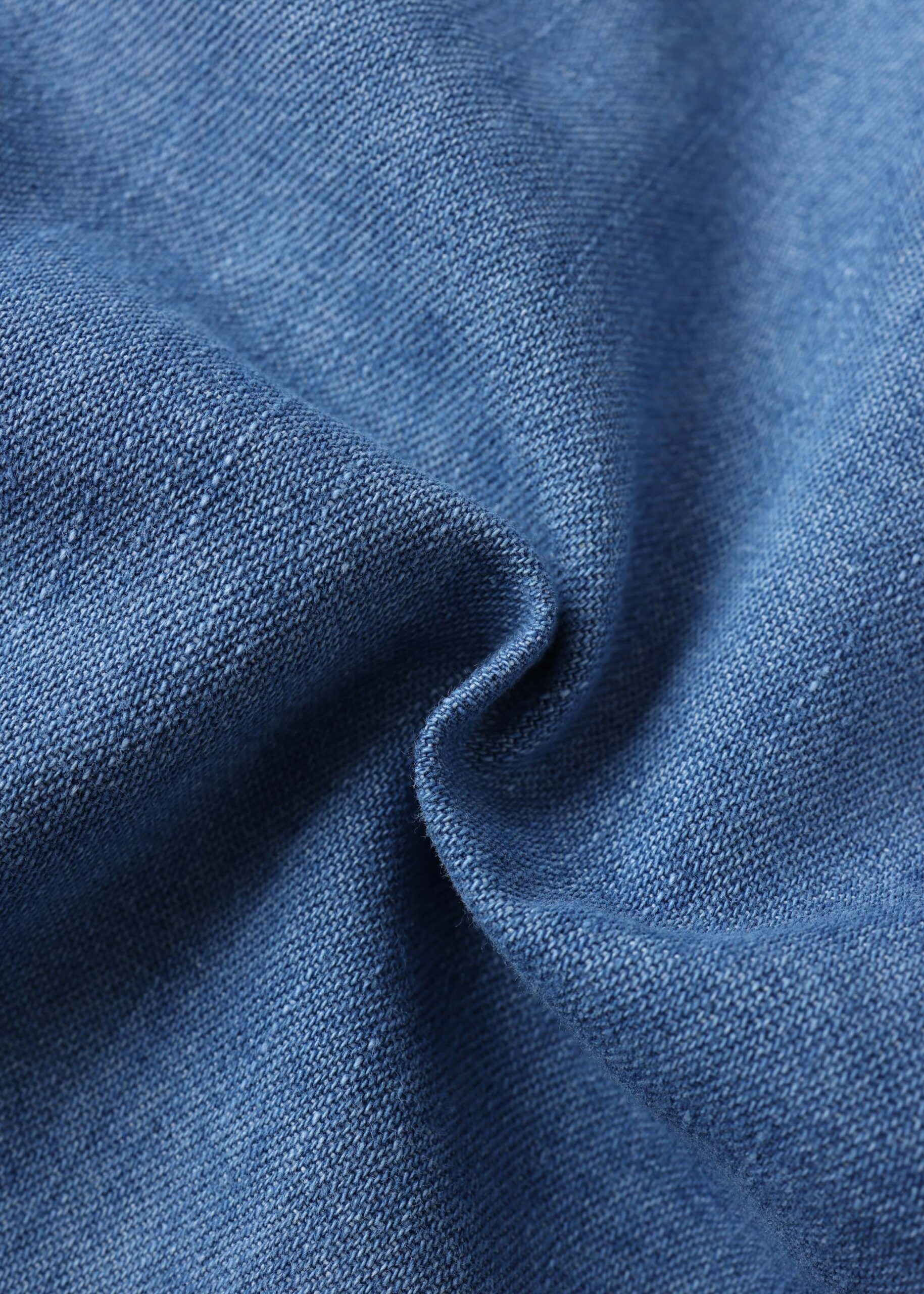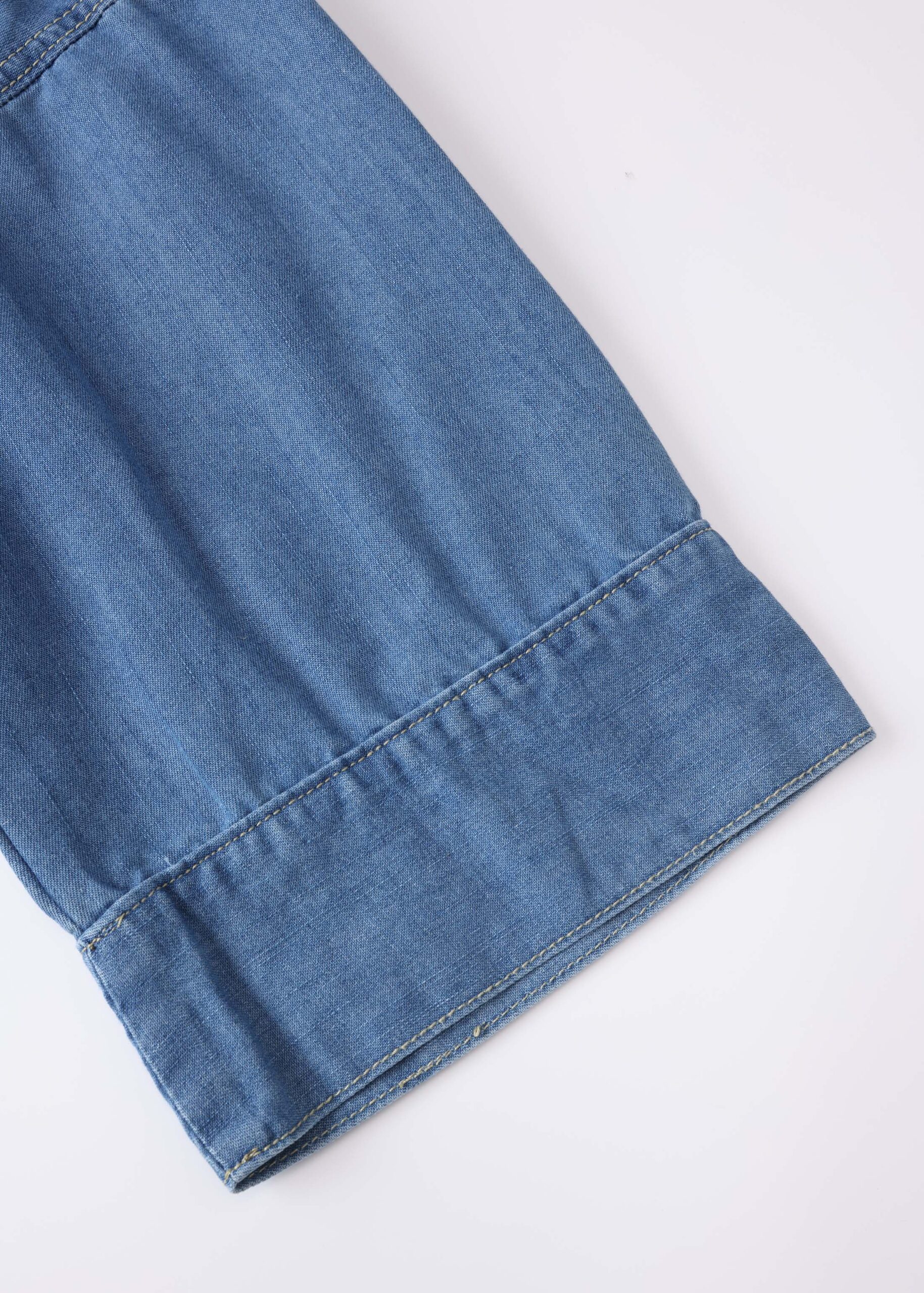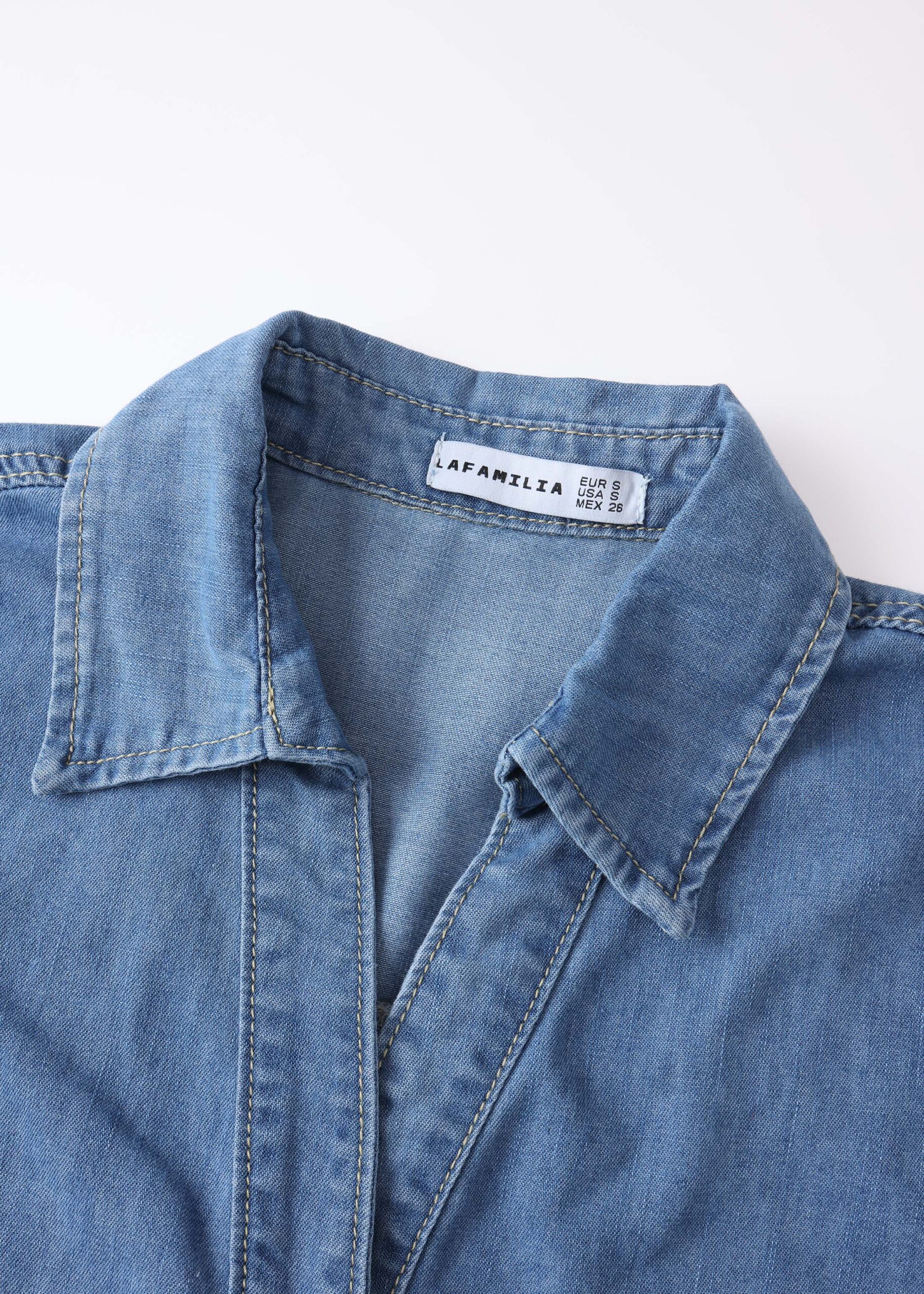 Women shirt, denim, rolled collar with V neckline, front buttons to close, mid-length sleeves, unique and practical