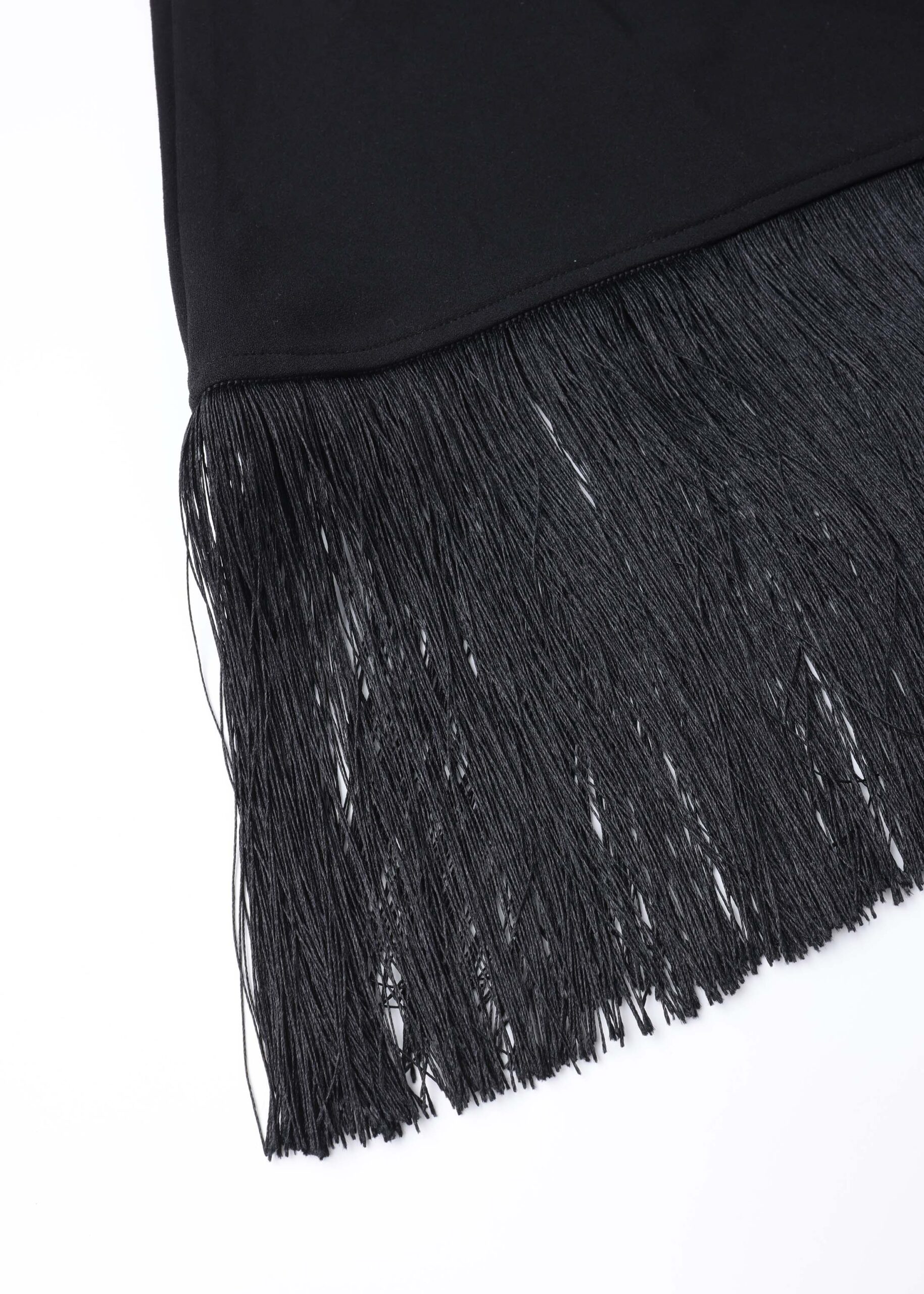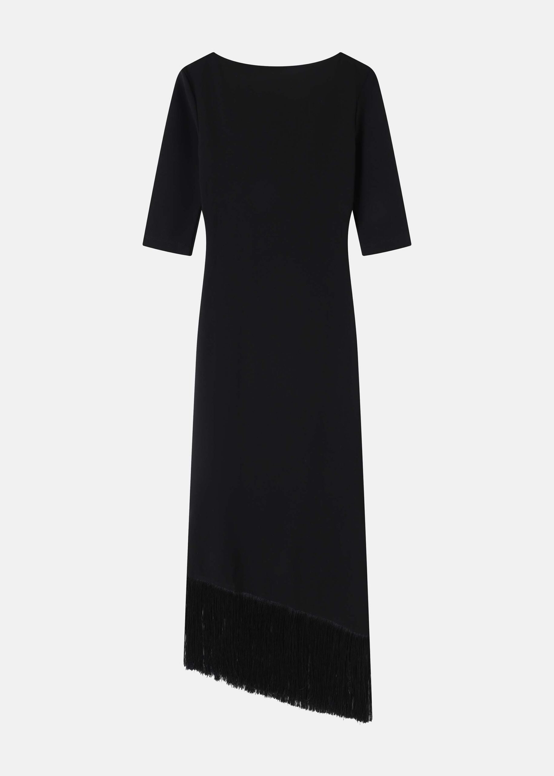 Women dress, midi, draped design, short sleeves with drapped shoulder, boat neck, assymetrical hem adorned with long fringe, unique and modern