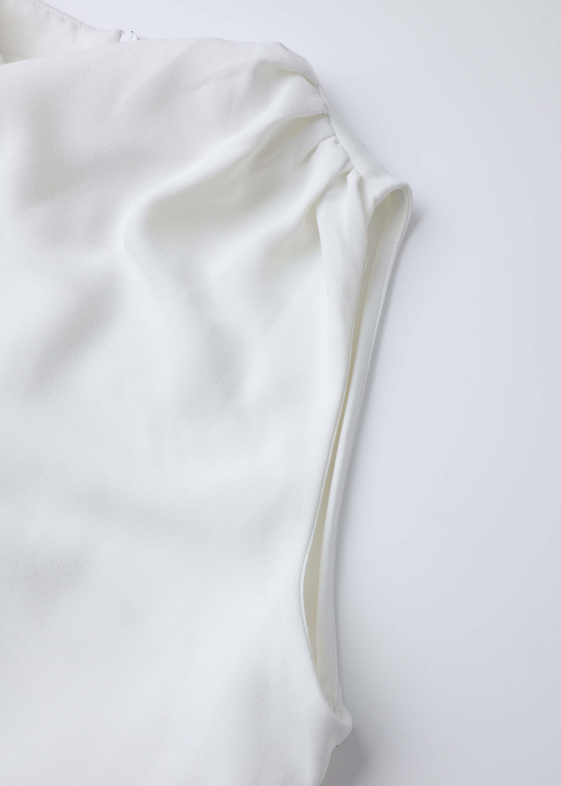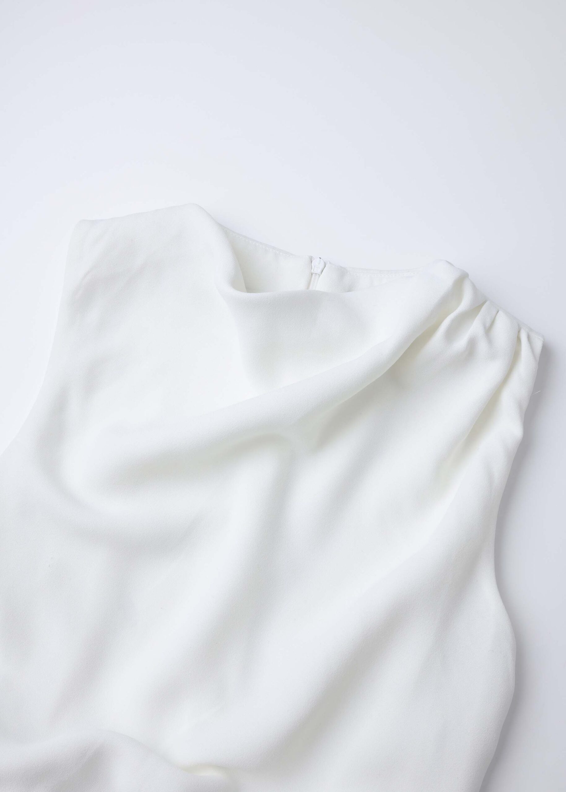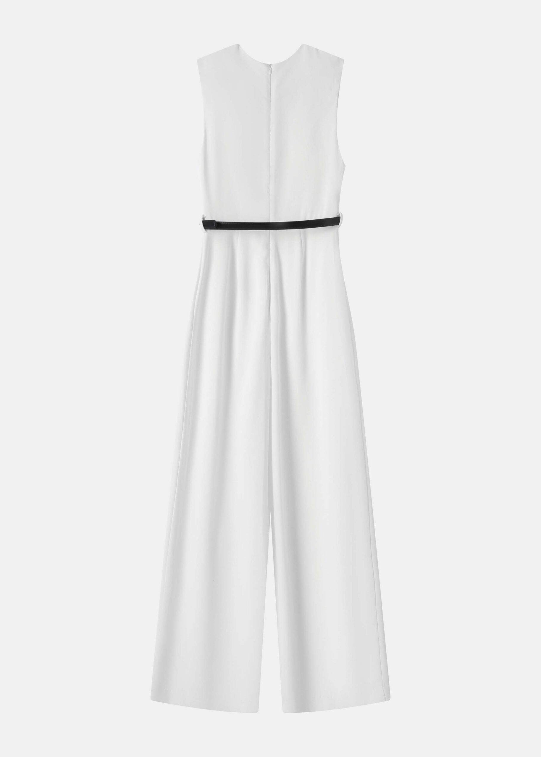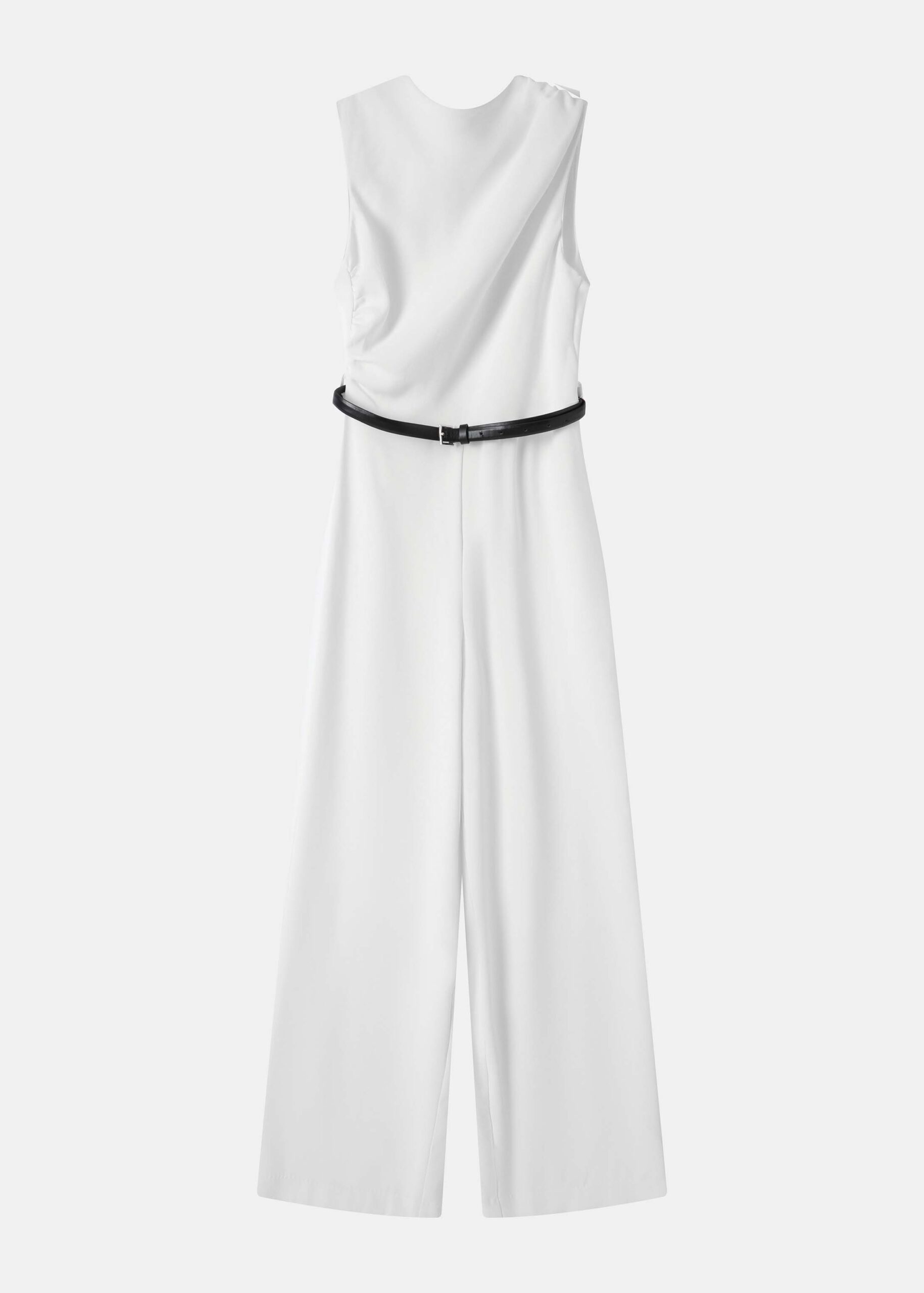 Women jumpsuit, draped neck, sleeveless, wide straps, waist belt, back zipper closure, unique and modern