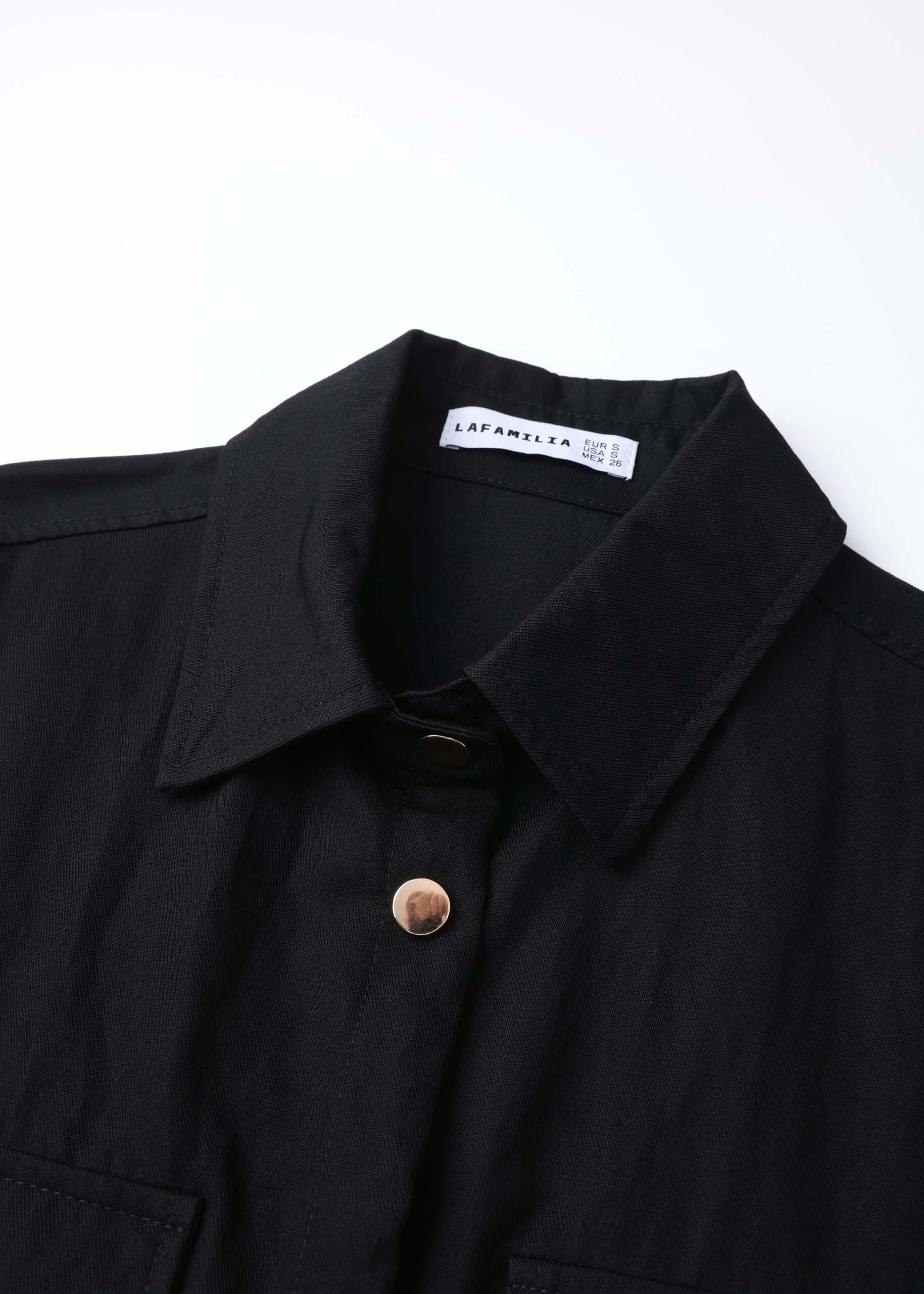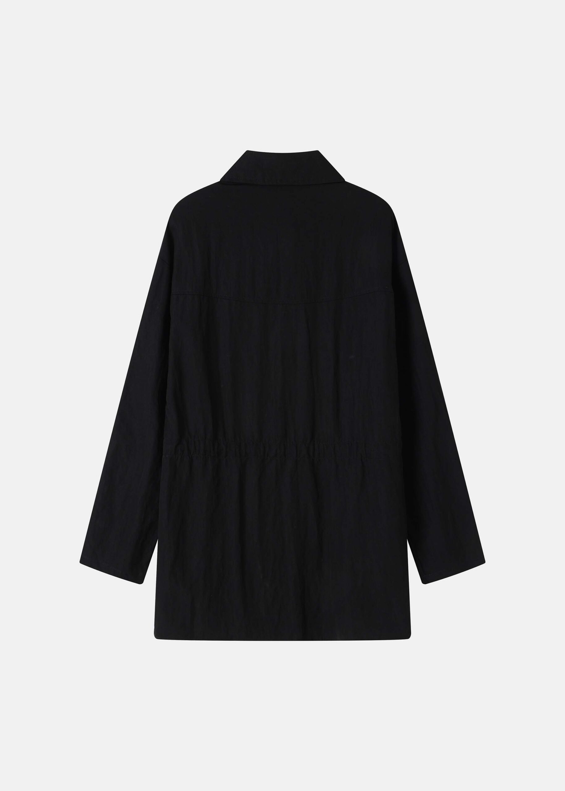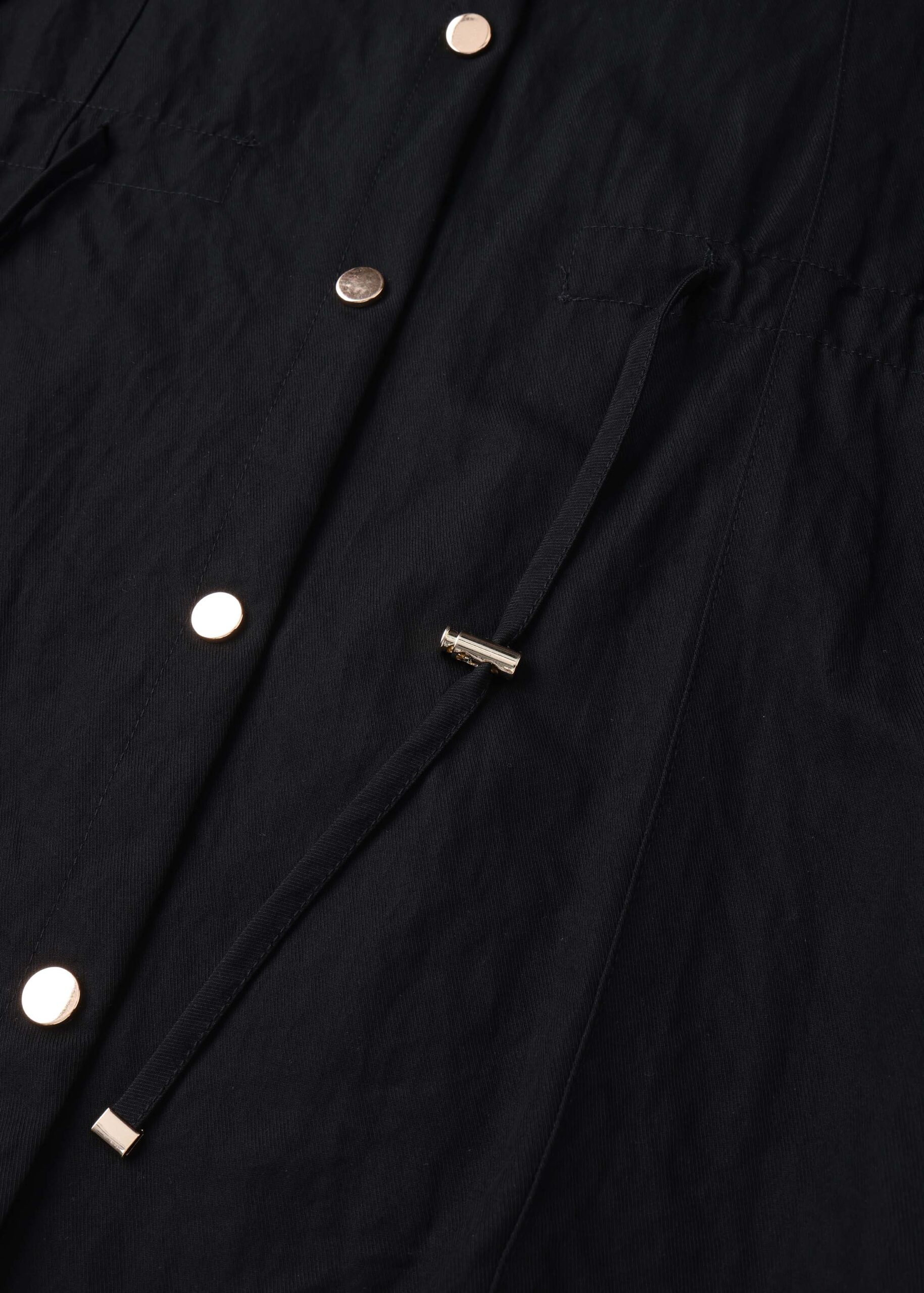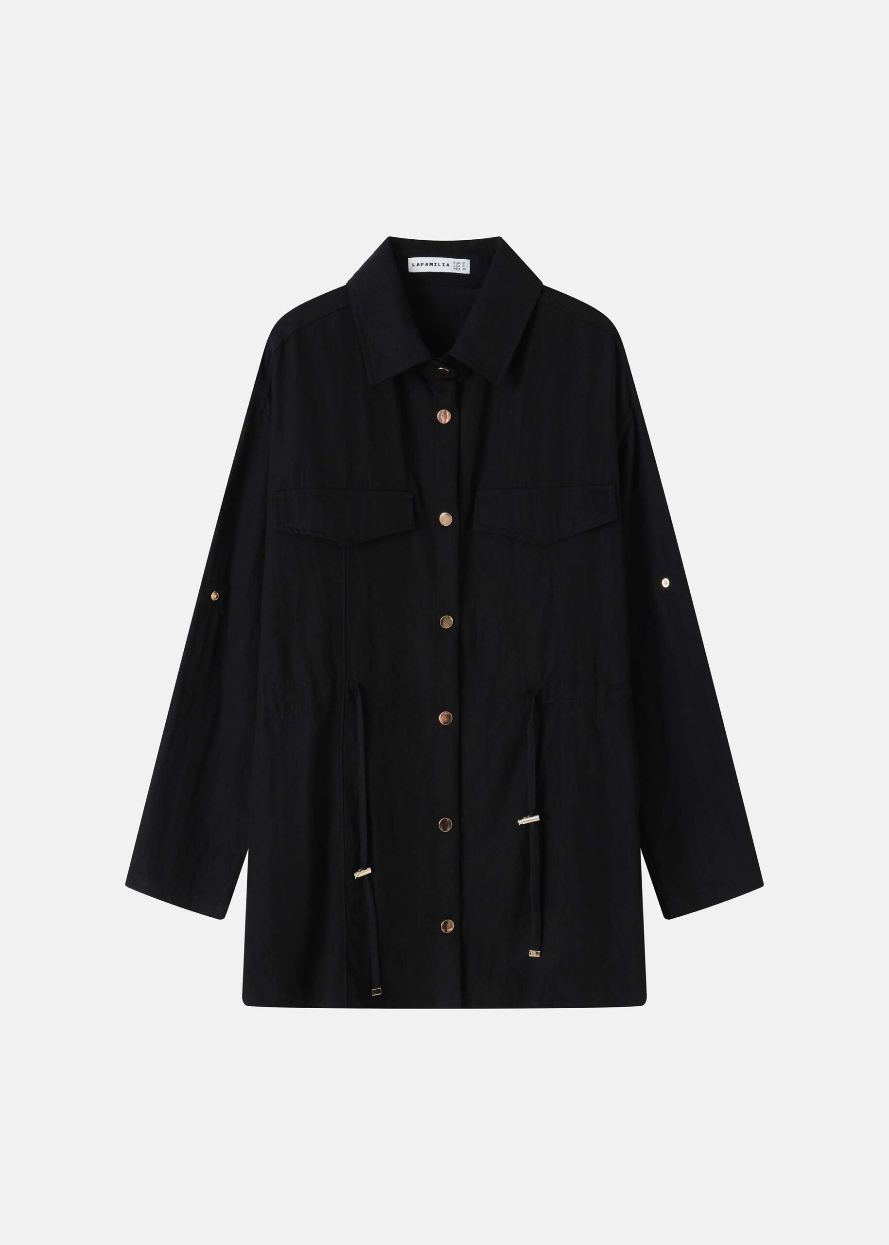Women jacket, rolled collar, front buttons to close, long sleeves with buttons, flap pockets, adjustable drawstring tie, unique and modern