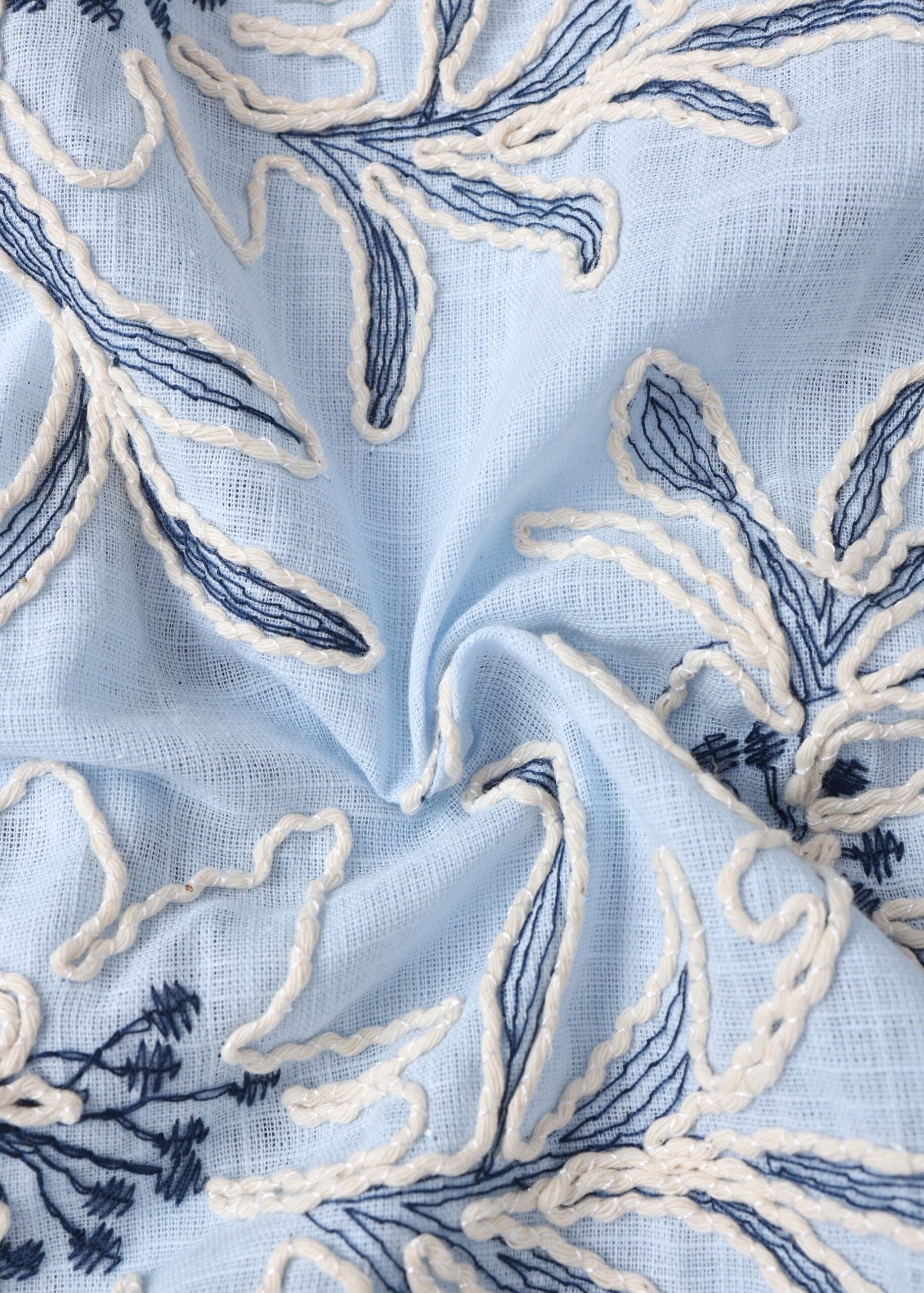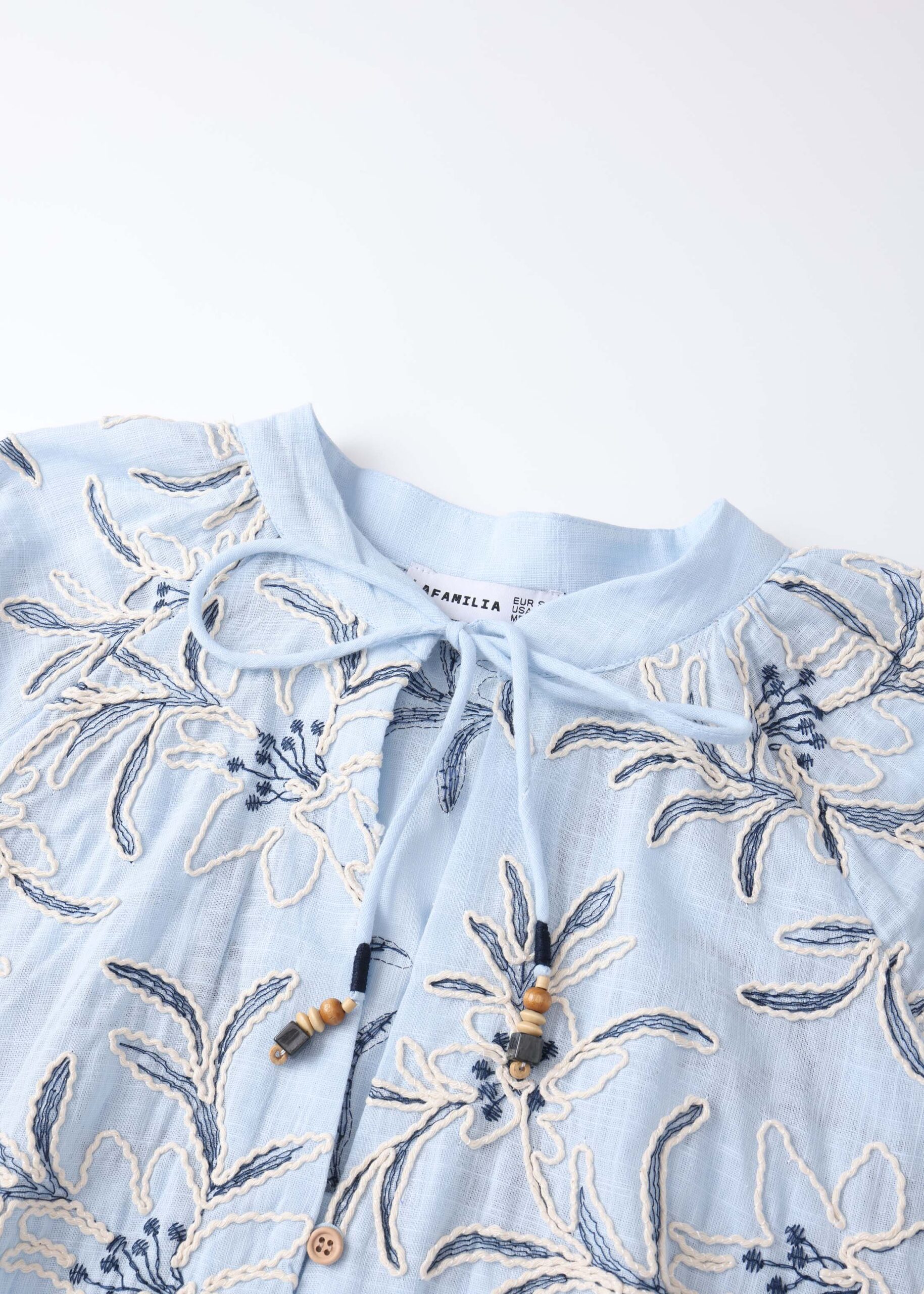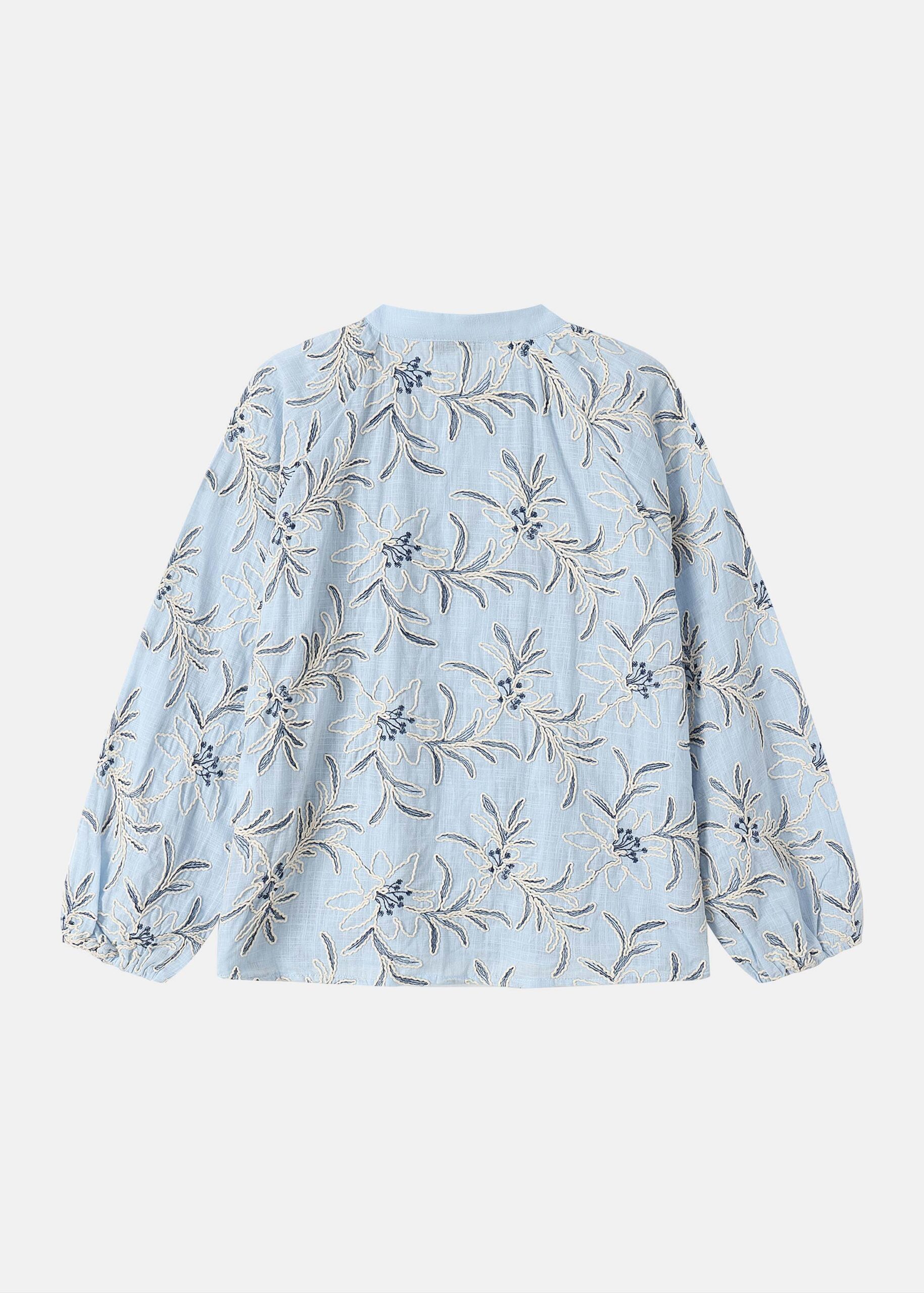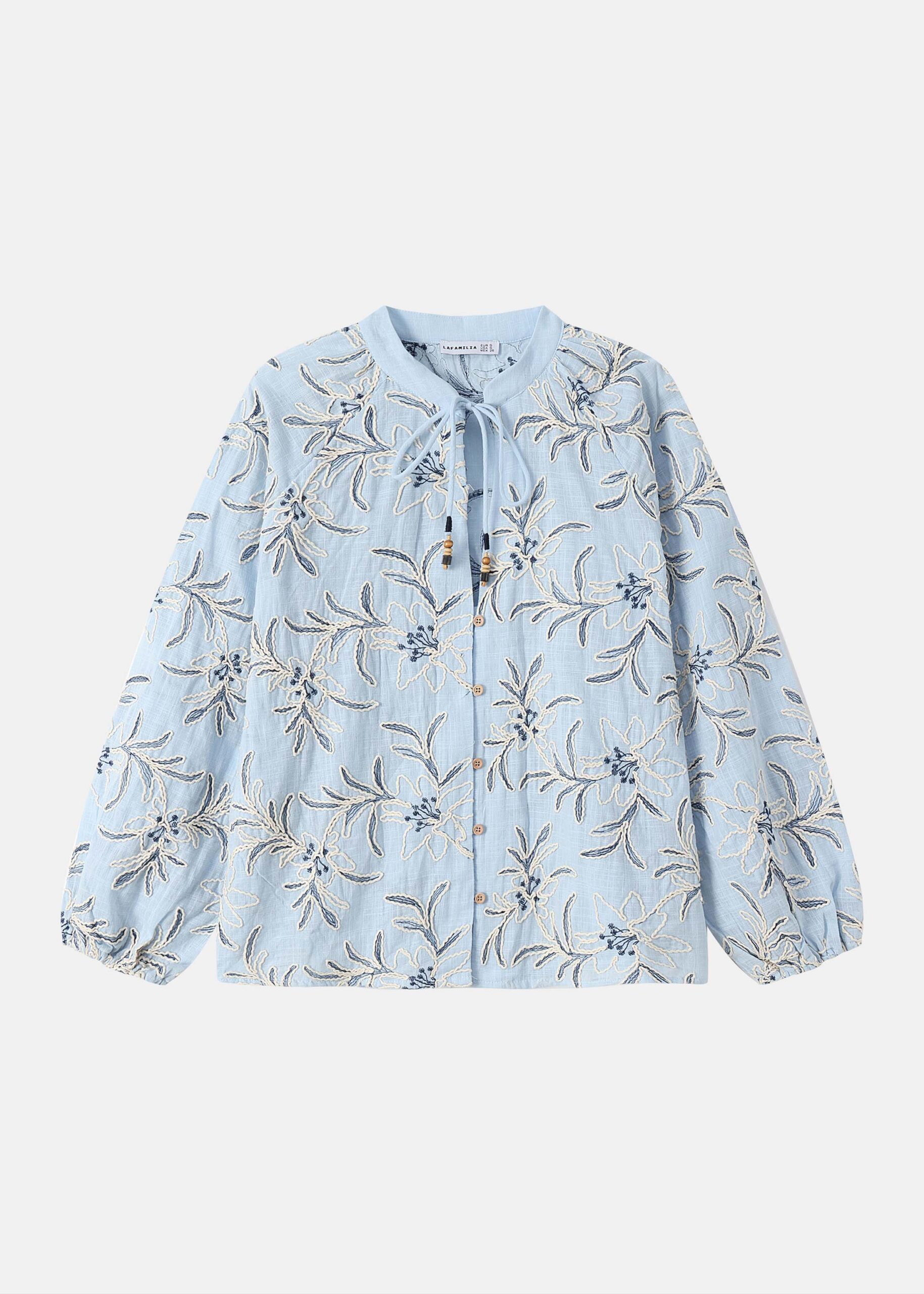 Women blouse, embroidered printed, round neck with V neckline and front tie, long sleeves with tight cuff, front buttons, unique and modern