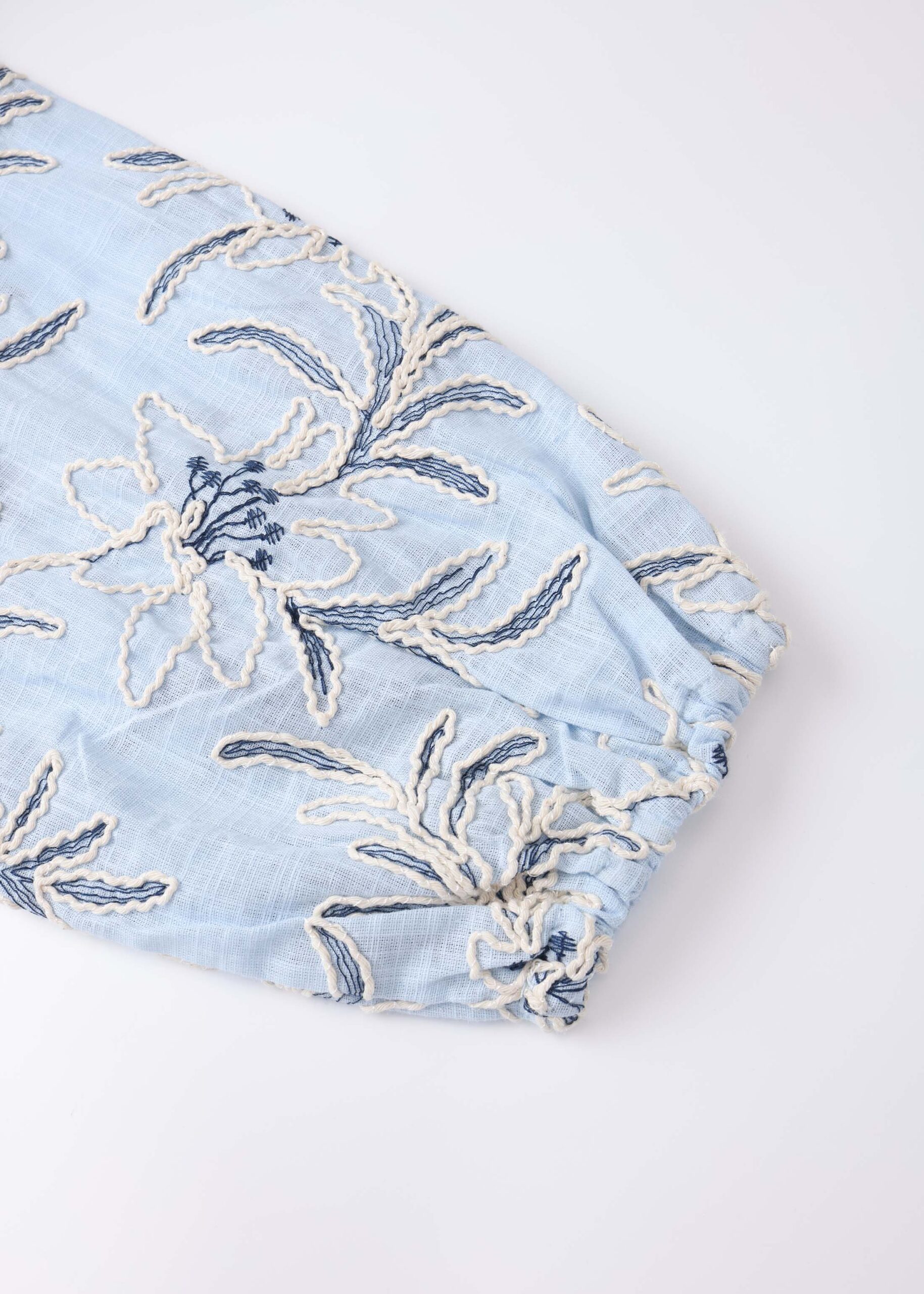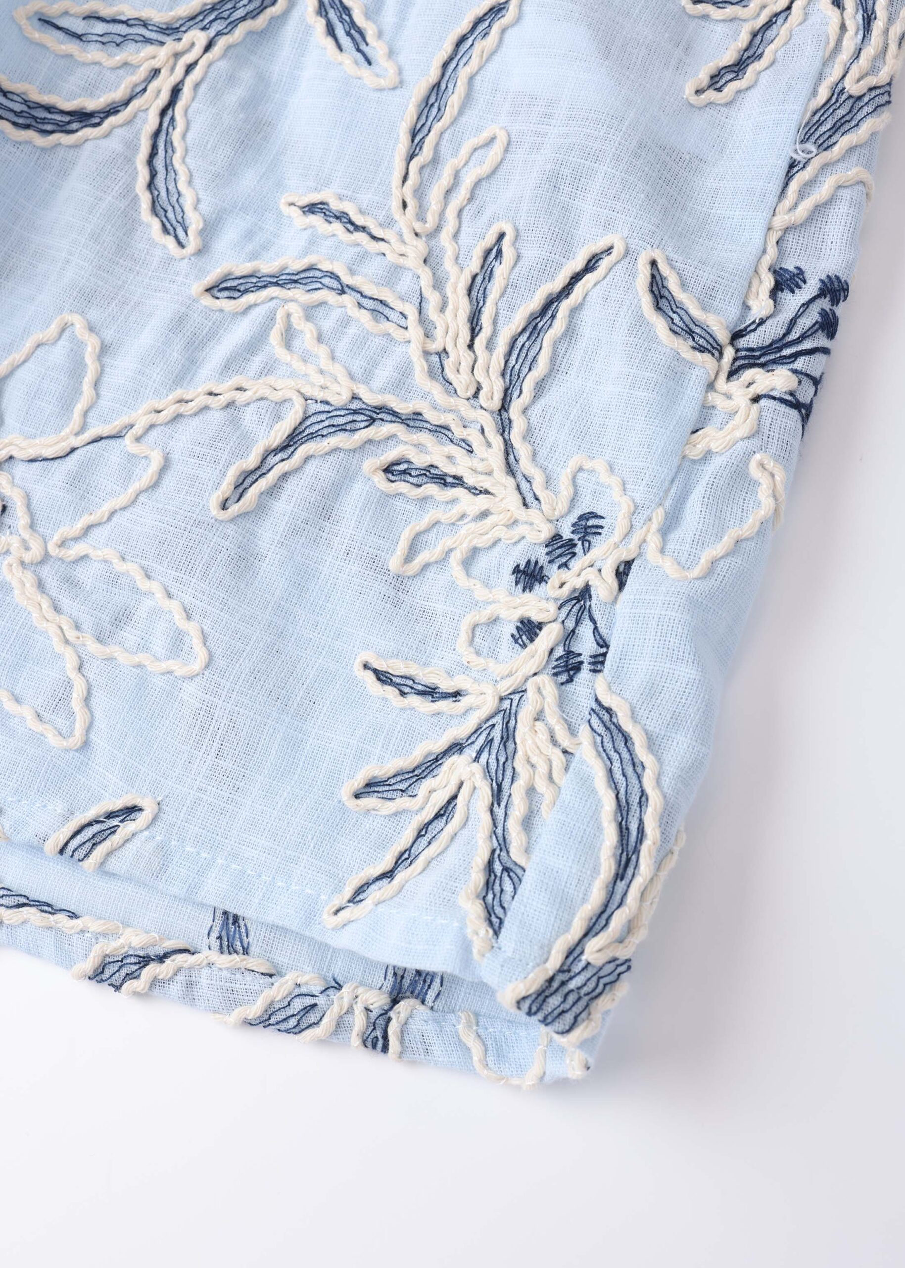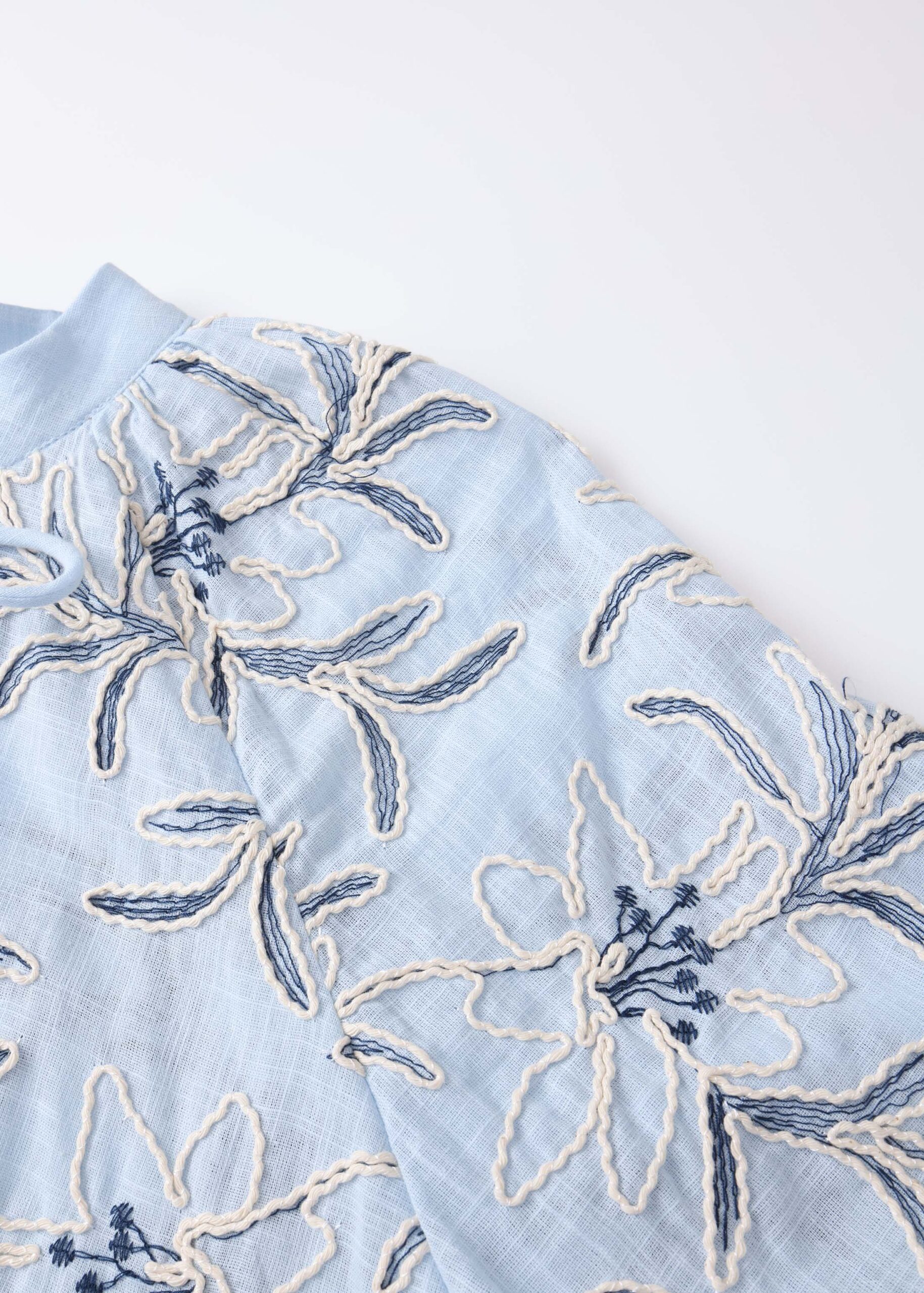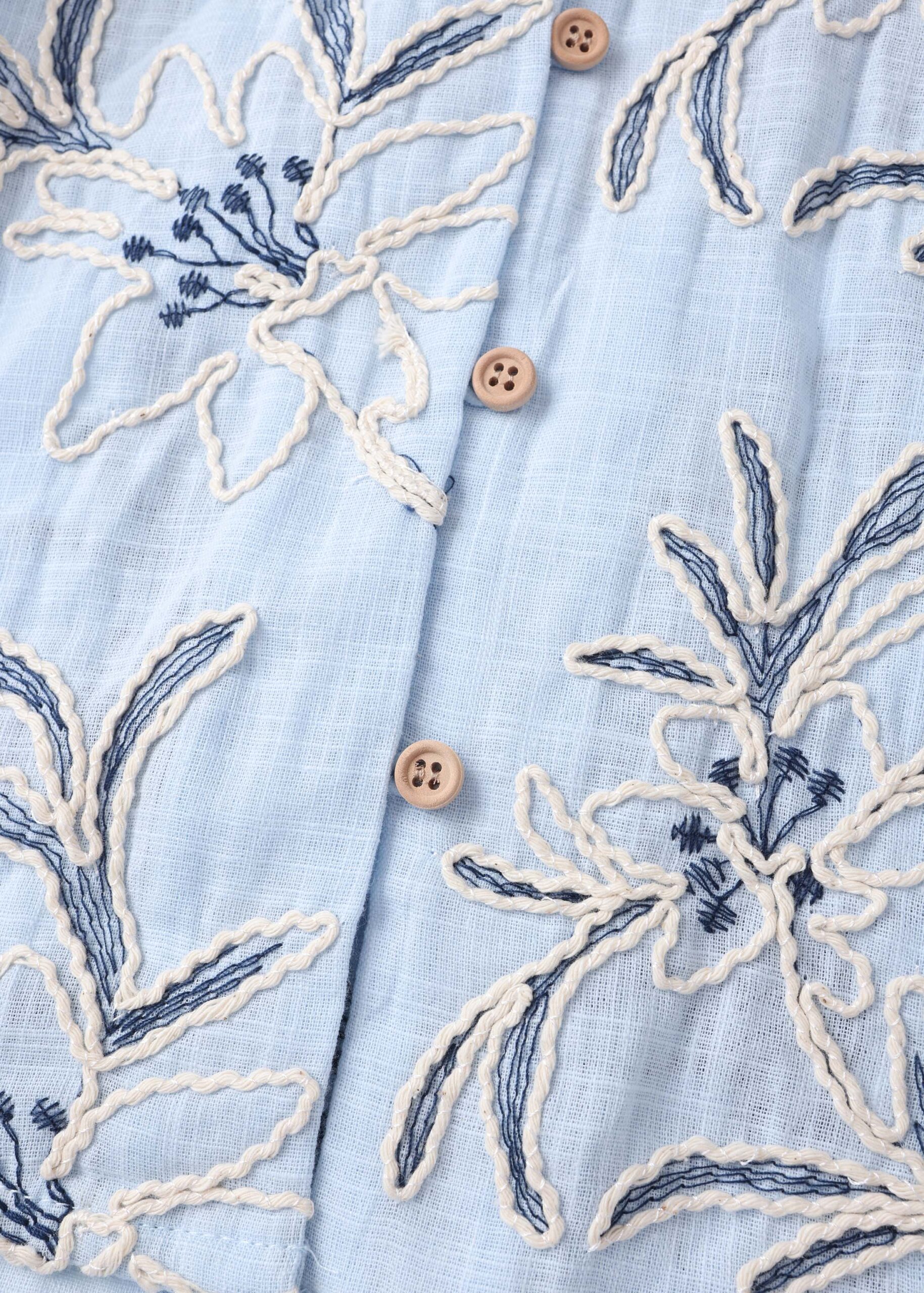Women blouse, embroidered printed, round neck with V neckline and front tie, long sleeves with tight cuff, front buttons, unique and modern