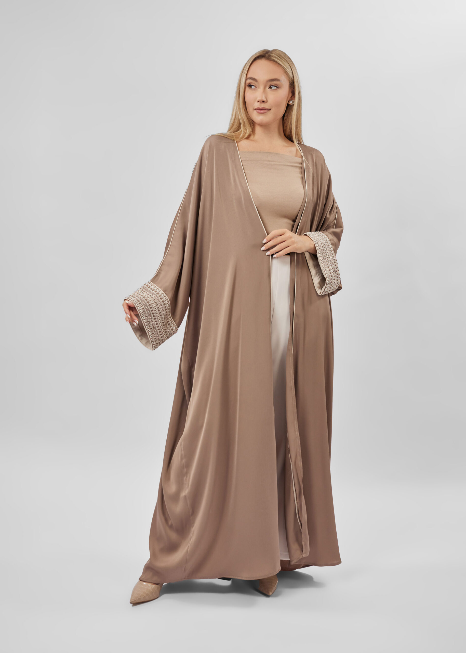 Women abaya, open, striped sides, long sleeves with embroidery cuff, unique and modern