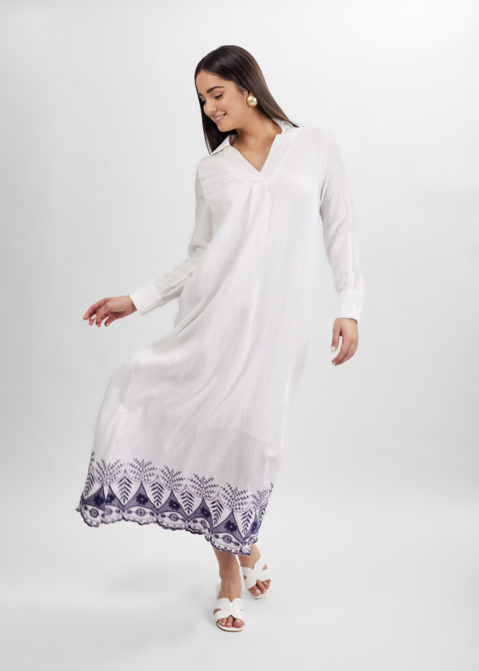 Women dress, long, embroidery, long sleeves with tight cuff, V neck, unique and modern