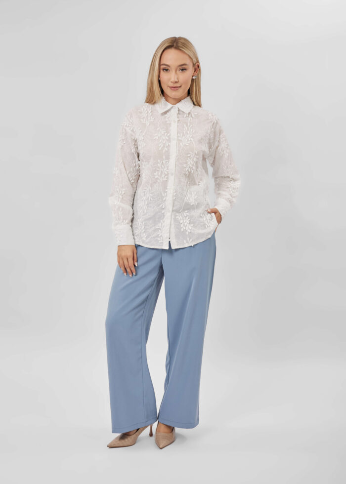 Women shirt, embroidery design, front buttons to close, long sleeves with tight cuff, rolled collar with front button, unique and modern
