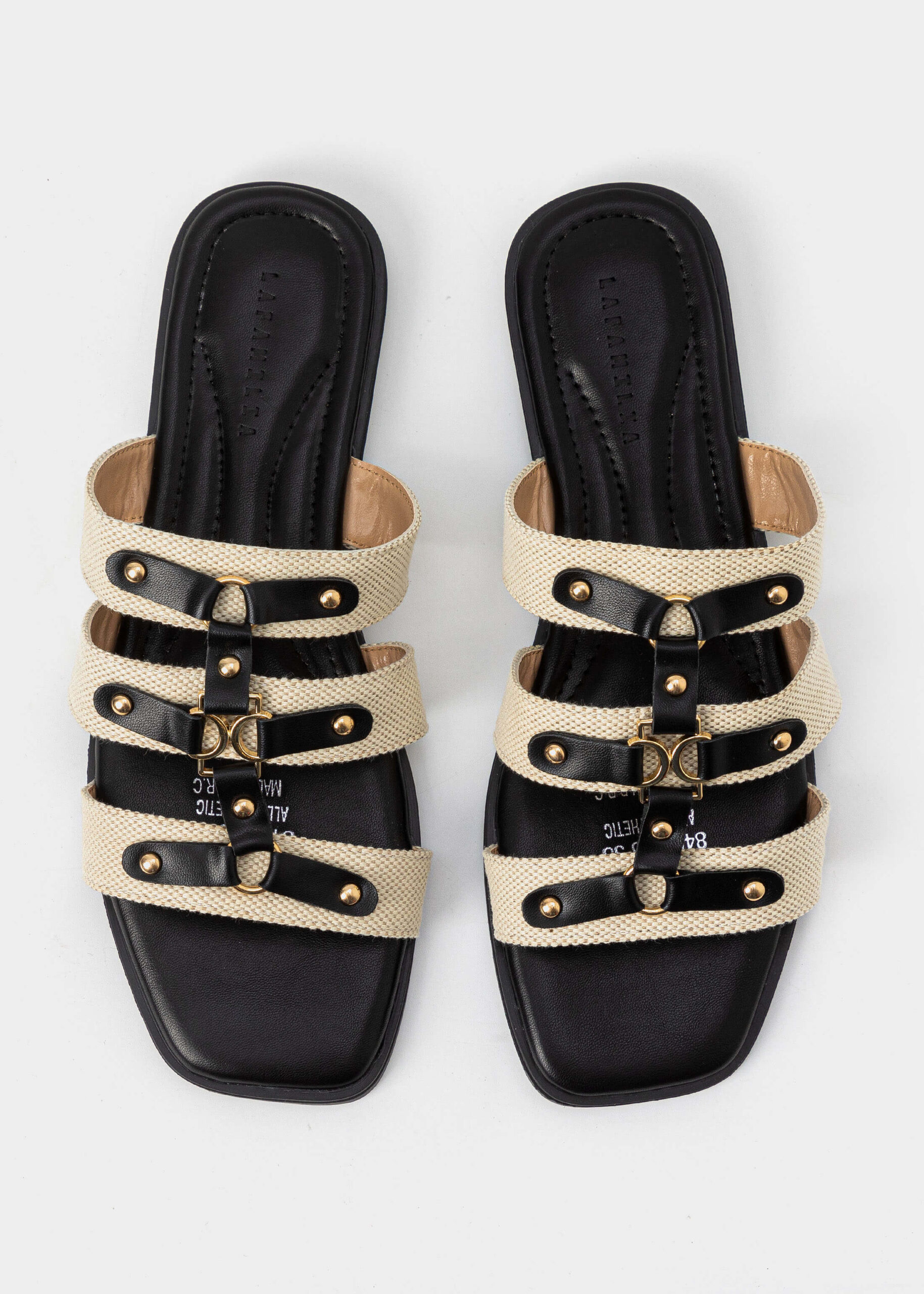 Women slipper, flat, fabric upper straps with leather, open square, toe, unique and practical