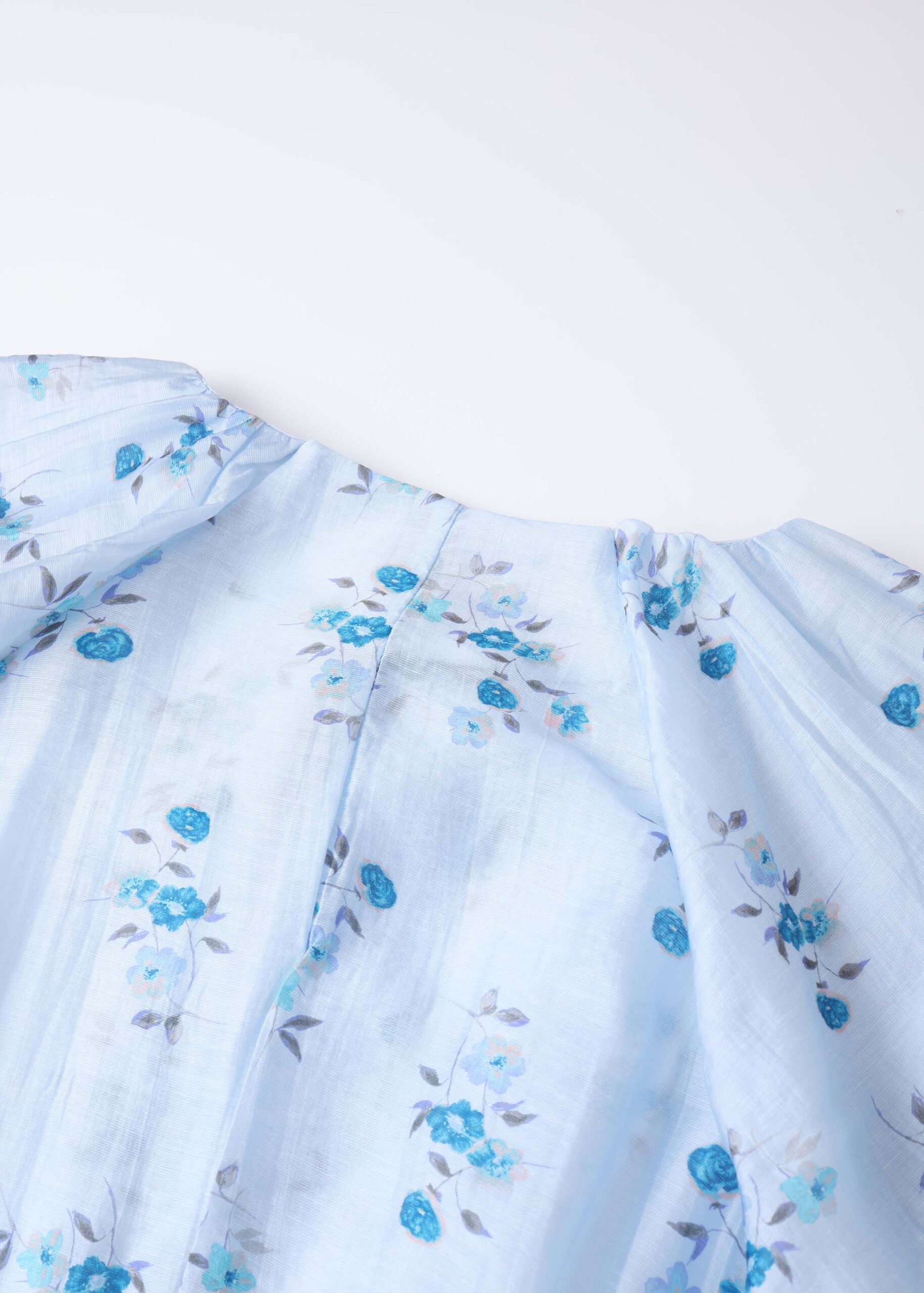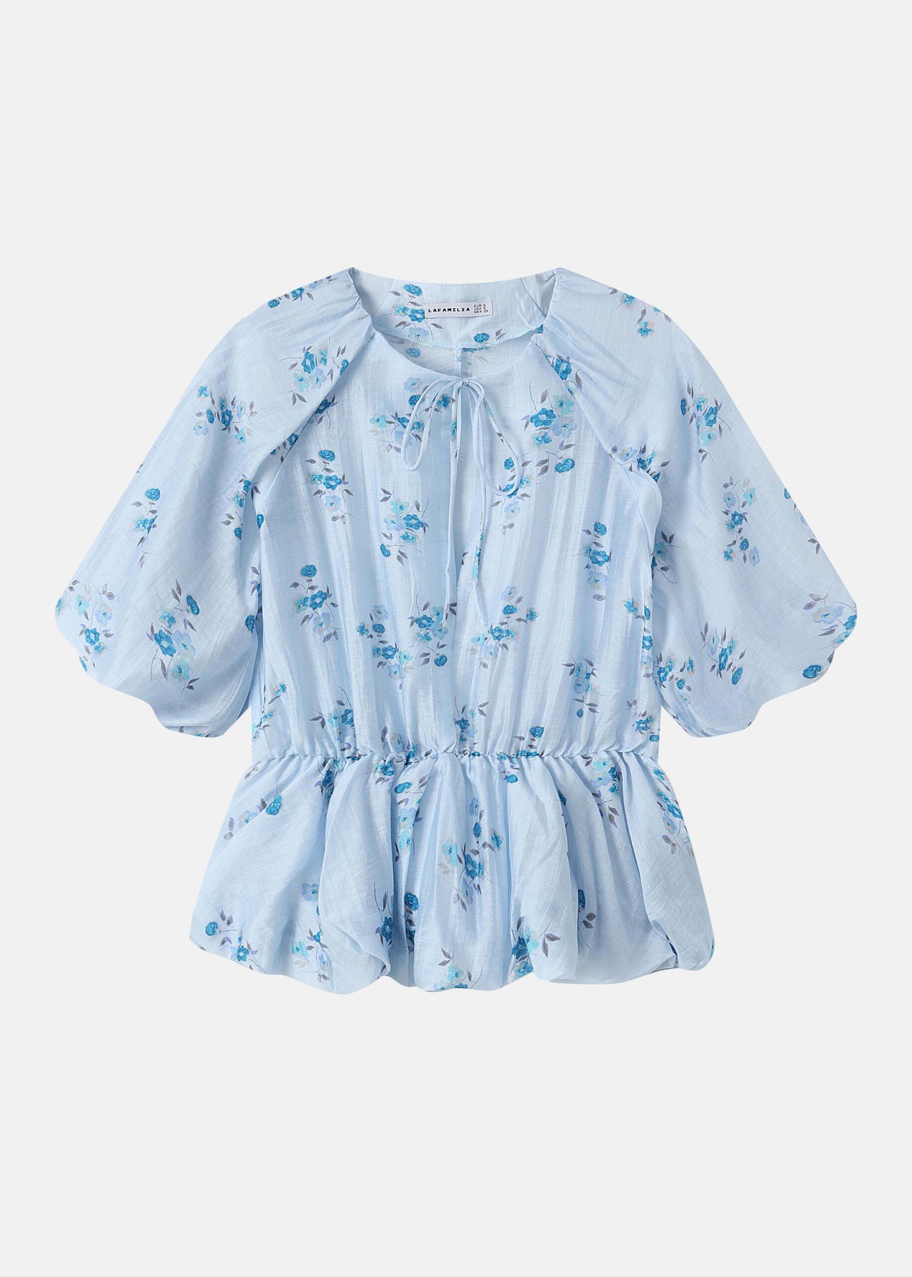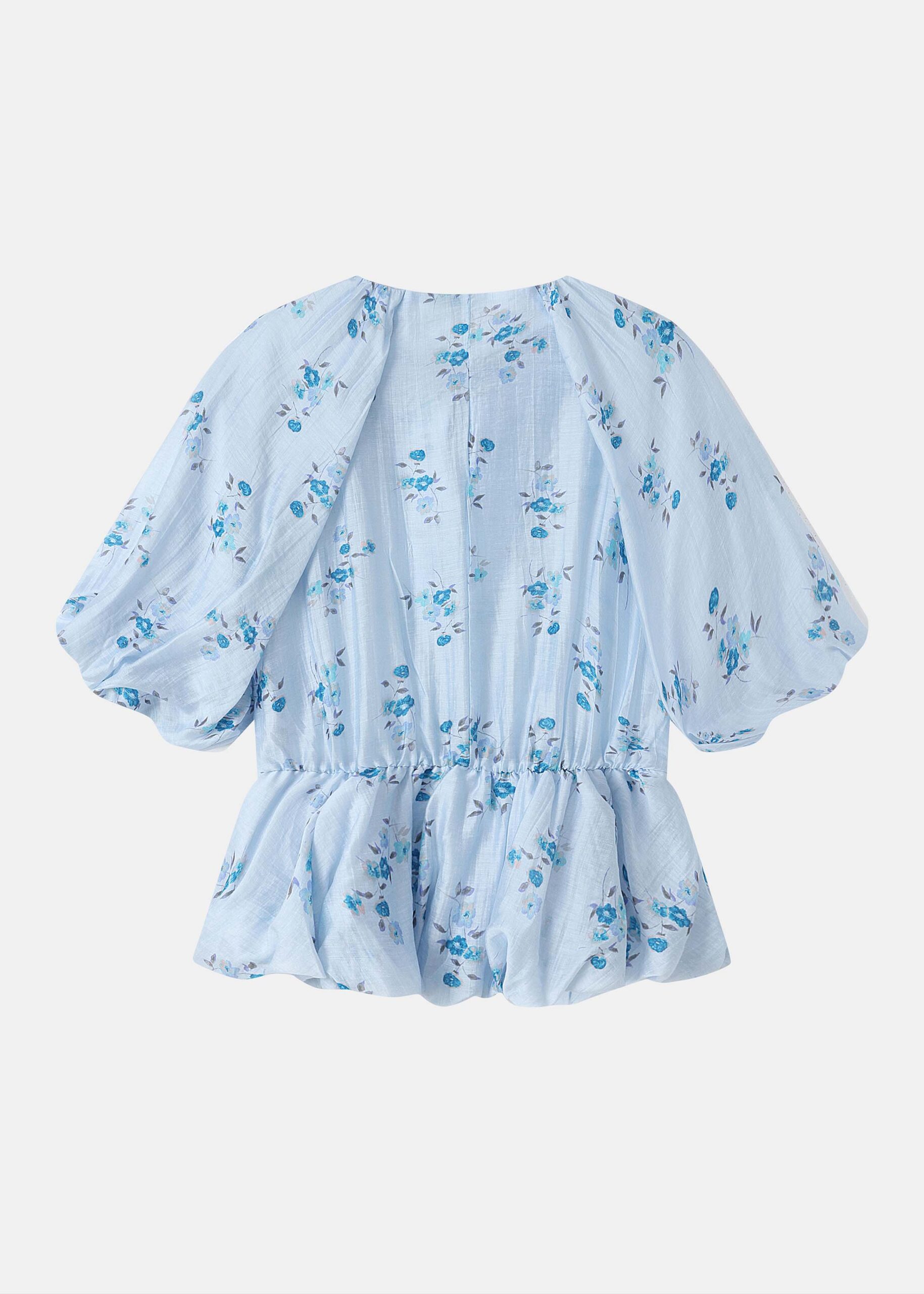Women blouse, floral, smock design, round neck with front tie, short sleeves with elastic cuff, unique and modern