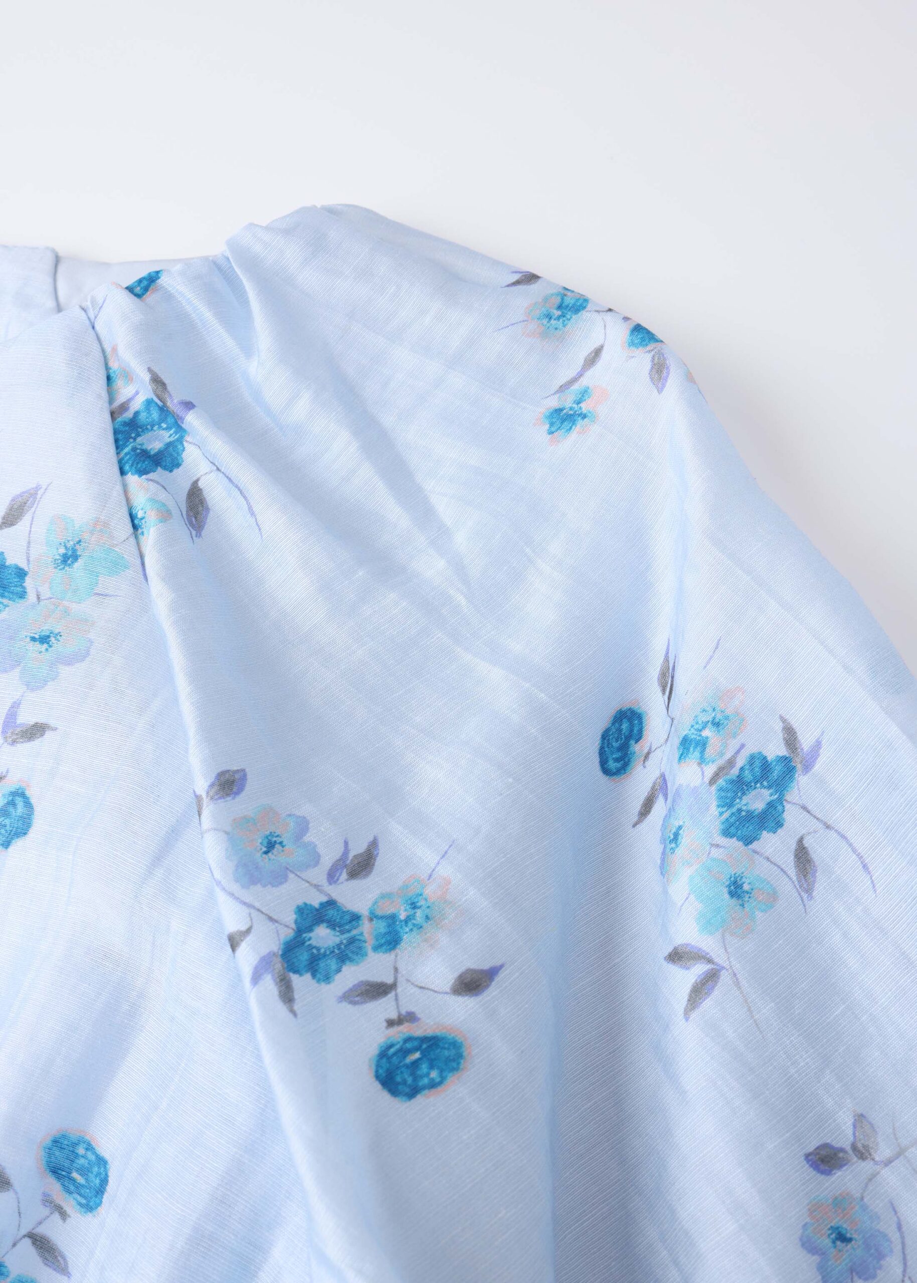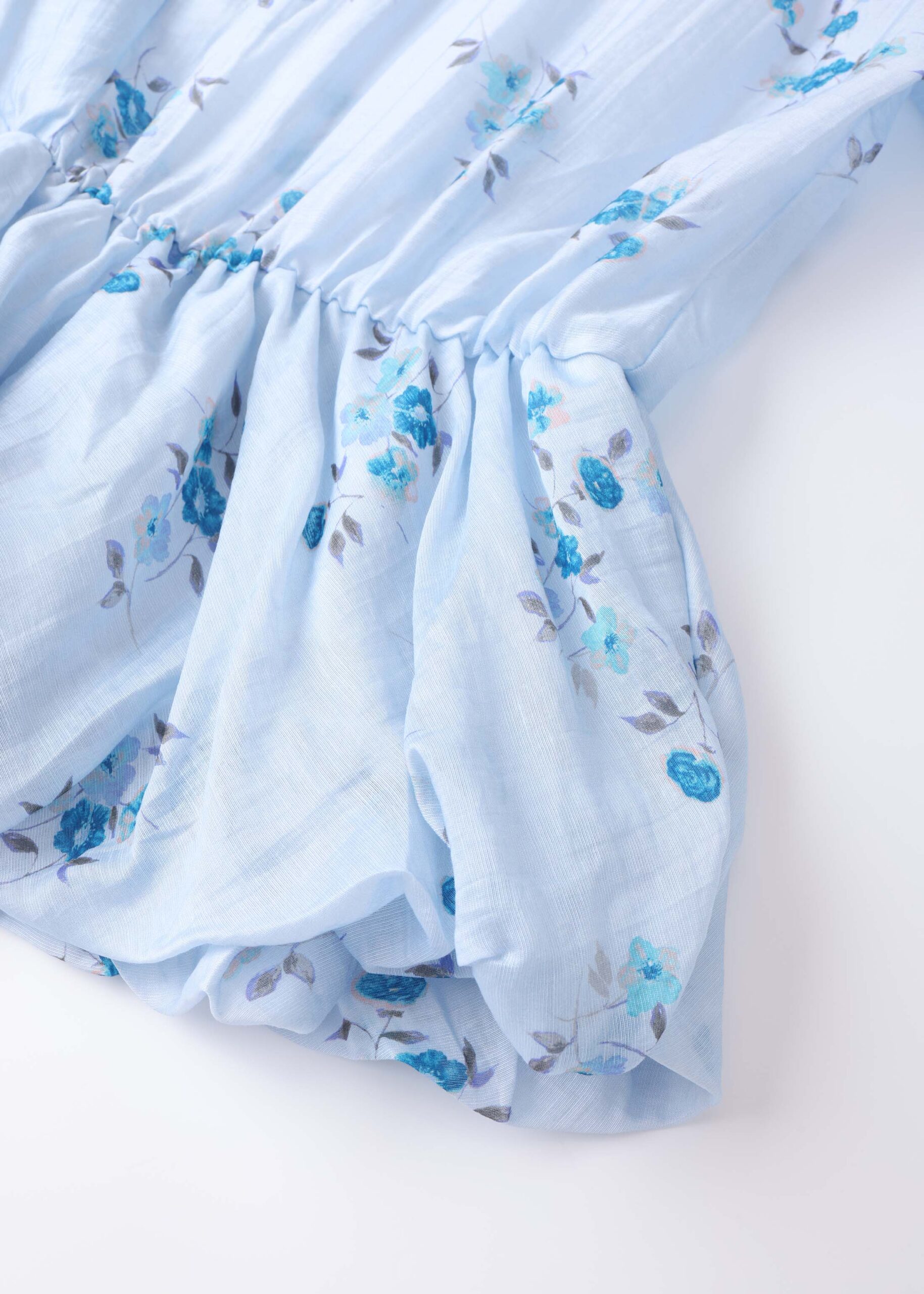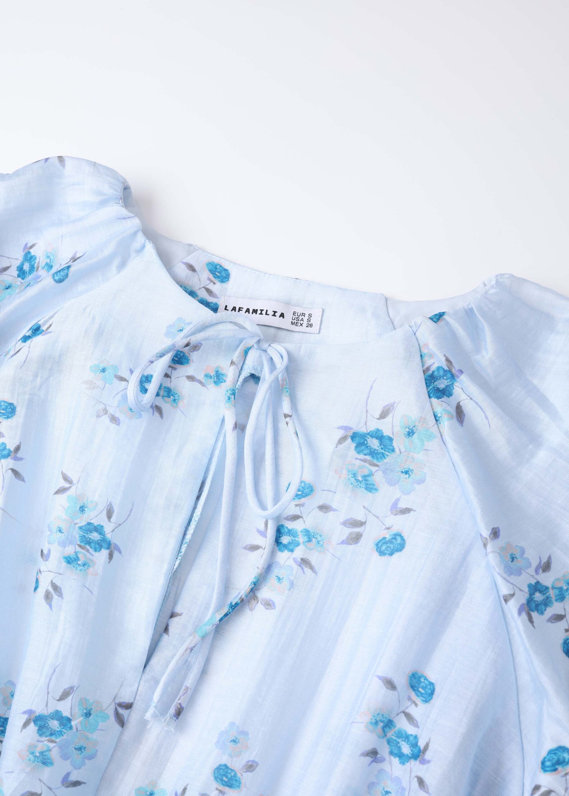 Women blouse, floral, smock design, round neck with front tie, short sleeves with elastic cuff, unique and modern