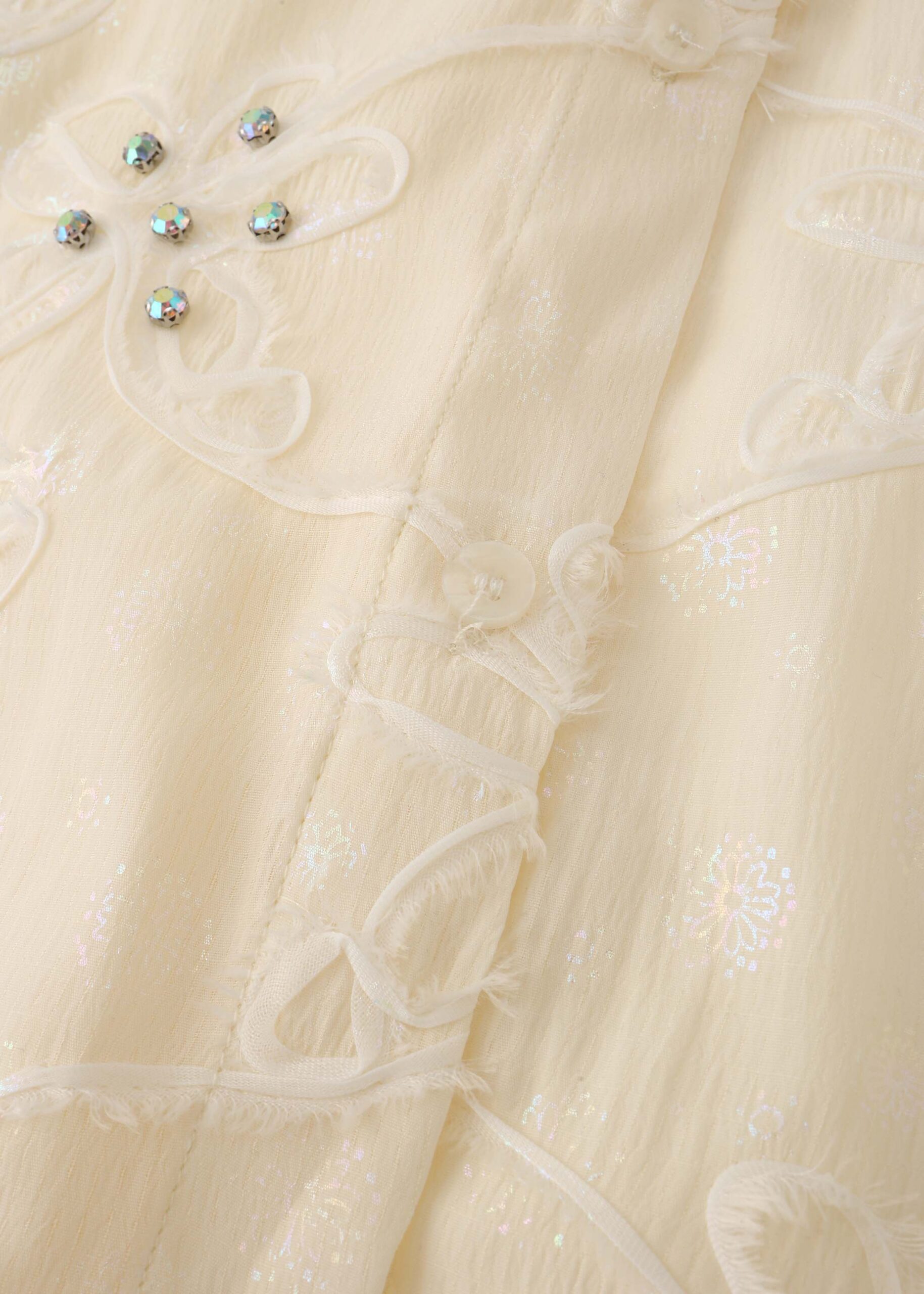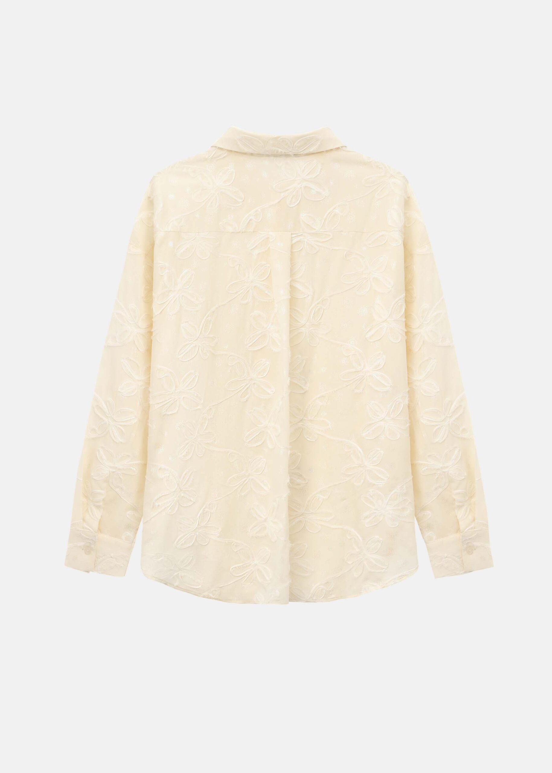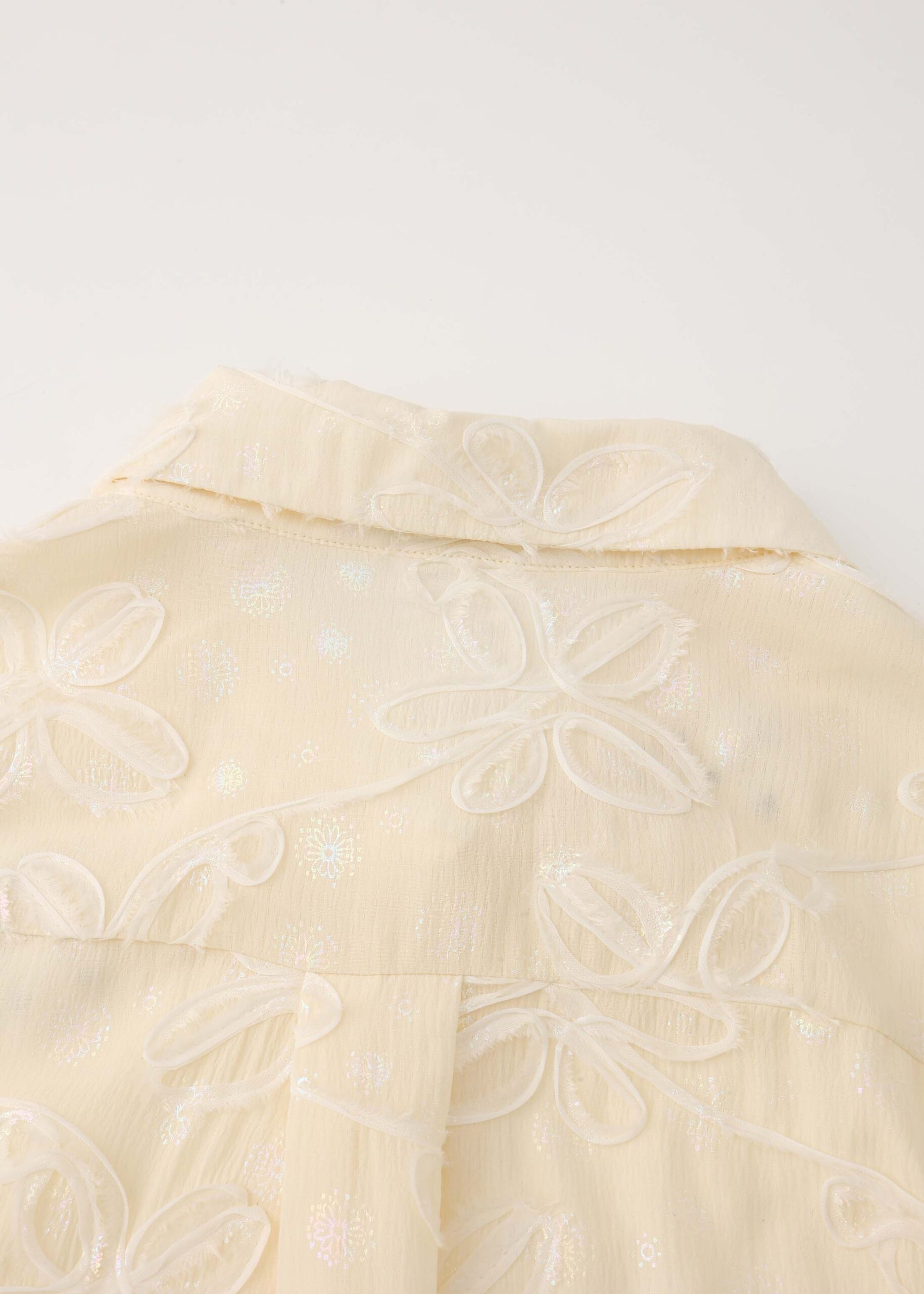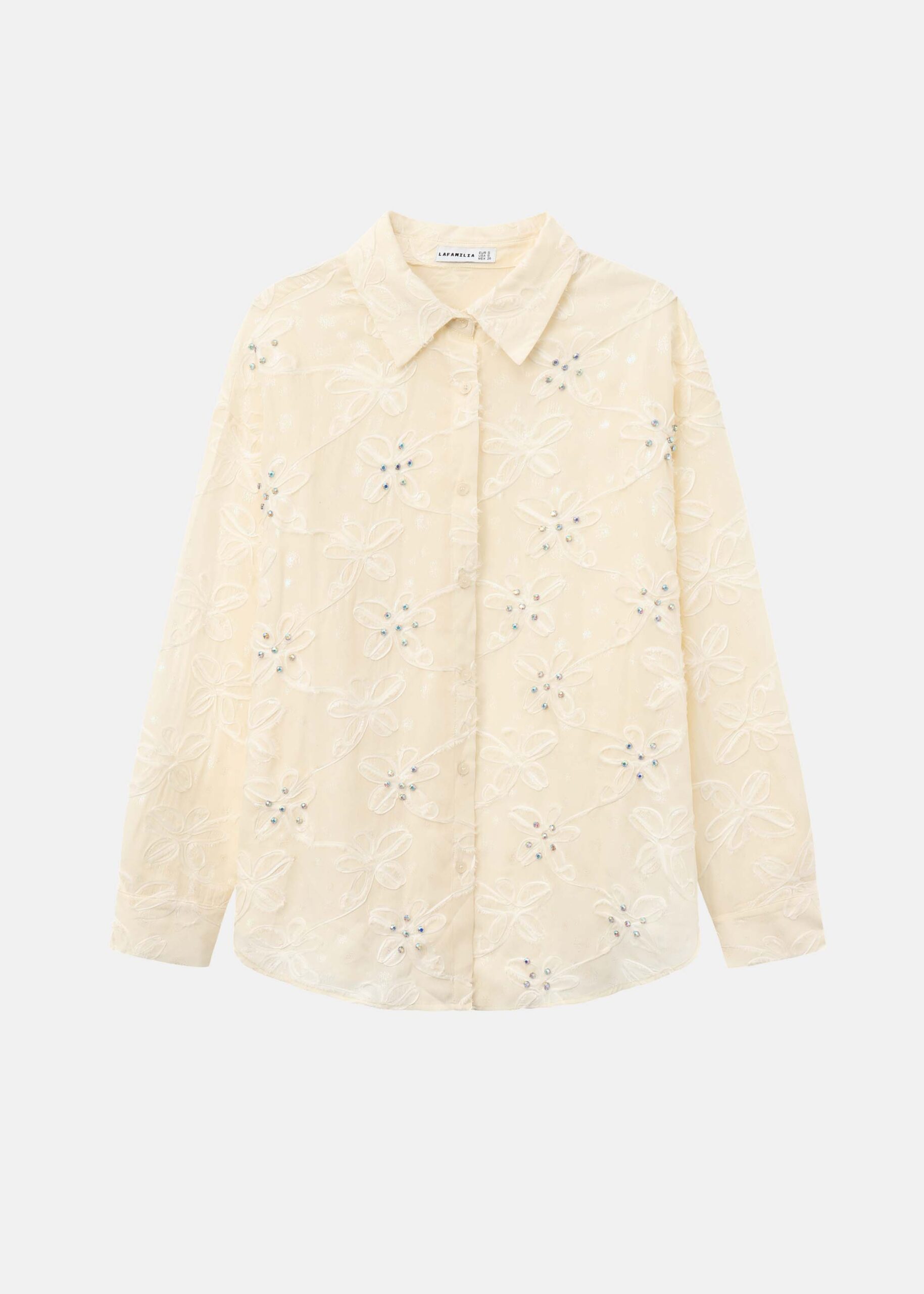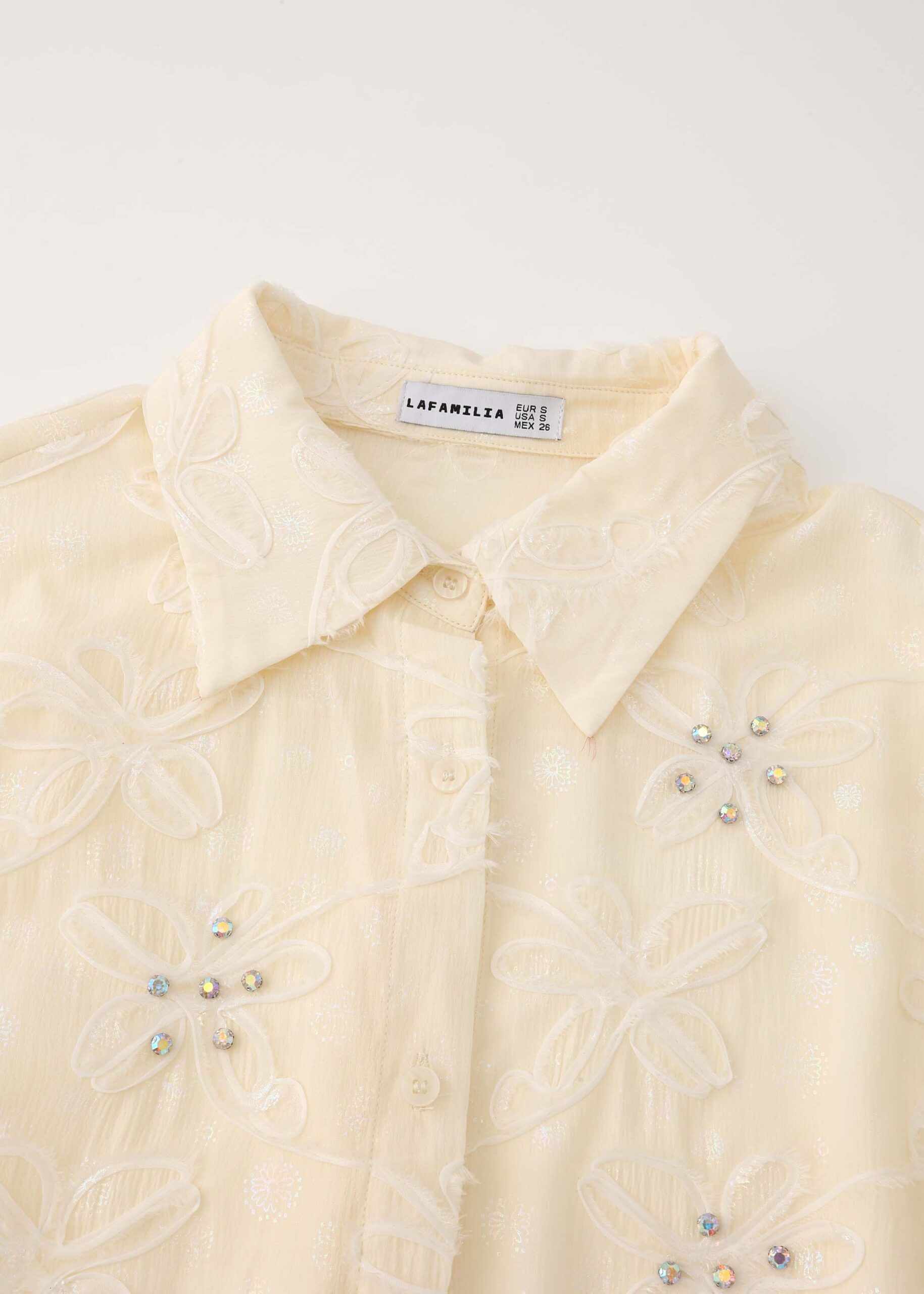 Women shirt, floral, strass decor, front buttons to close, long sleeves with tight cuff, rolled collar with front button, unique and modern