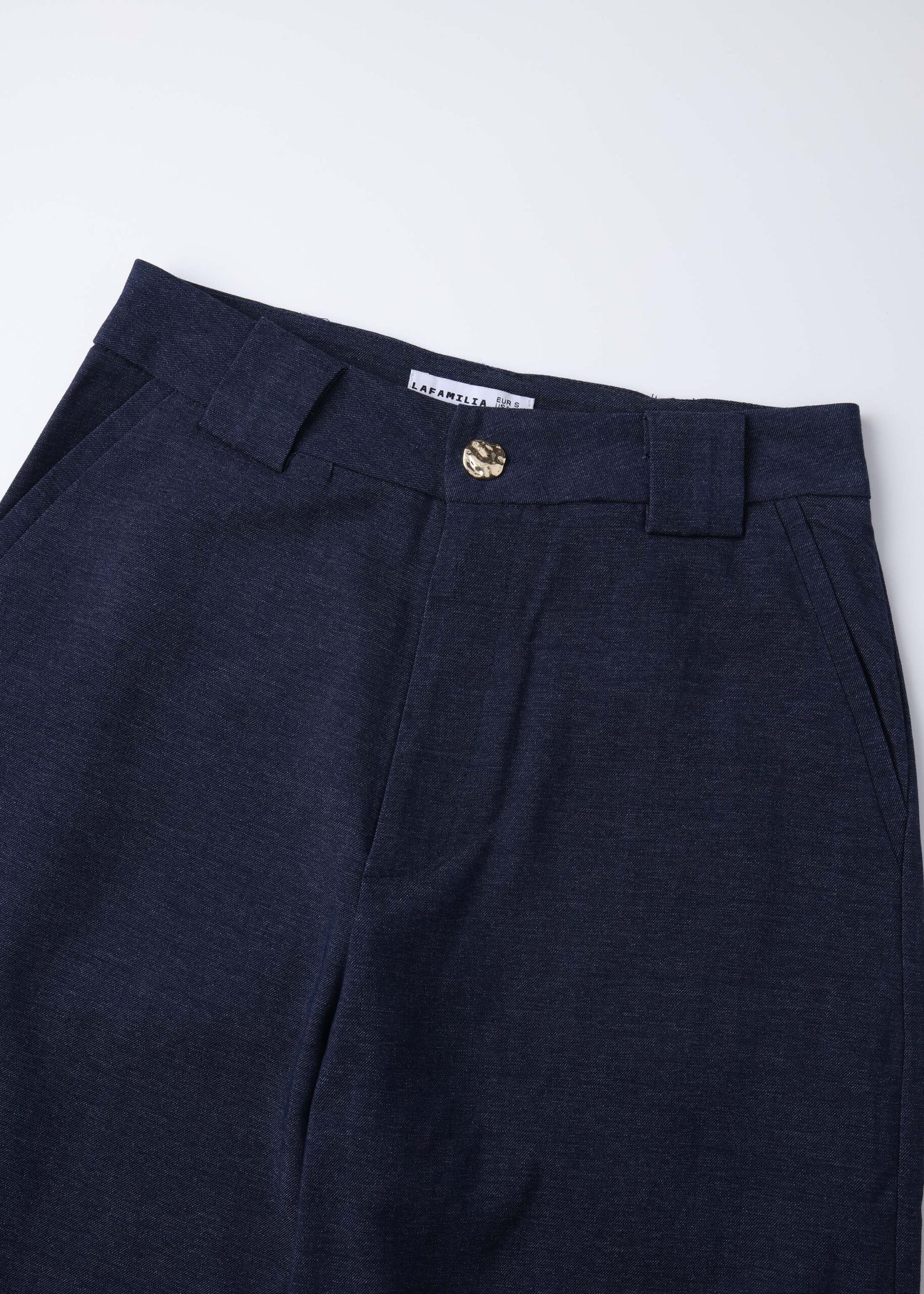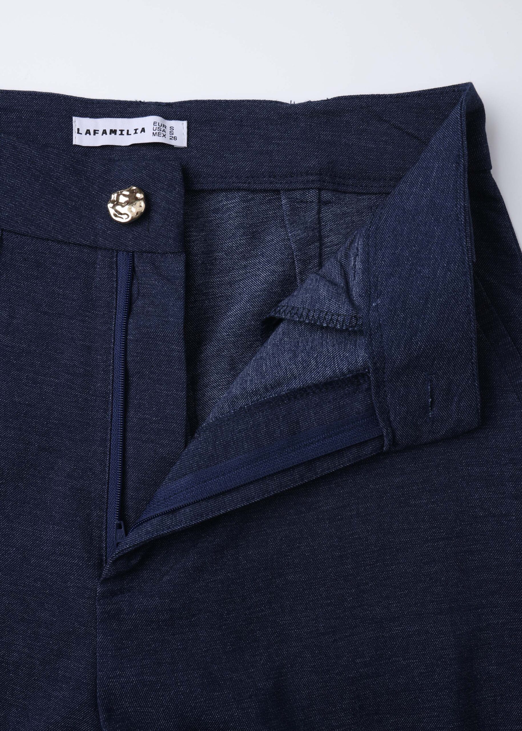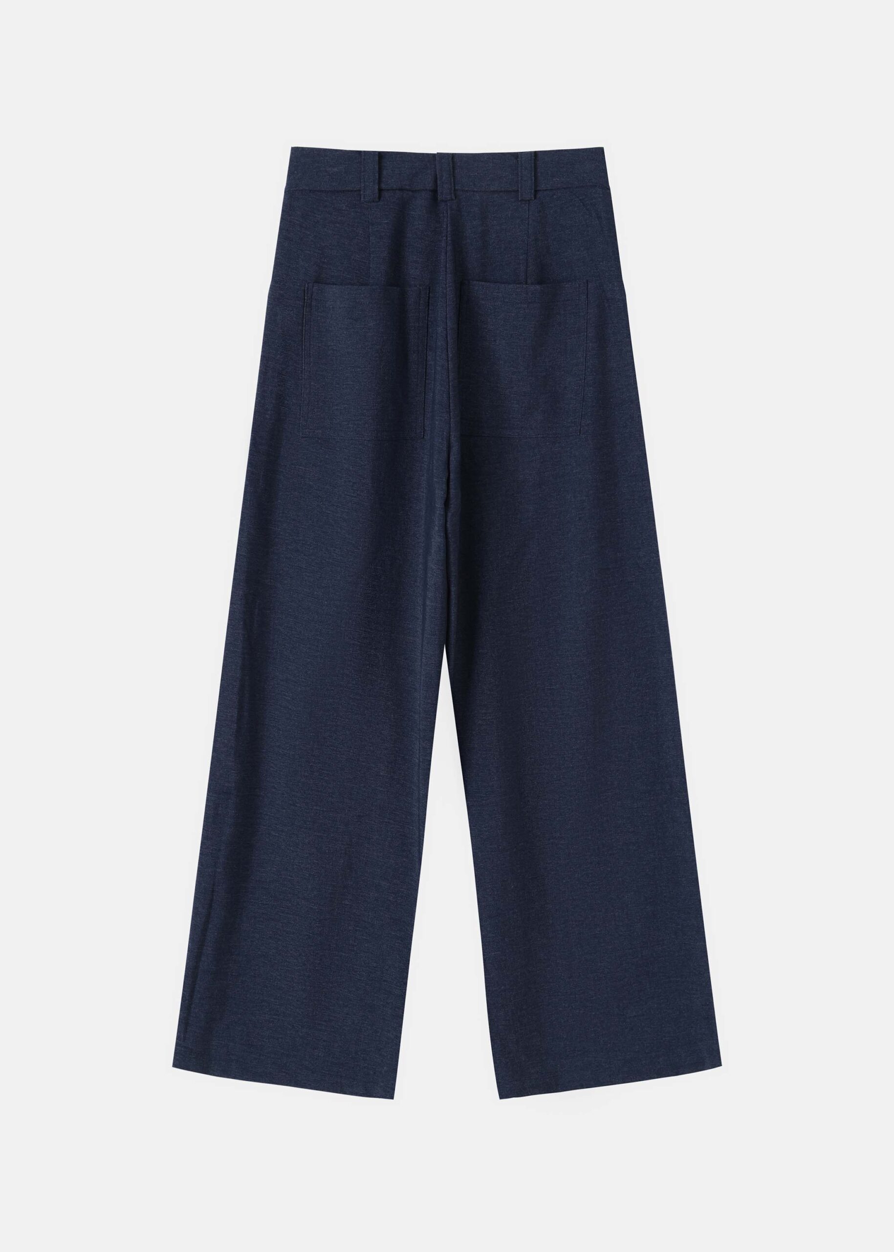 Women trouser, high-waist, wide-leg, front button and zipper closure, front and back pockets, unique and modern