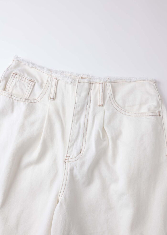 Women trouser, jeans, frayed waist, front metal buckle and zipper closure, front and back pockets, unique and modern