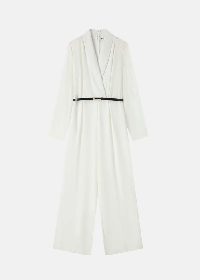 Women jumpsuit, lapel collar, back zipper closure, long sleeves, waist belt, wide-leg trouser, pleats from the front, unique and modern