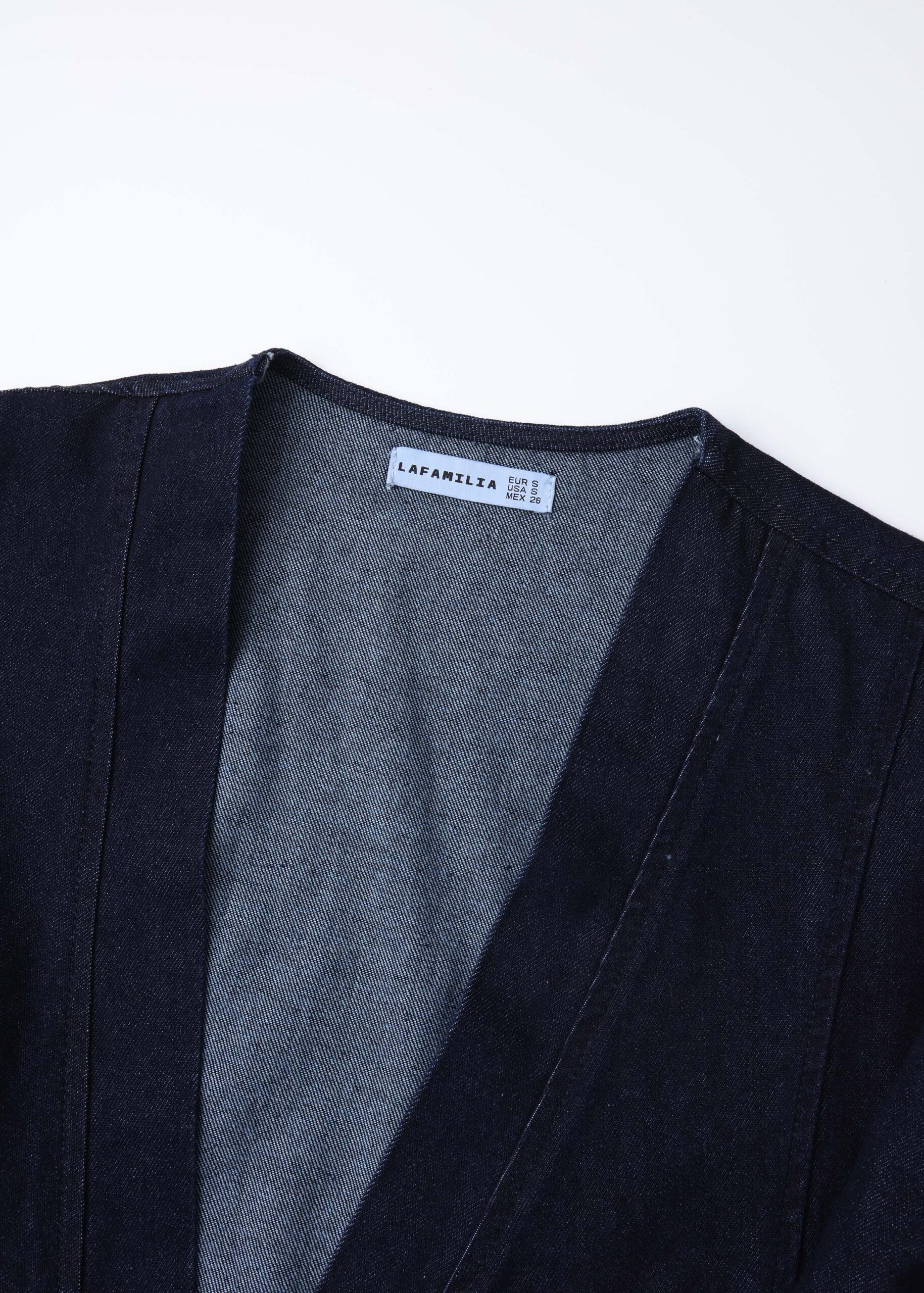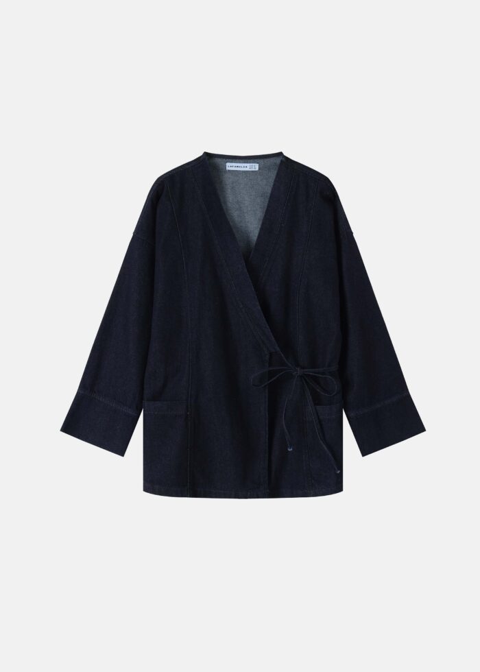 Women cardigan, jeans, Kimono design, wrap from the front with side tie, long sleeves, front pockets, V neck, unique and practical
