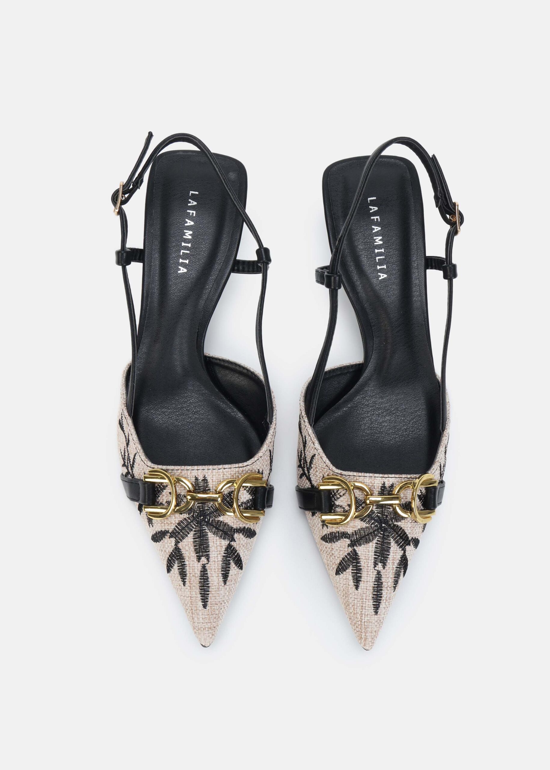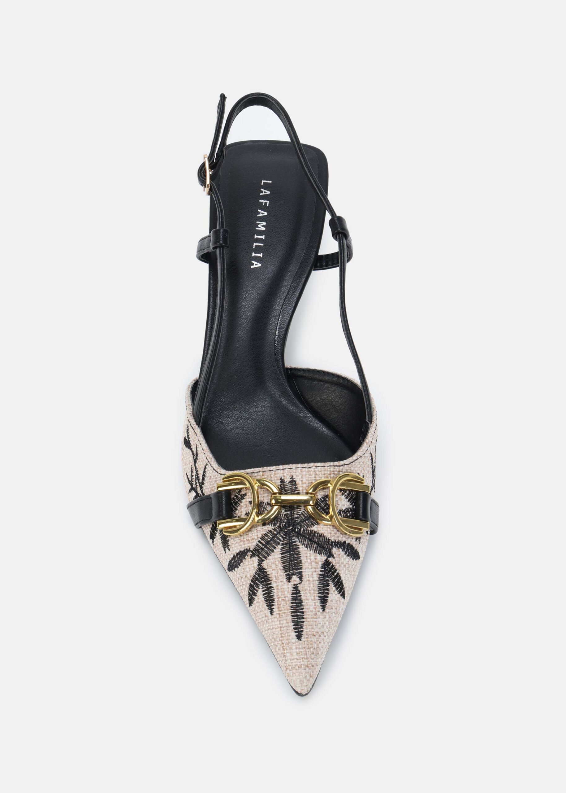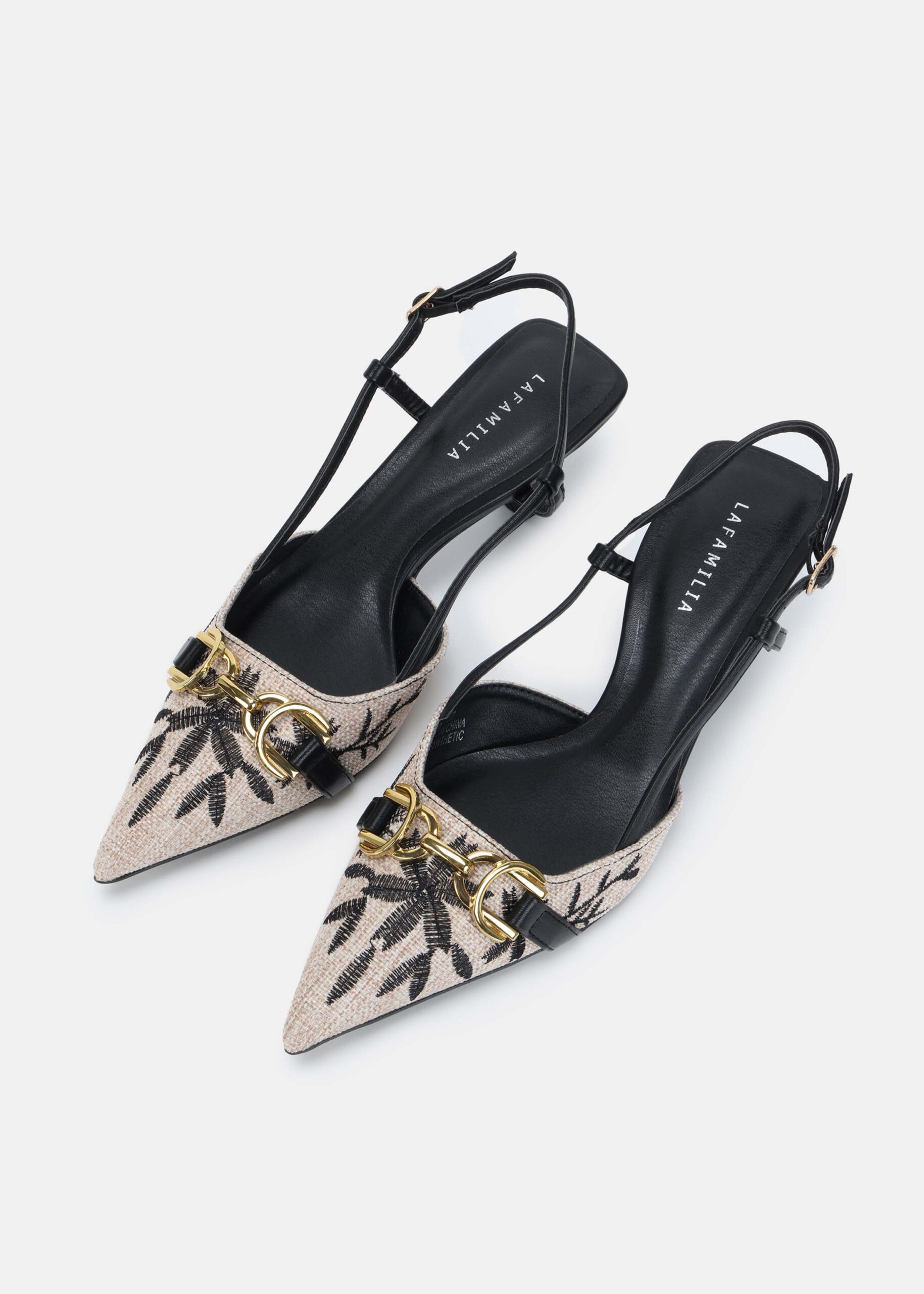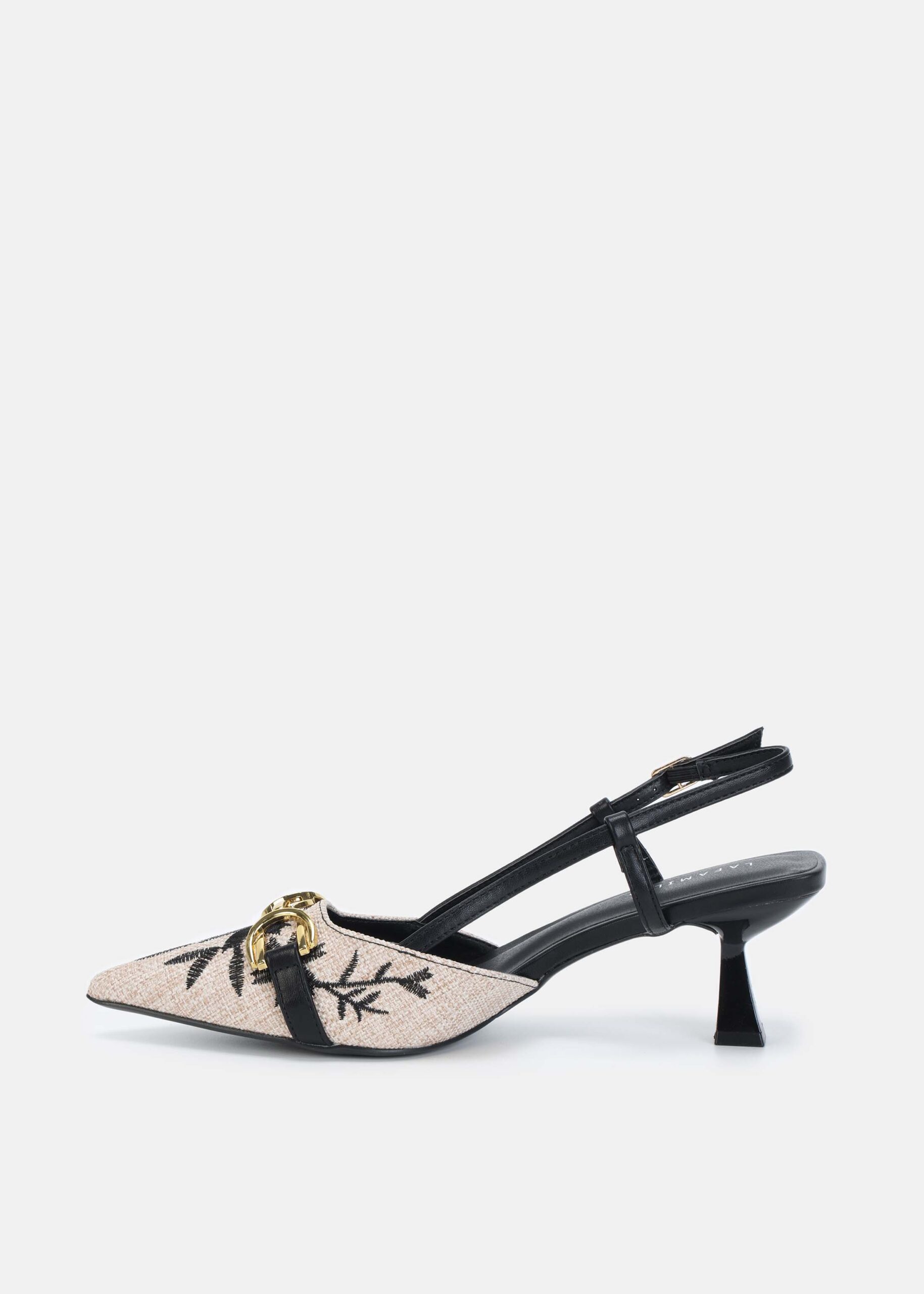 Women sandal, knitted fabric with embroidery decor, point toe, upper chain decor, kitten heels, ankle strap with side buckle, unique and modern