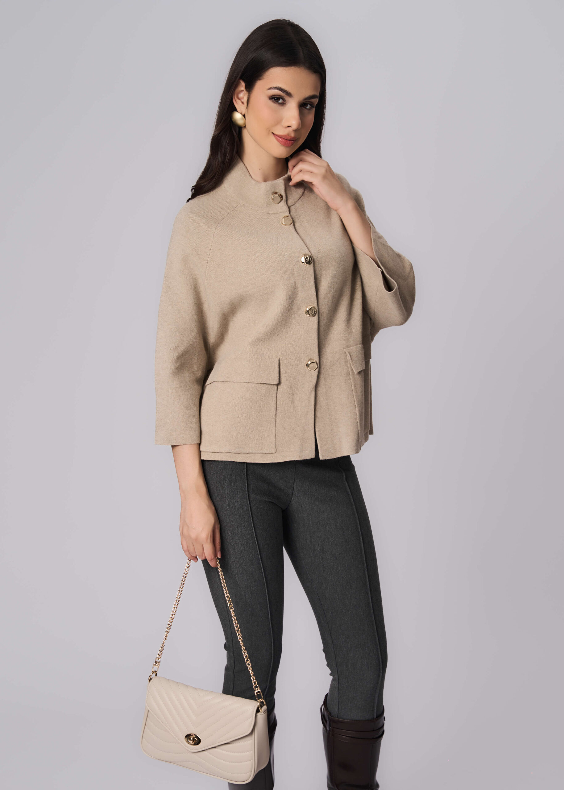 Women jacket, knitted fabric, plain, round neck, front buttons to close, front pockets, long wide sleeves, unique and warm