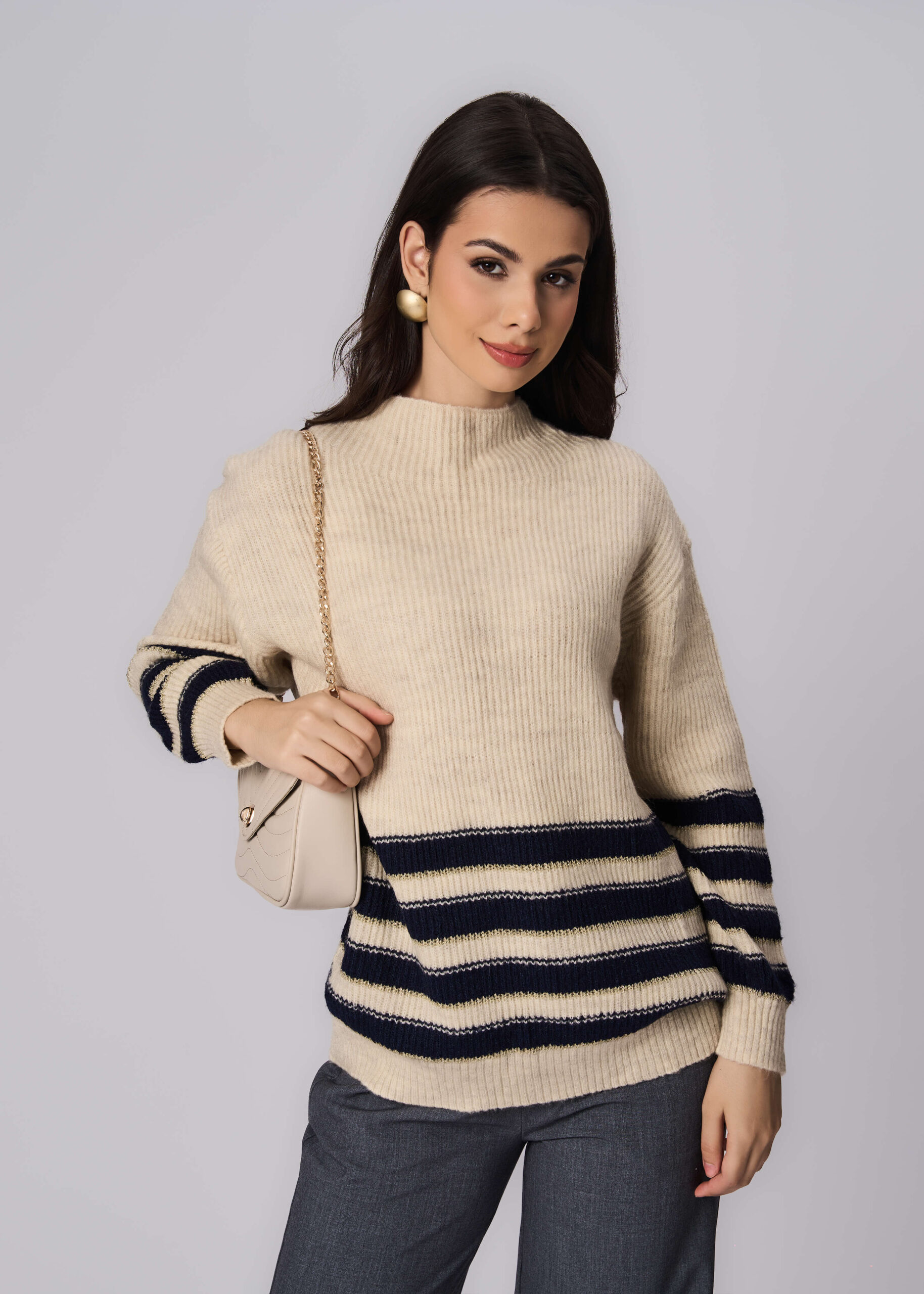 Women blouse, knitted fabric, striped, round neck, long sleeves, unique and warm