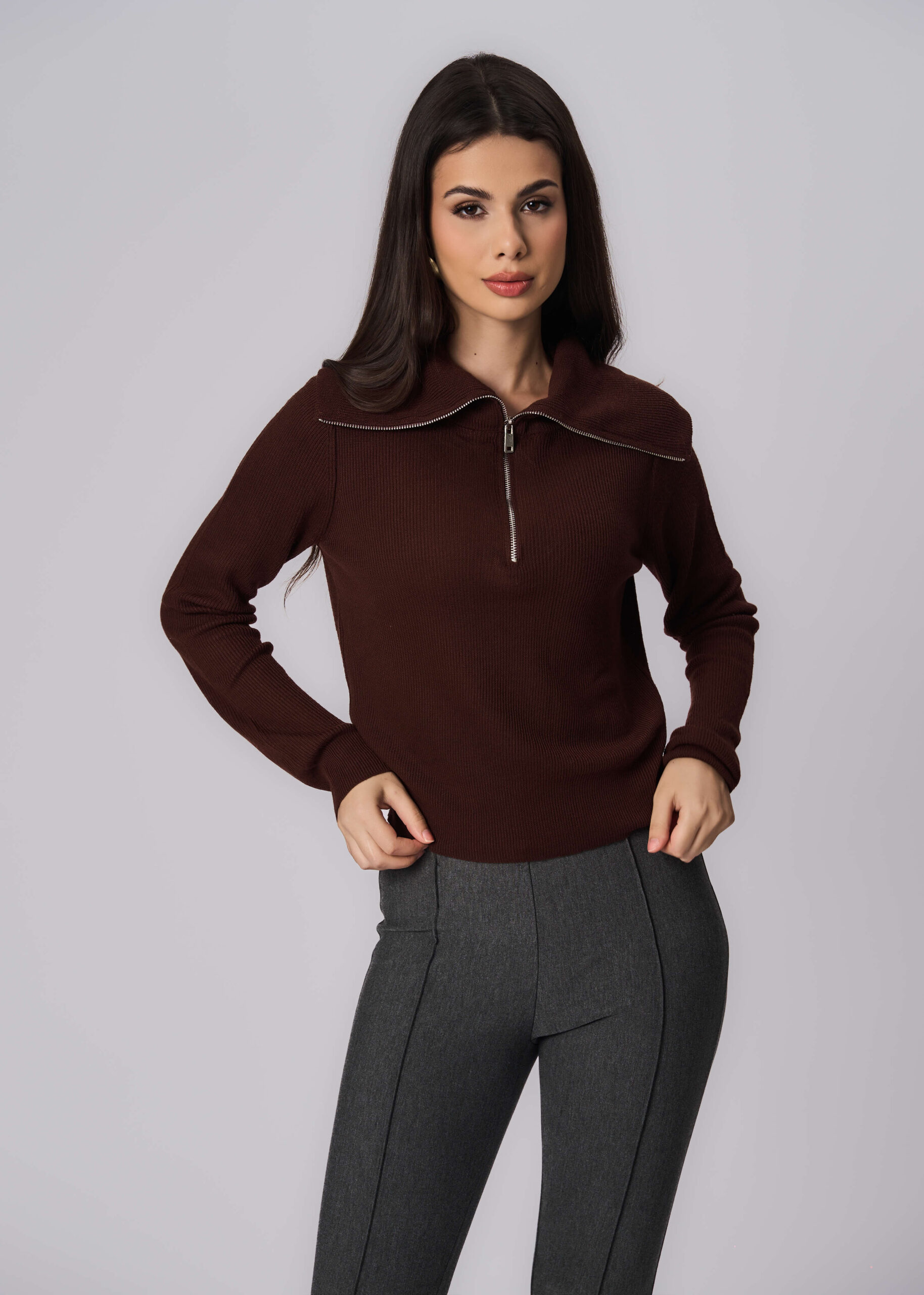 Women blouse, knitted striped fabric, rolled collar with front zipper closure, long sleeves with tight cuff, practical and warm