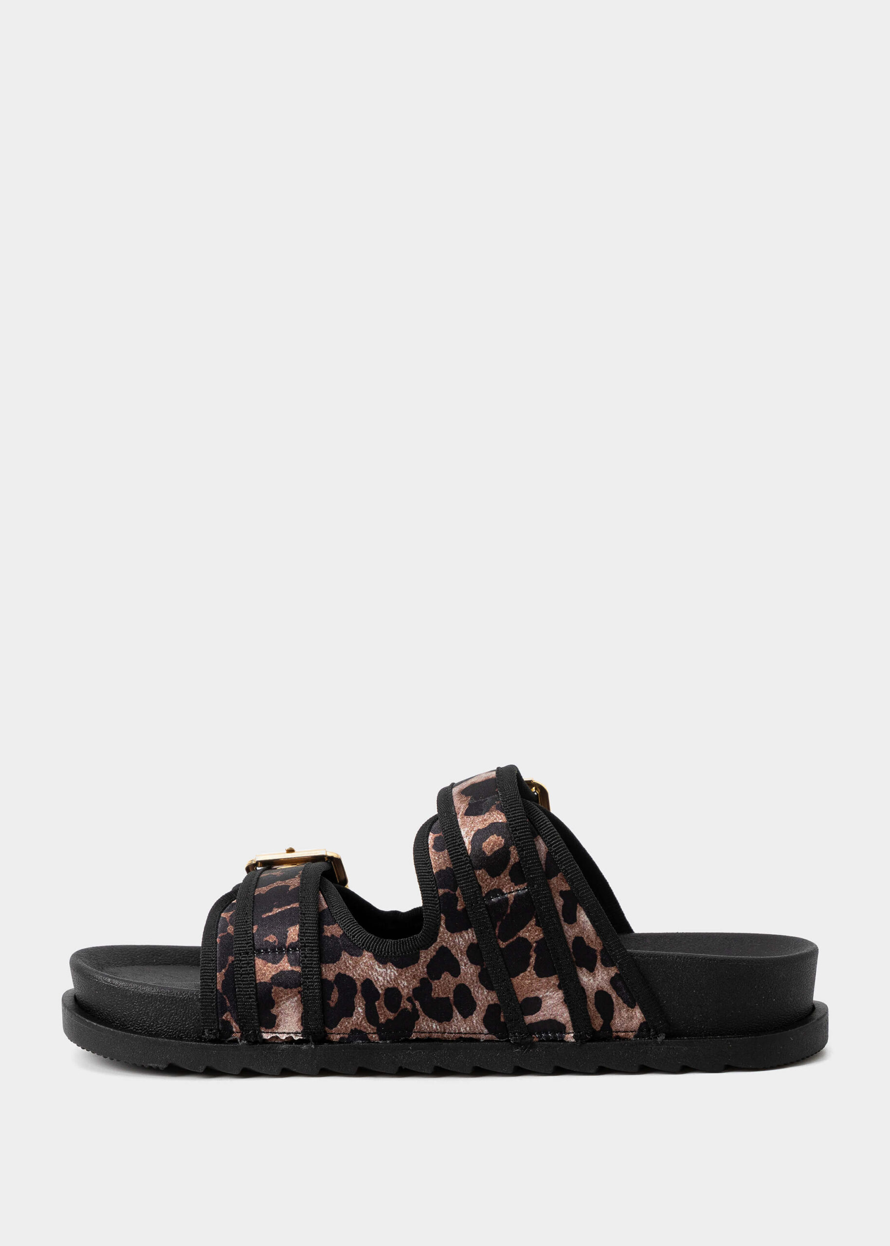 Women slipper, leather and fabric, flat, open round toe, upper straps, unique and practical
