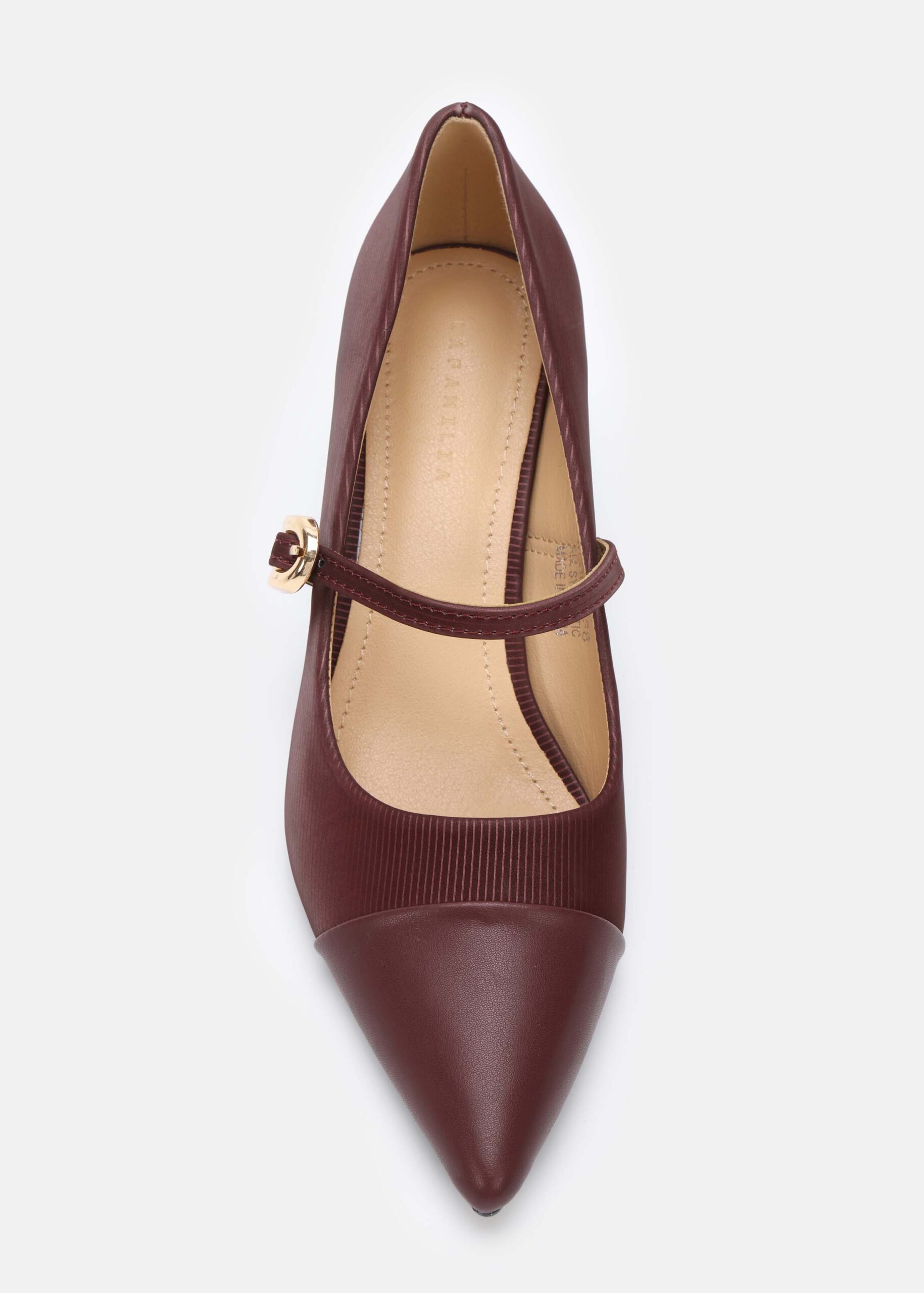 Women shoes, leather and striped fabric, heels, point toe, upper strap with side buckle, unique and modern